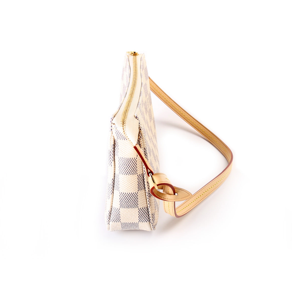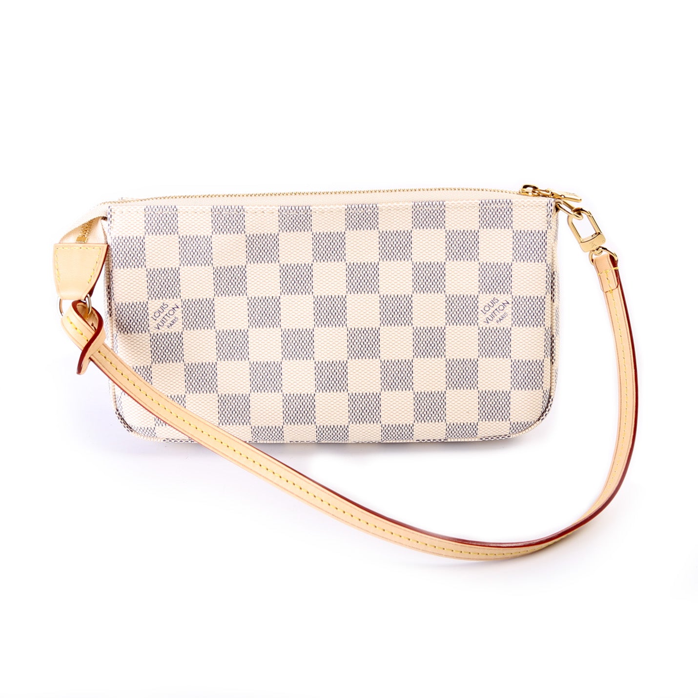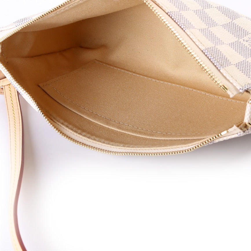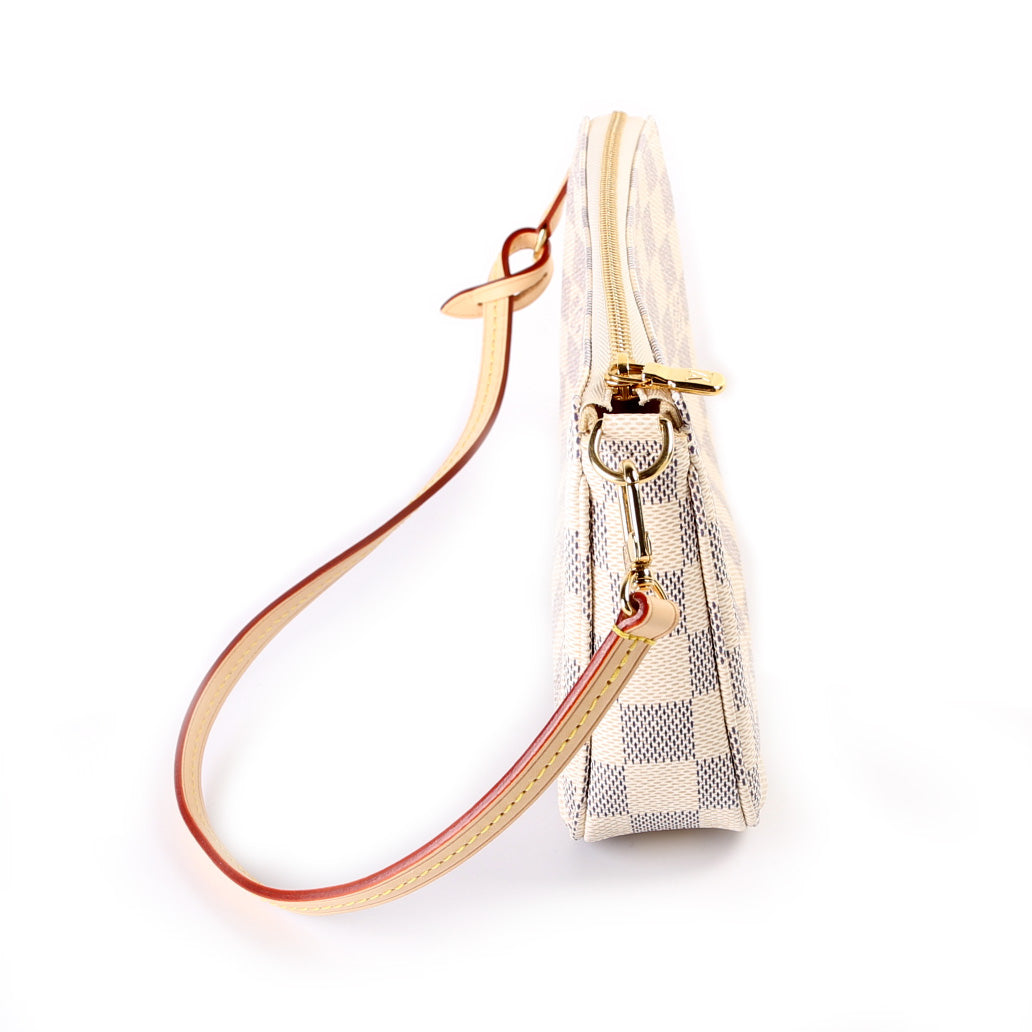 This pre-owned Louis Vuitton Pochette Accessories is guaranteed 100% authentic. The exterior is in the classic Damier Azur coated canvas.