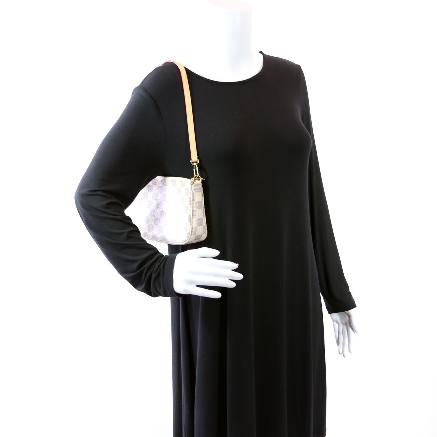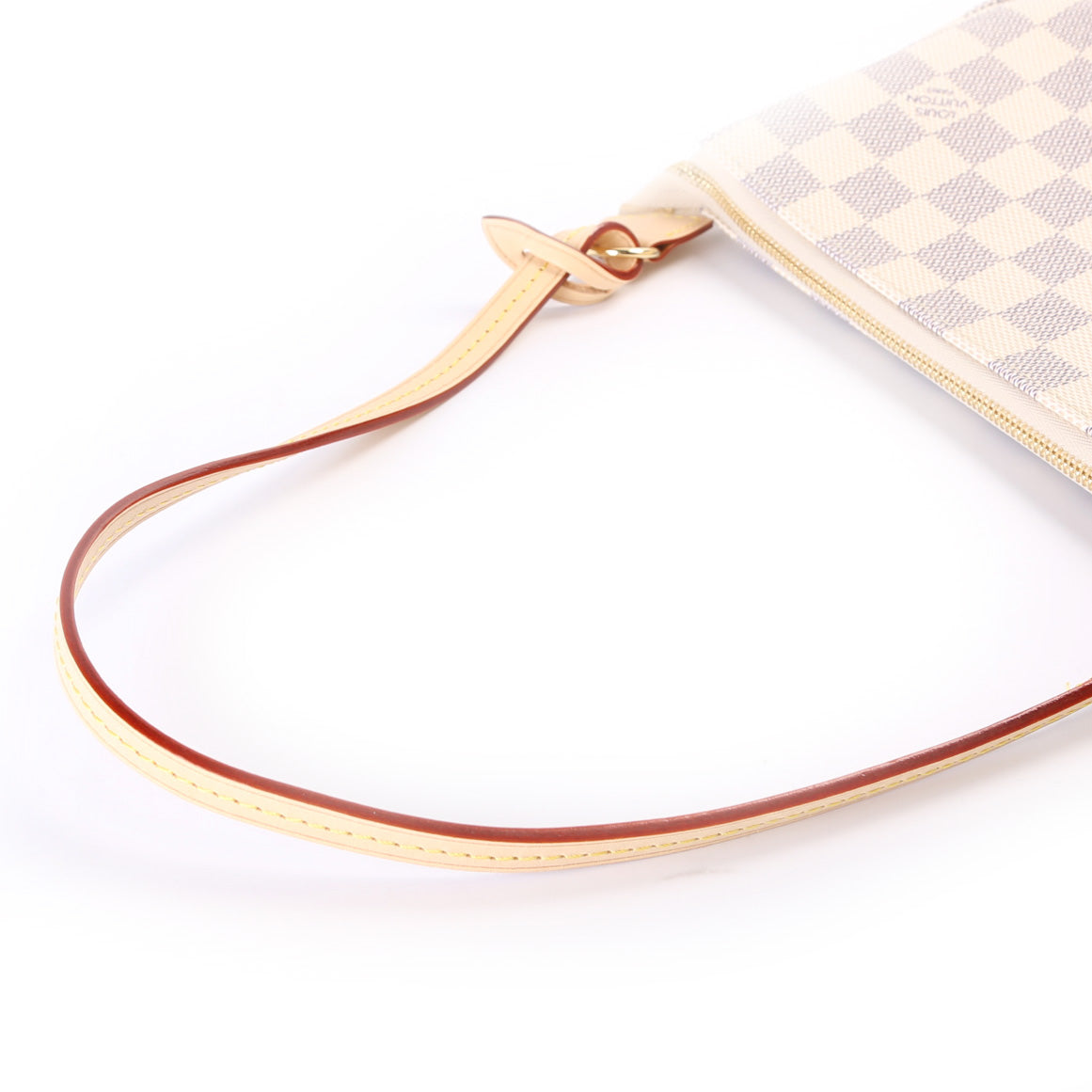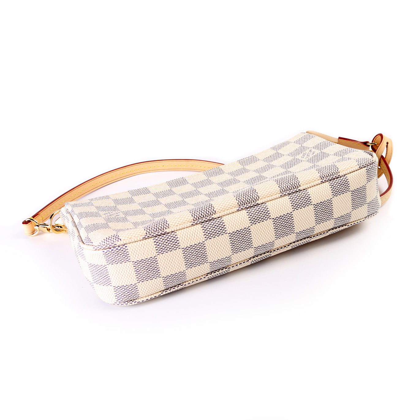 This pre-owned Louis Vuitton Pochette Accessories is guaranteed 100% authentic. The exterior is in the classic Damier Azur coated canvas.