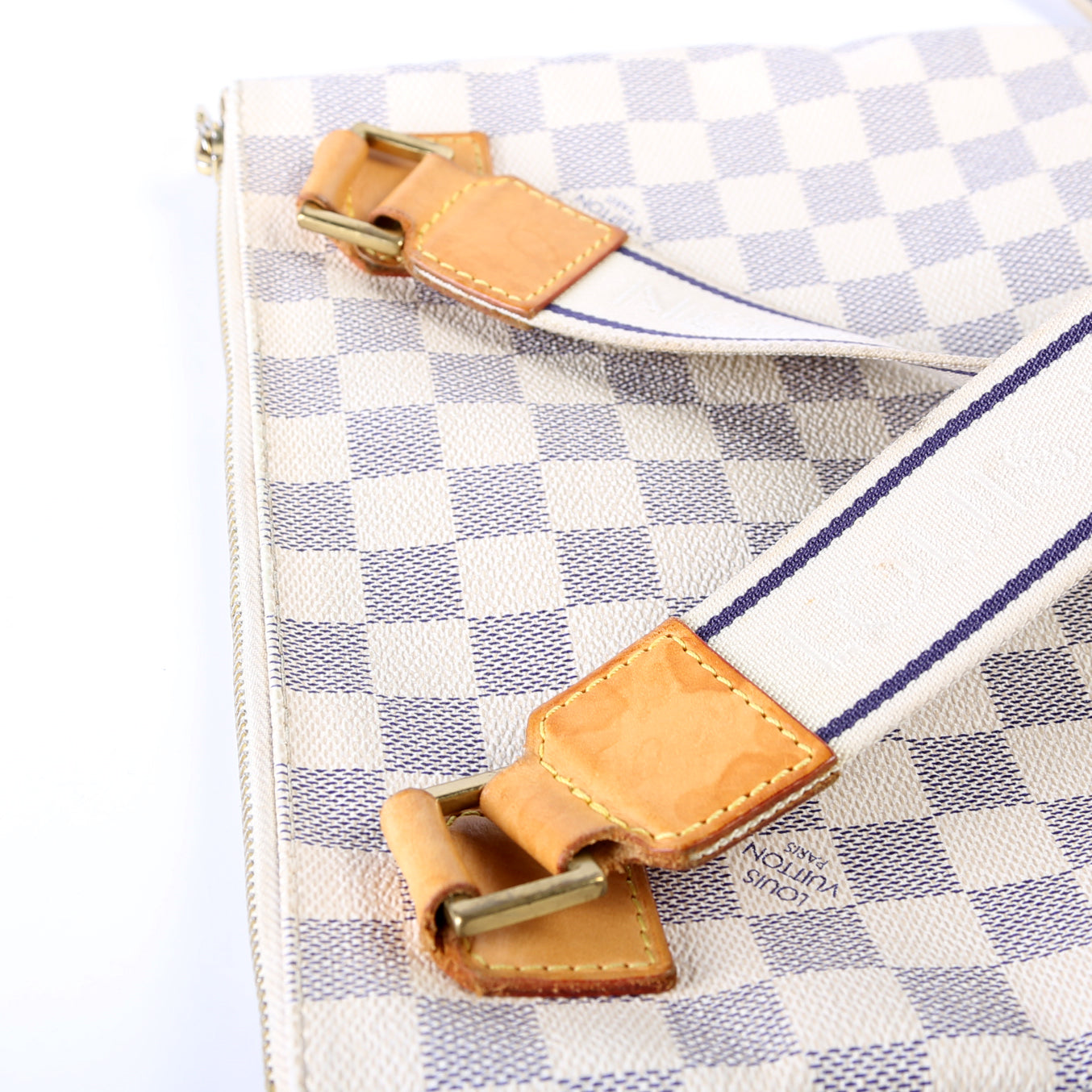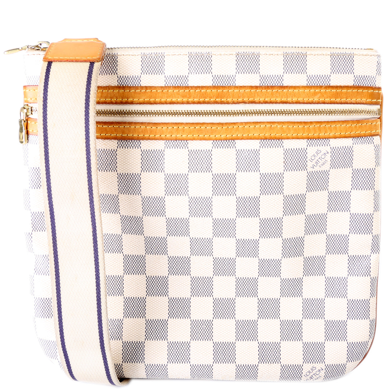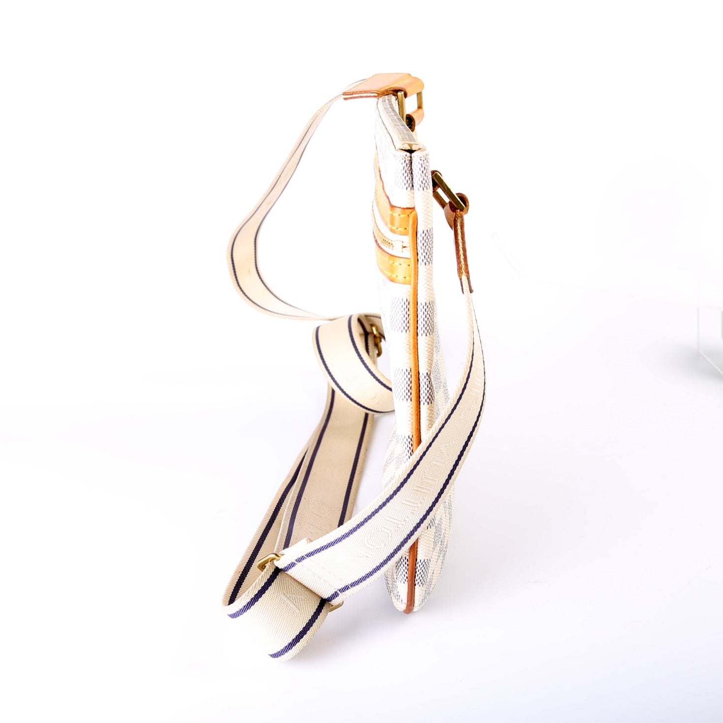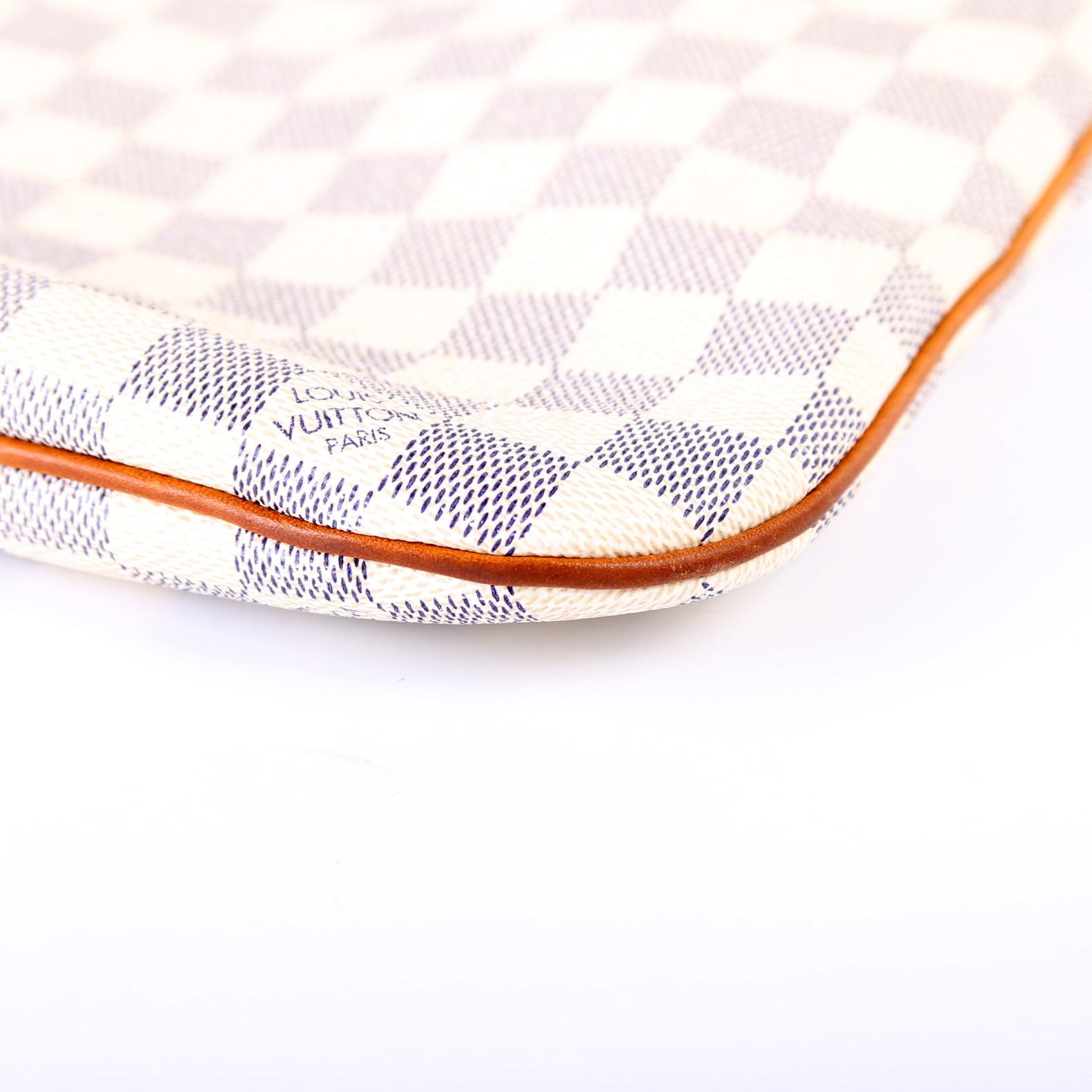This pre-owned Louis Vuitton Pochette Bosphore is guaranteed 100% authentic. The exterior is in the classic Louis Vuitton Damier Azur coated canvas.
