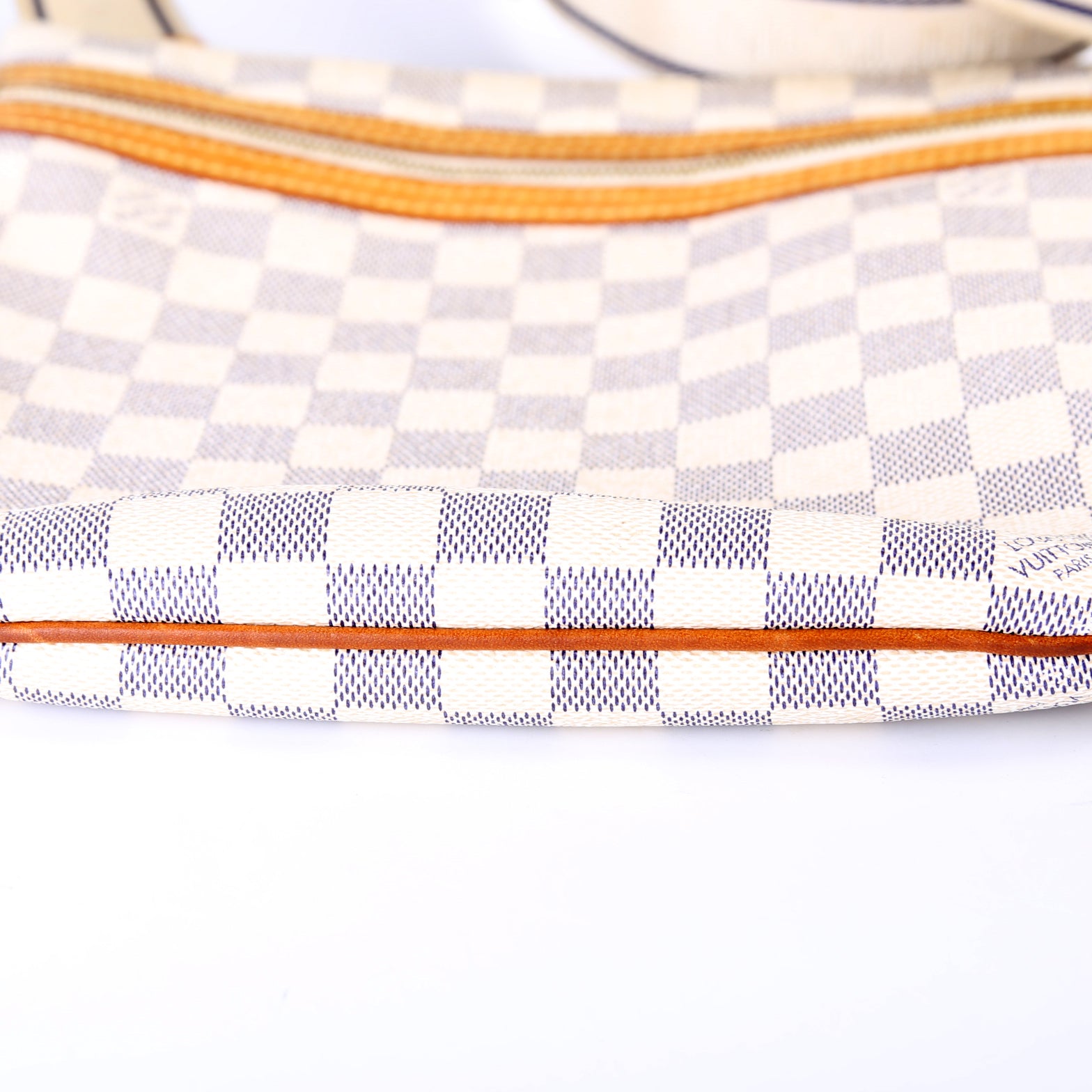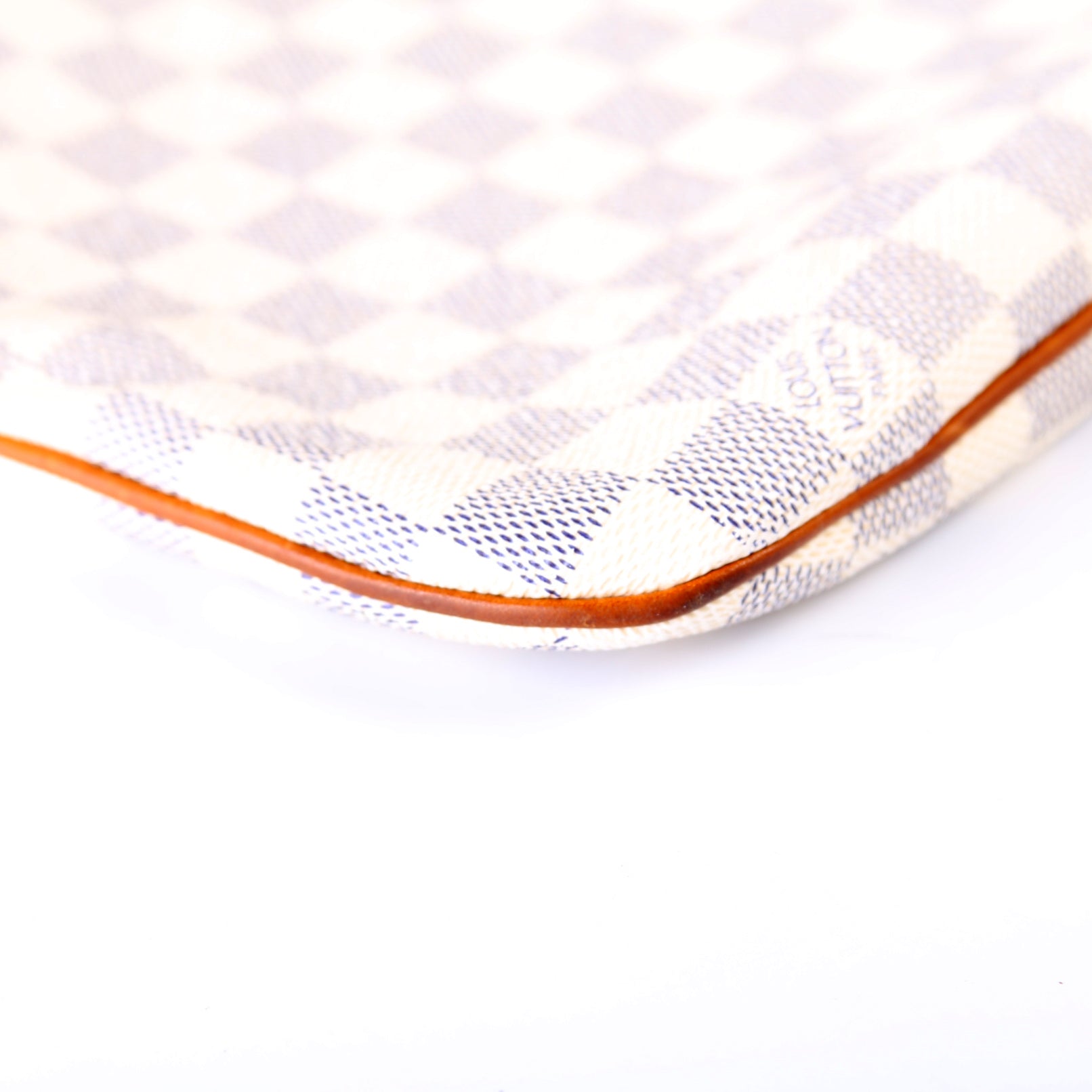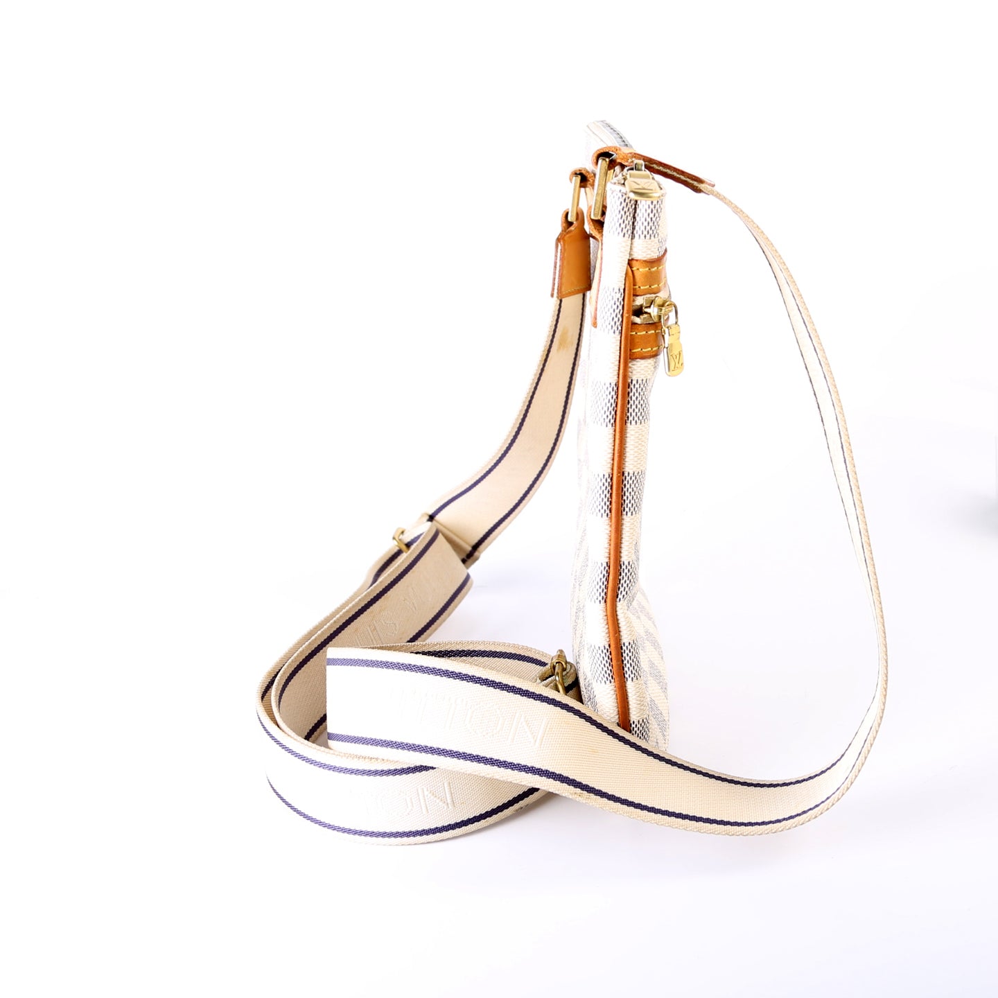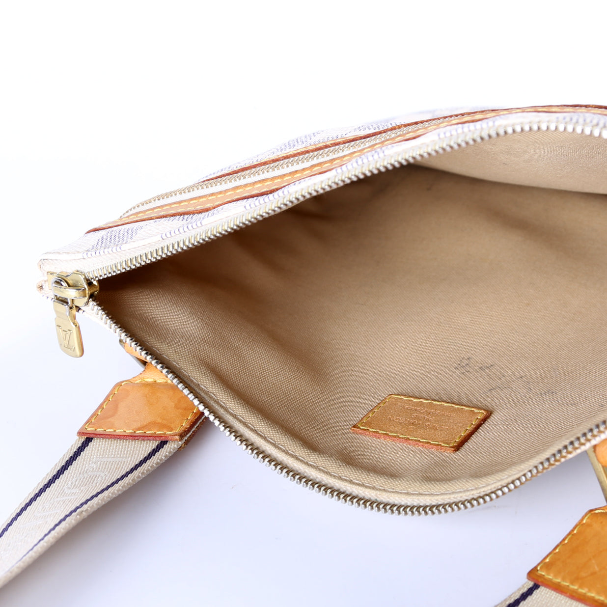 This pre-owned Louis Vuitton Pochette Bosphore is guaranteed 100% authentic. The exterior is in the classic Louis Vuitton Damier Azur coated canvas.