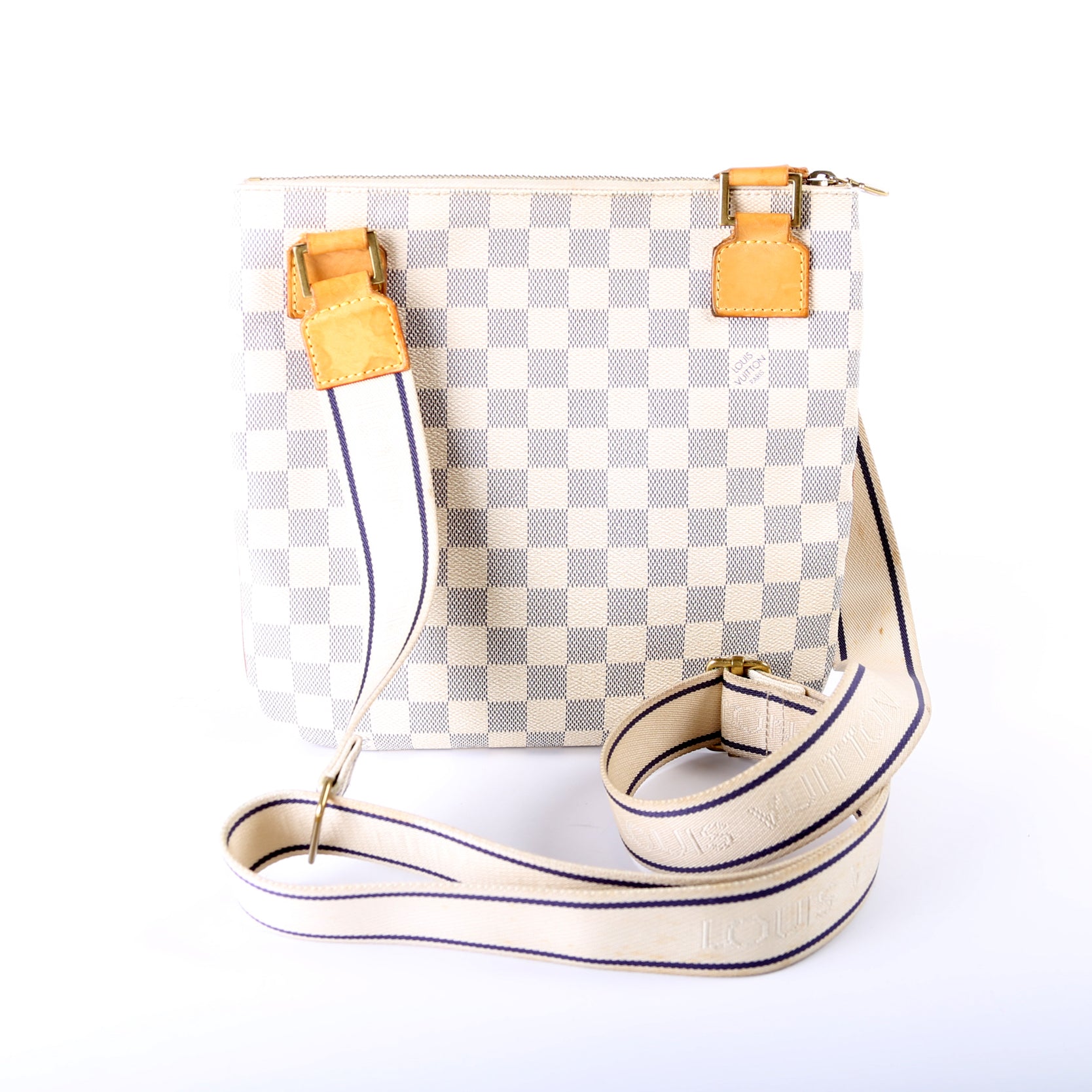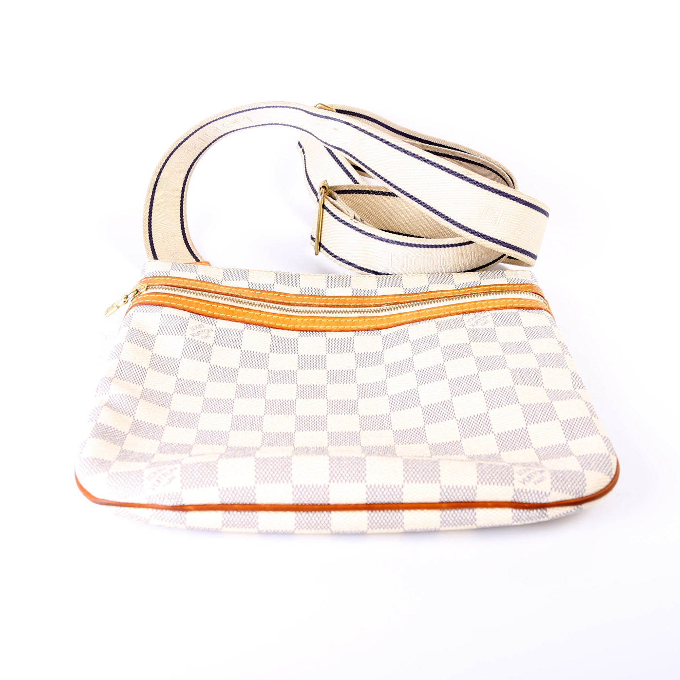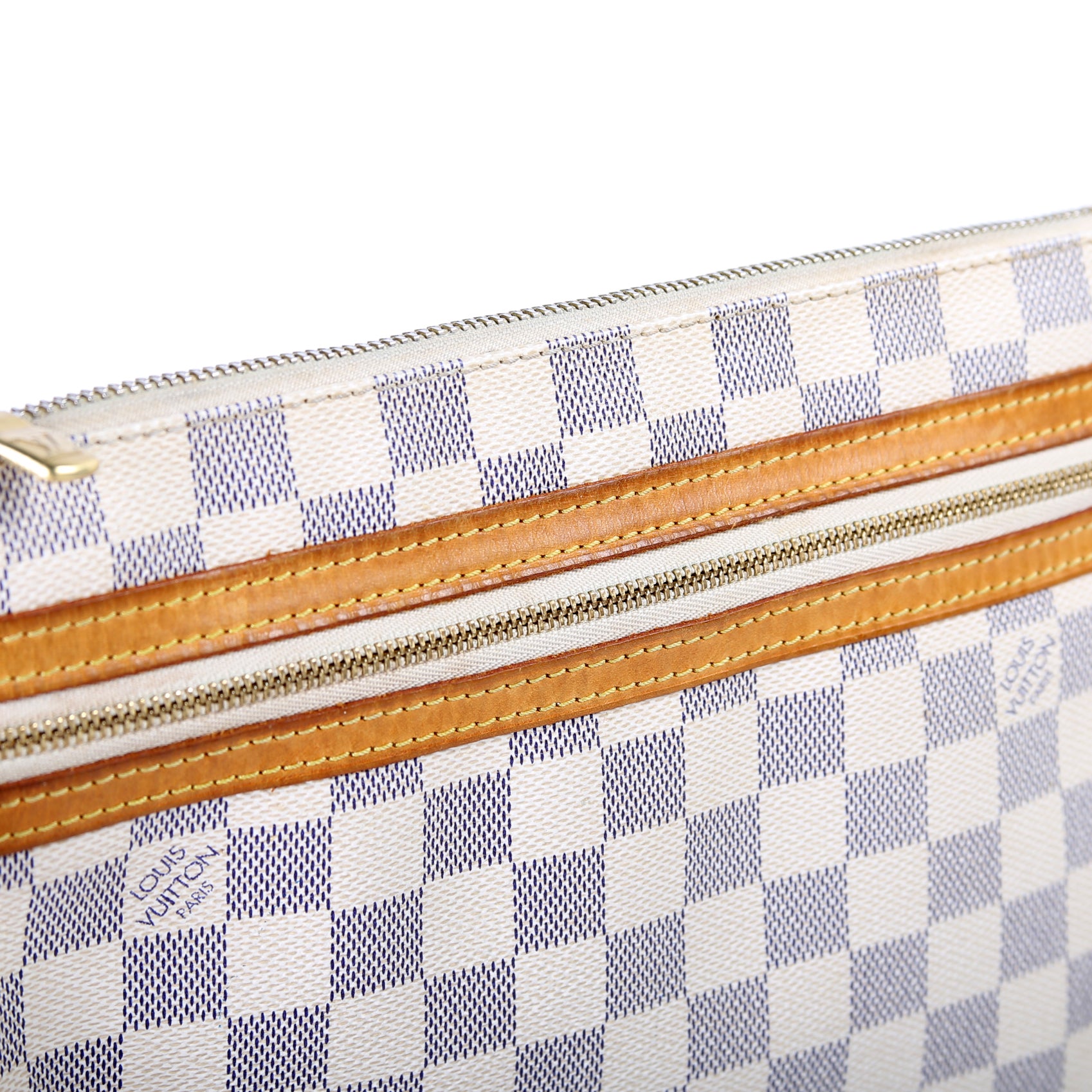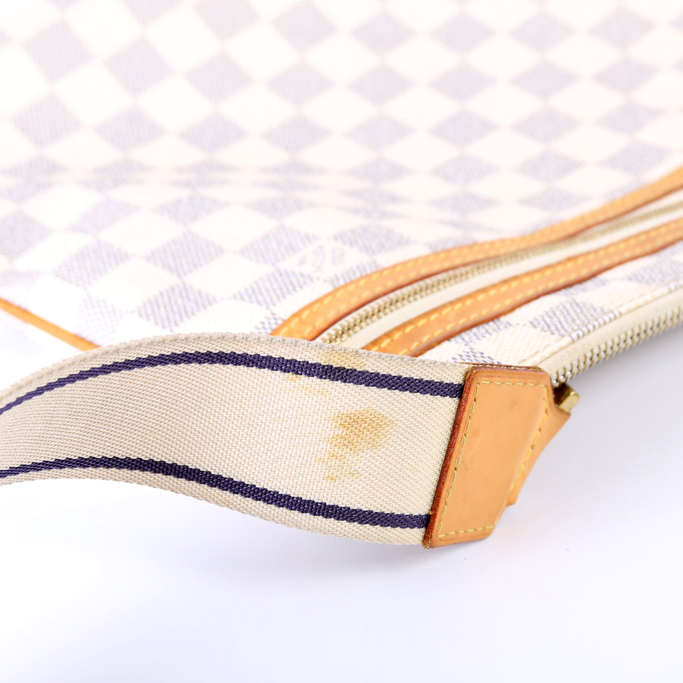 This pre-owned Louis Vuitton Pochette Bosphore is guaranteed 100% authentic. The exterior is in the classic Louis Vuitton Damier Azur coated canvas.