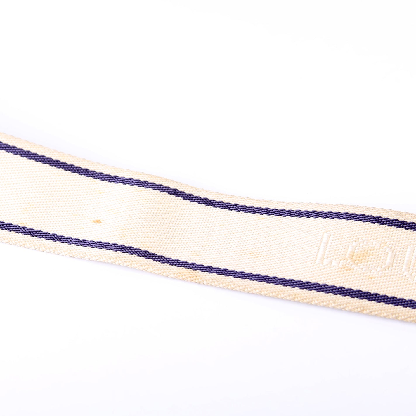 Strap: The shoulder strap shows minor staining and discoloration throughout. The leather tabs show minor wear and water staining. The pipping shows minor wear.