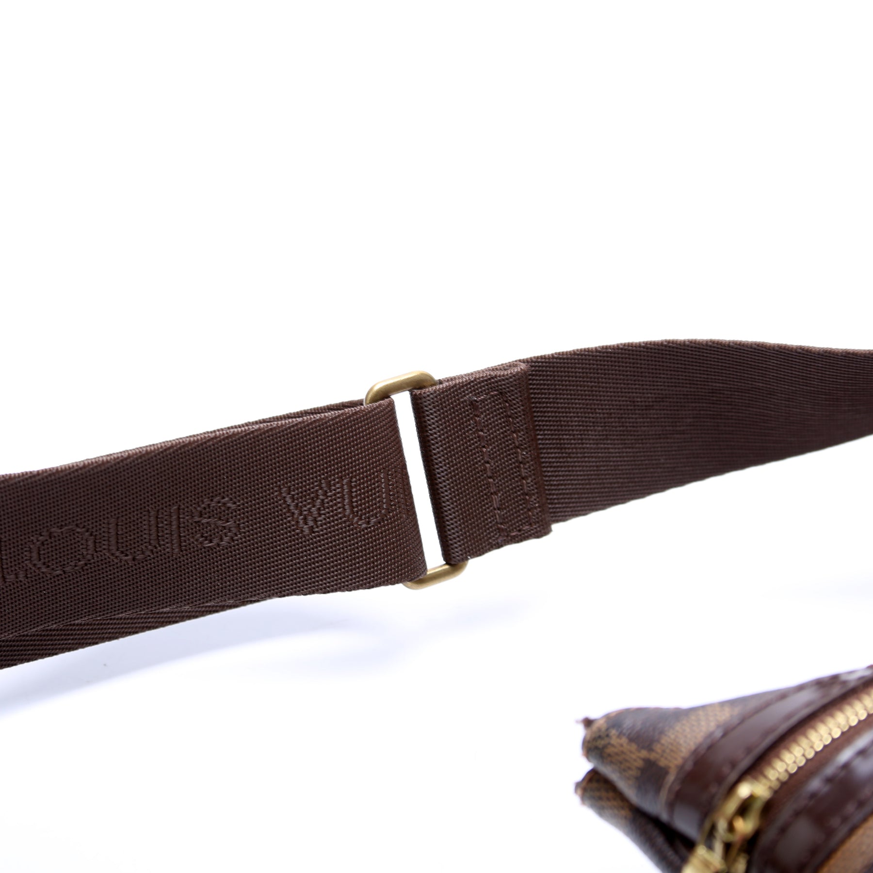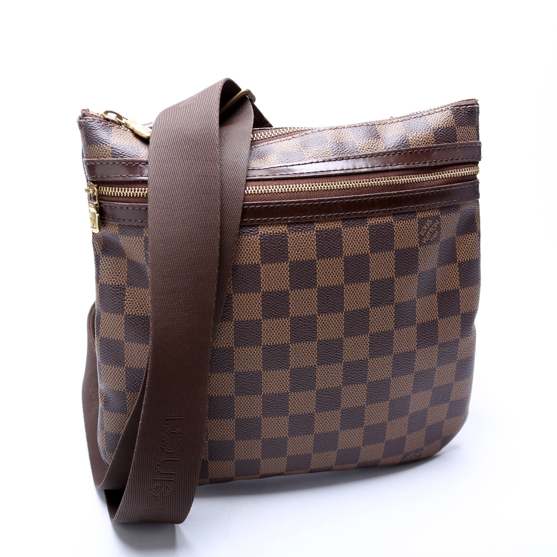 This pre-owned Louis Vuitton Pochette Bosphore is guaranteed 100% authentic. The exterior is in the classic Louis Vuitton Damier Ebene coated canvas.