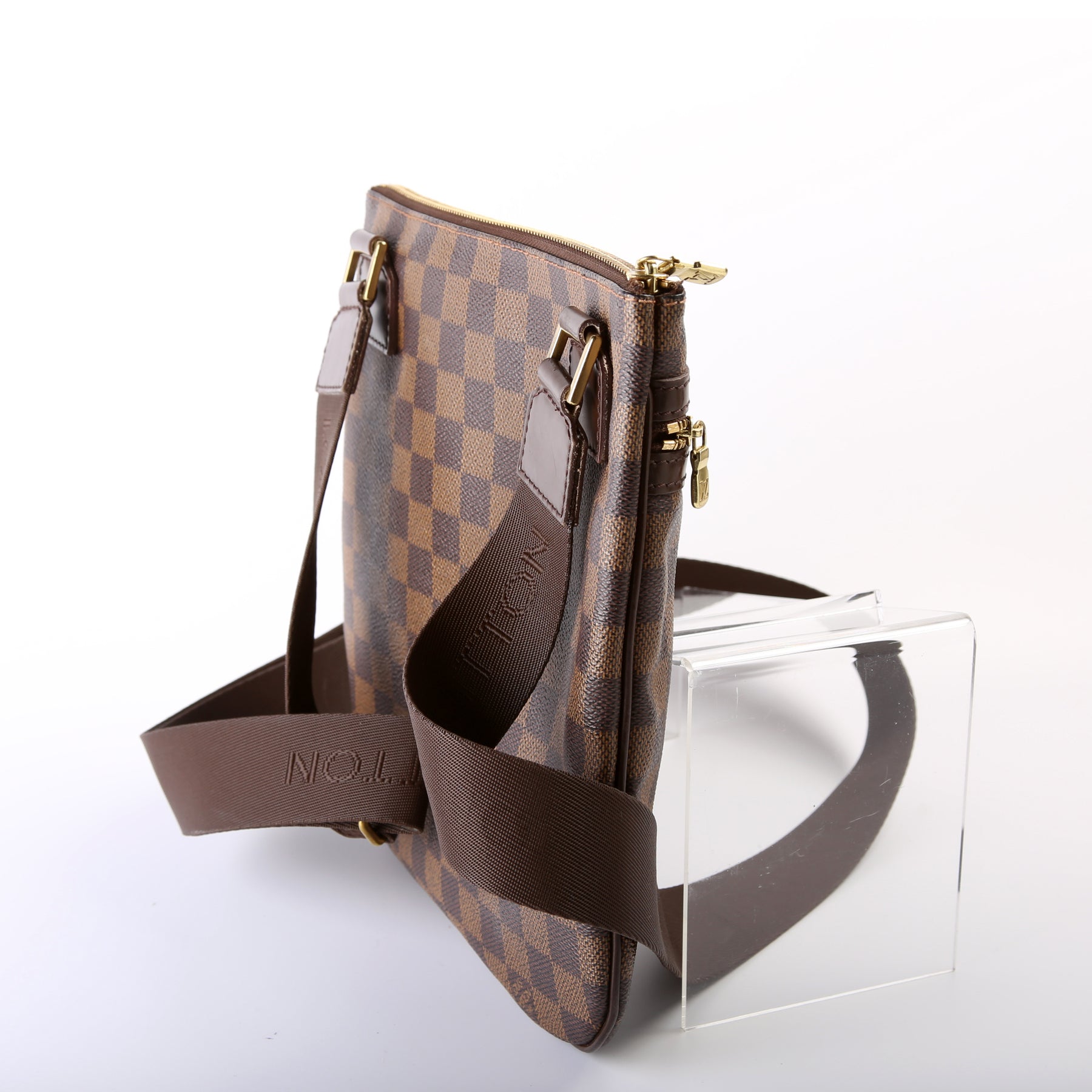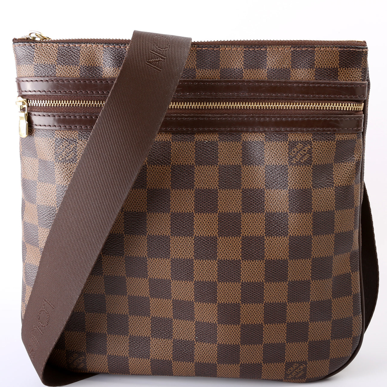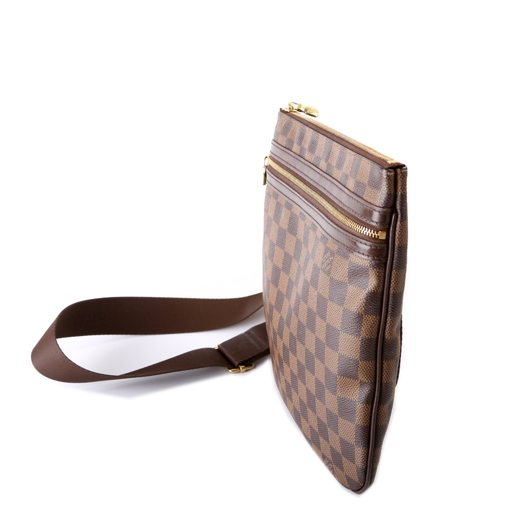 This pre-owned Louis Vuitton Pochette Bosphore is guaranteed 100% authentic. The exterior is in the classic Louis Vuitton Damier Ebene coated canvas.