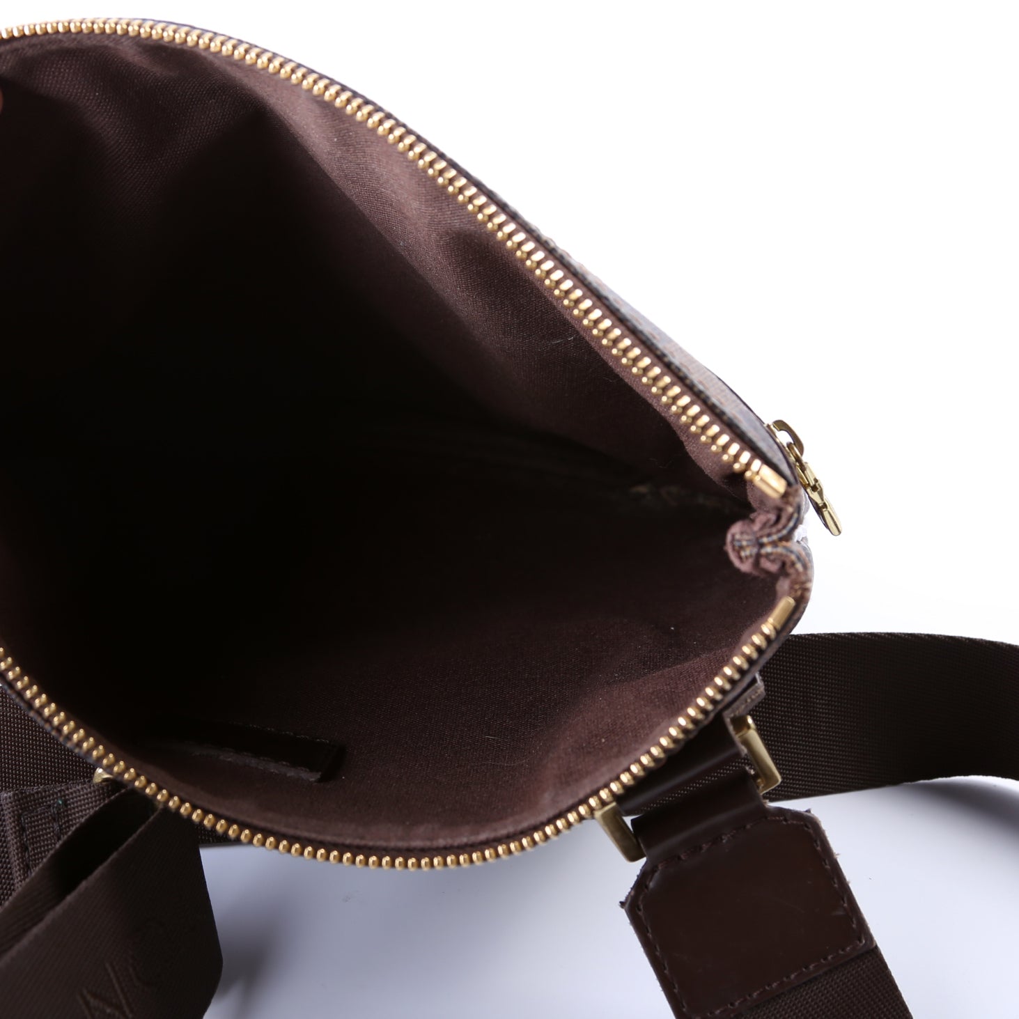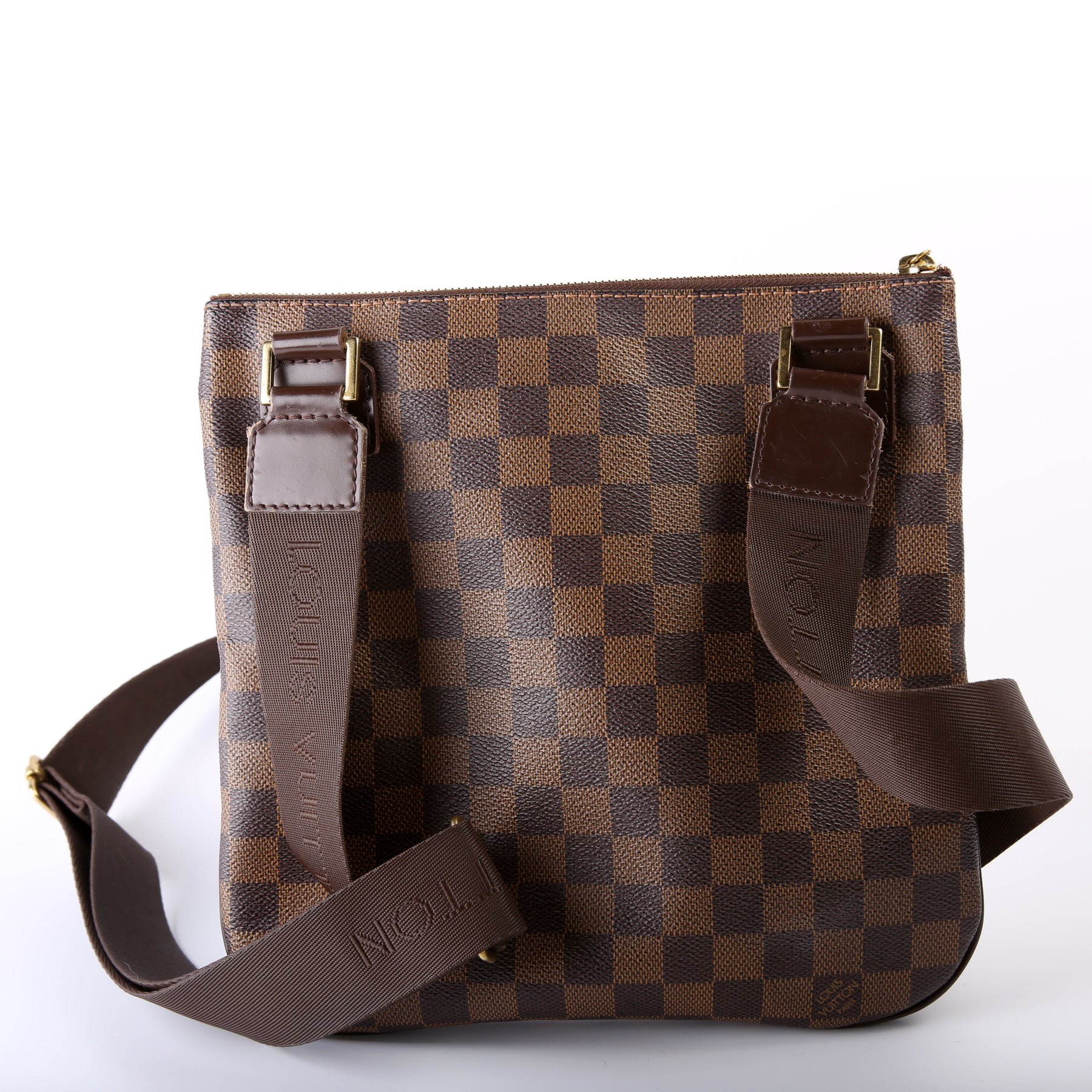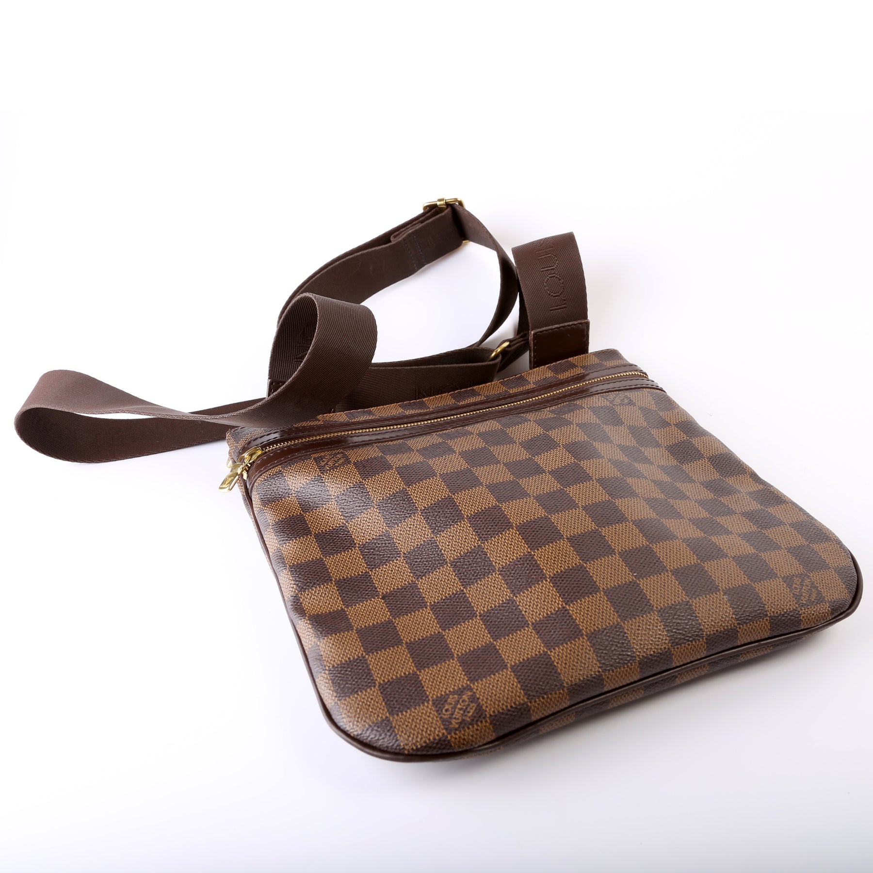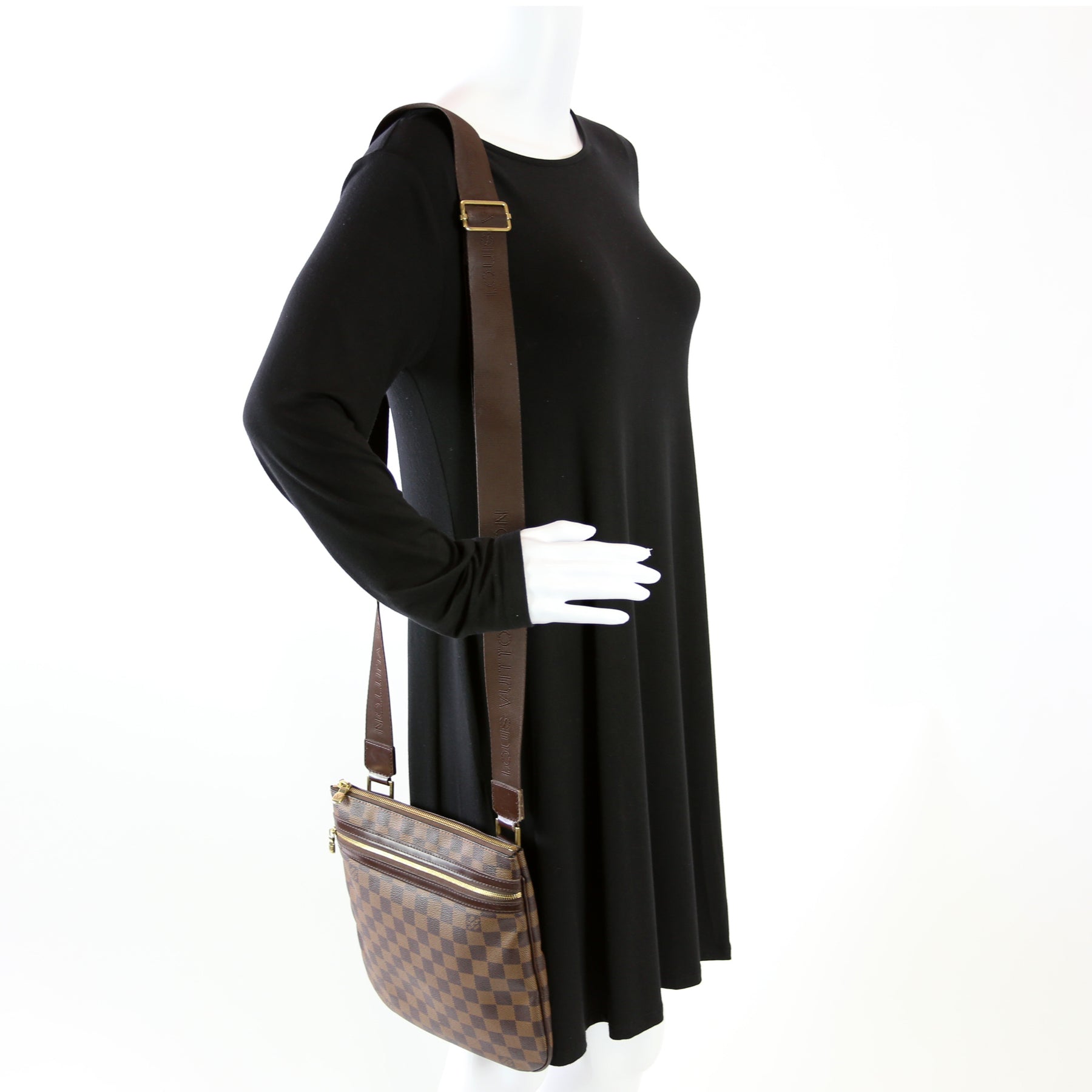 This pre-owned Louis Vuitton Pochette Bosphore is guaranteed 100% authentic. The exterior is in the classic Louis Vuitton Damier Ebene coated canvas.