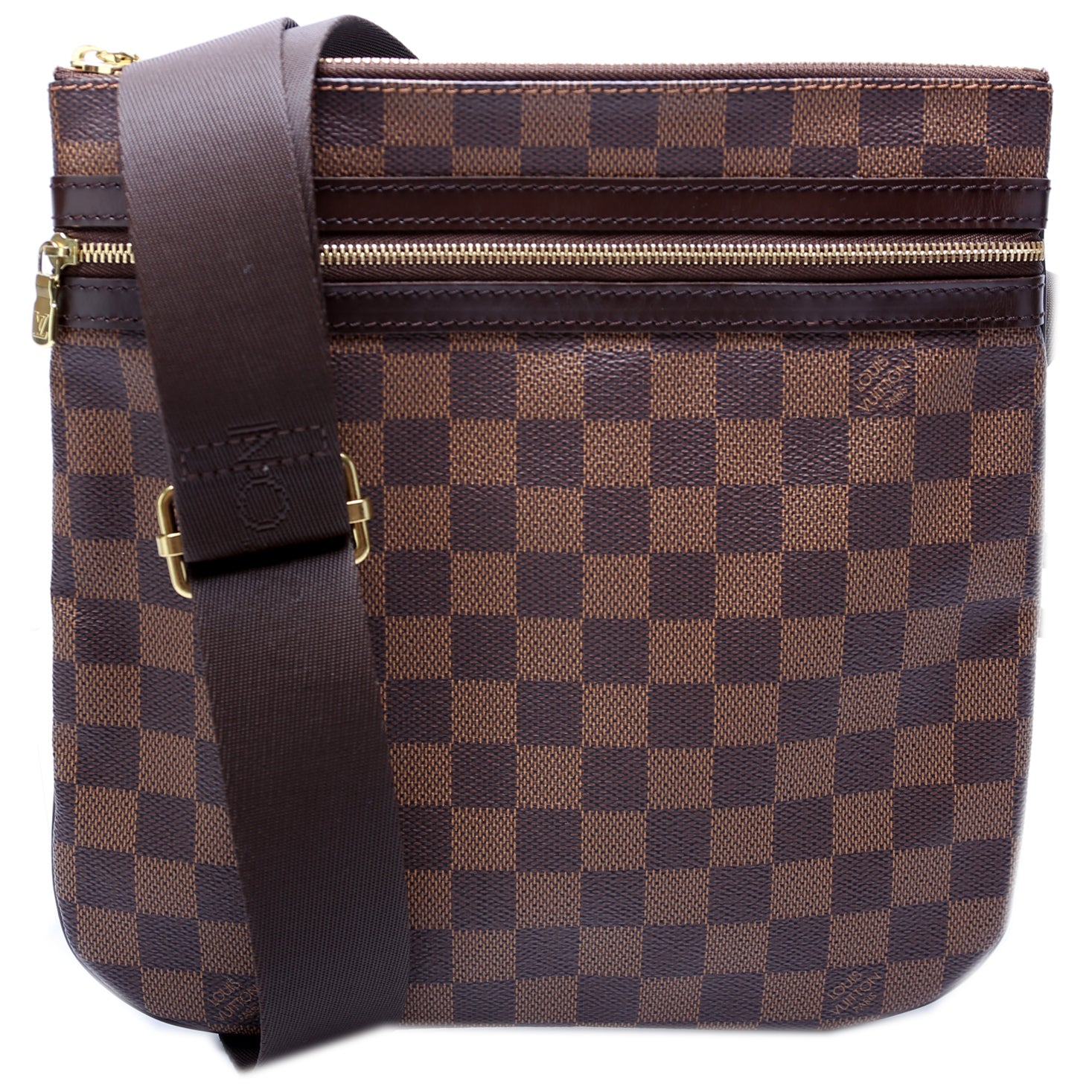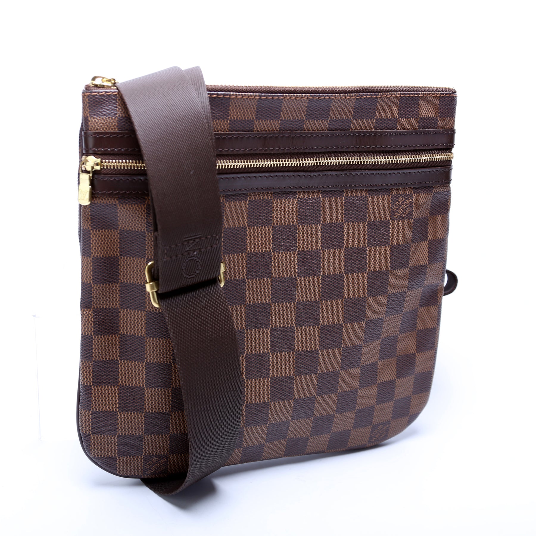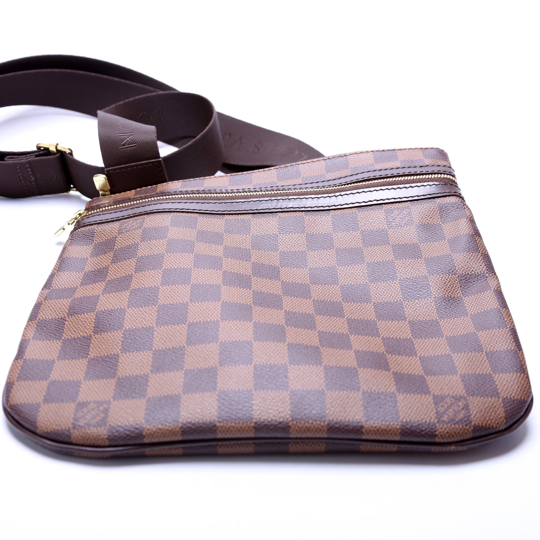 This pre-owned Louis Vuitton Pochette Bosphore is guaranteed 100% authentic. The exterior is in the classic Louis Vuitton Damier Ebene coated canvas.