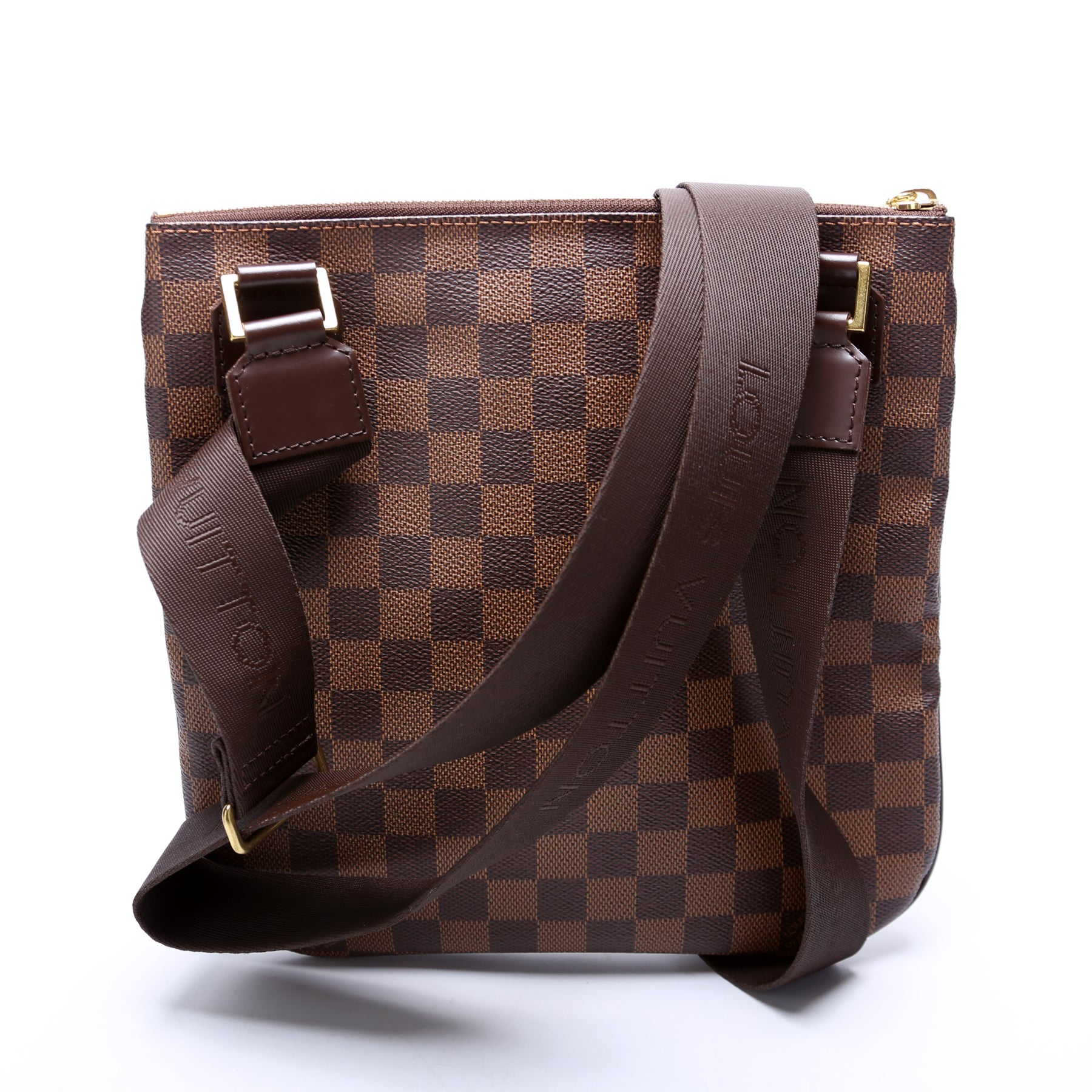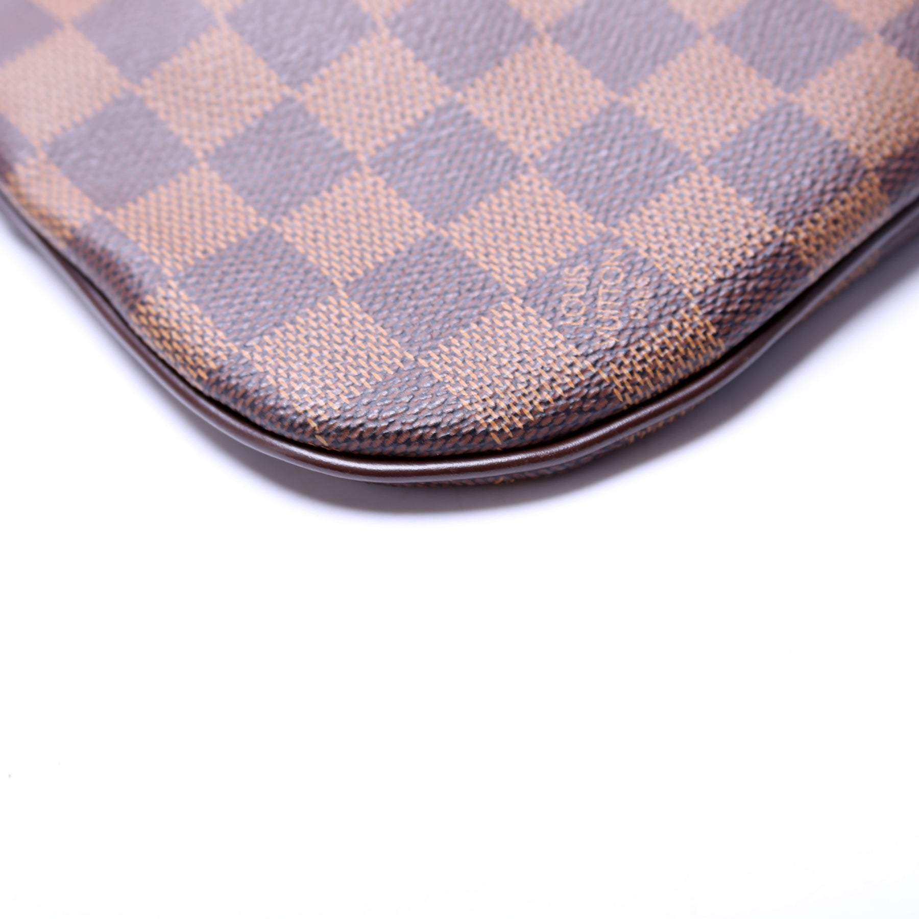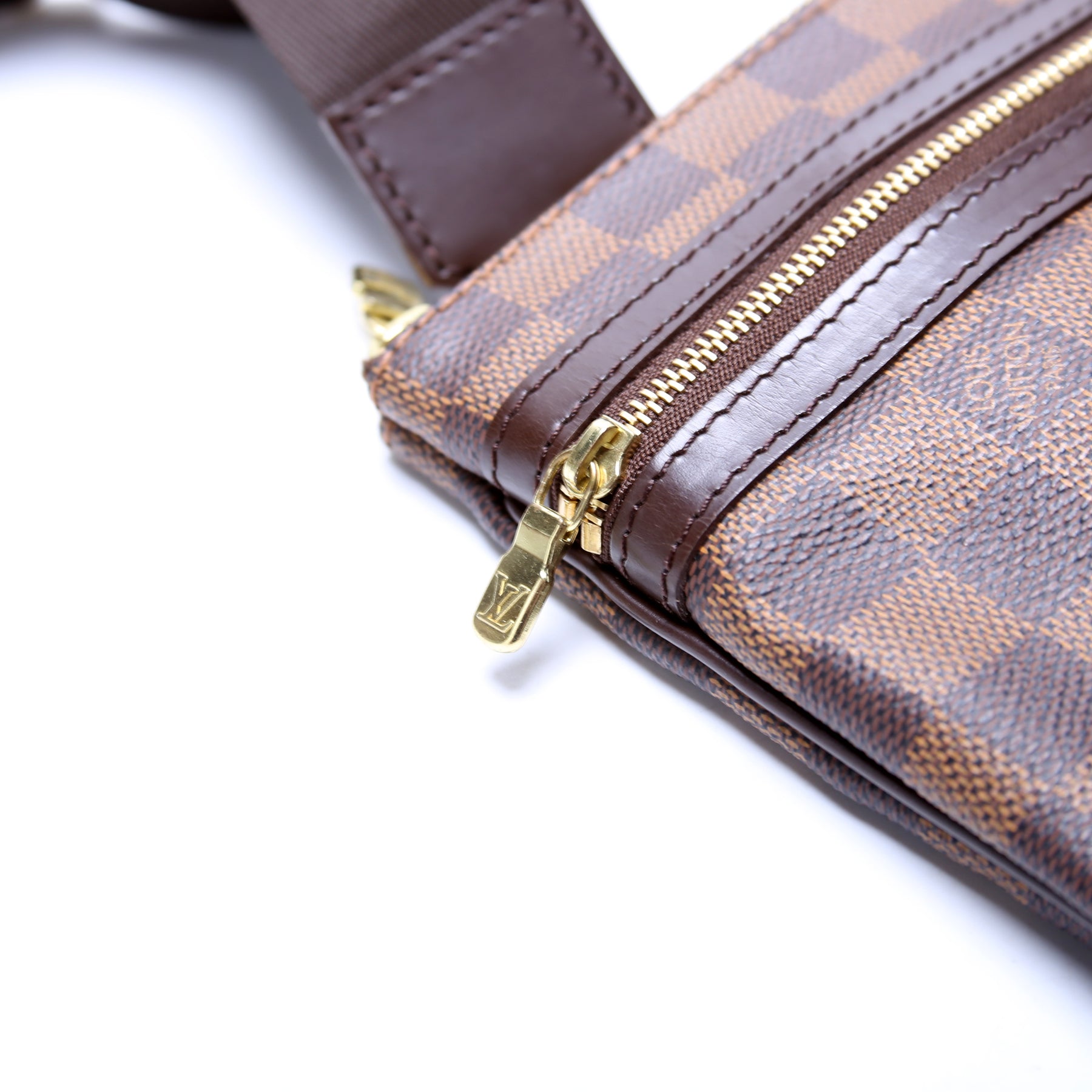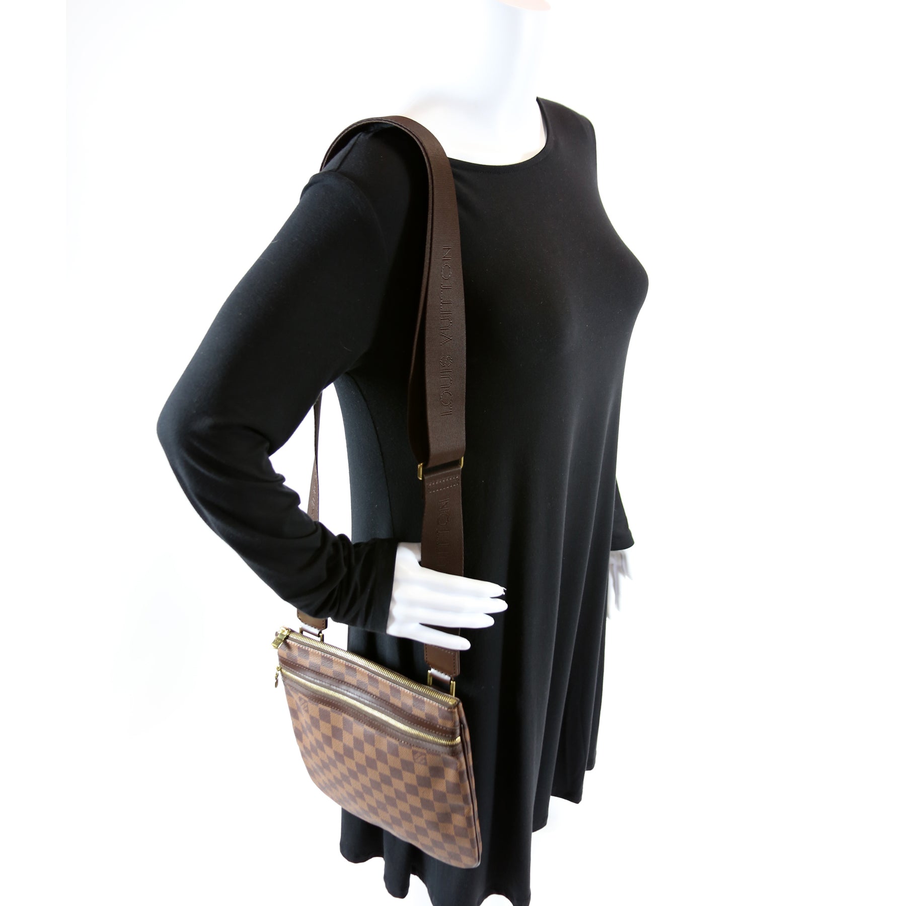 This pre-owned Louis Vuitton Pochette Bosphore is guaranteed 100% authentic. The exterior is in the classic Louis Vuitton Damier Ebene coated canvas.