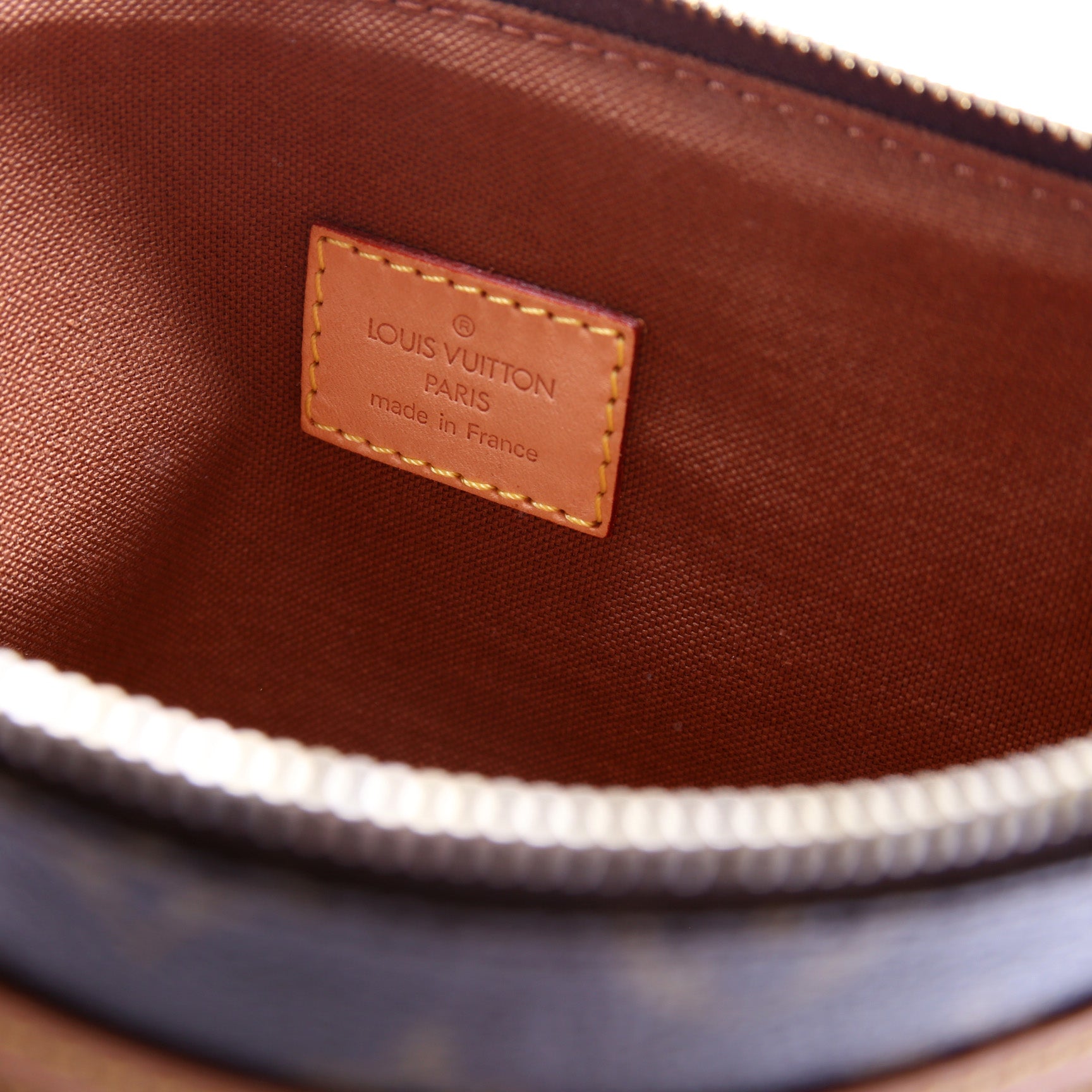 This pre-owned Louis Vuitton Pochette Bosphore is guaranteed 100% authentic. The exterior is in the classic Louis Vuitton Damier Ebene coated canvas.