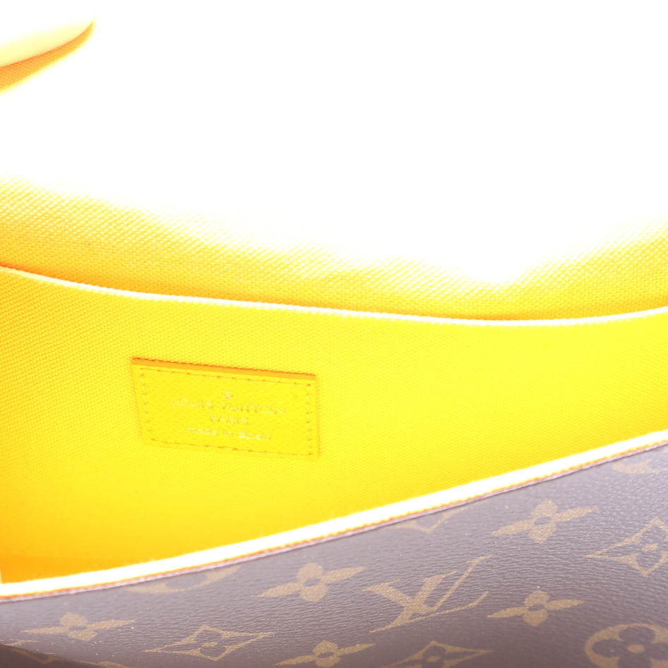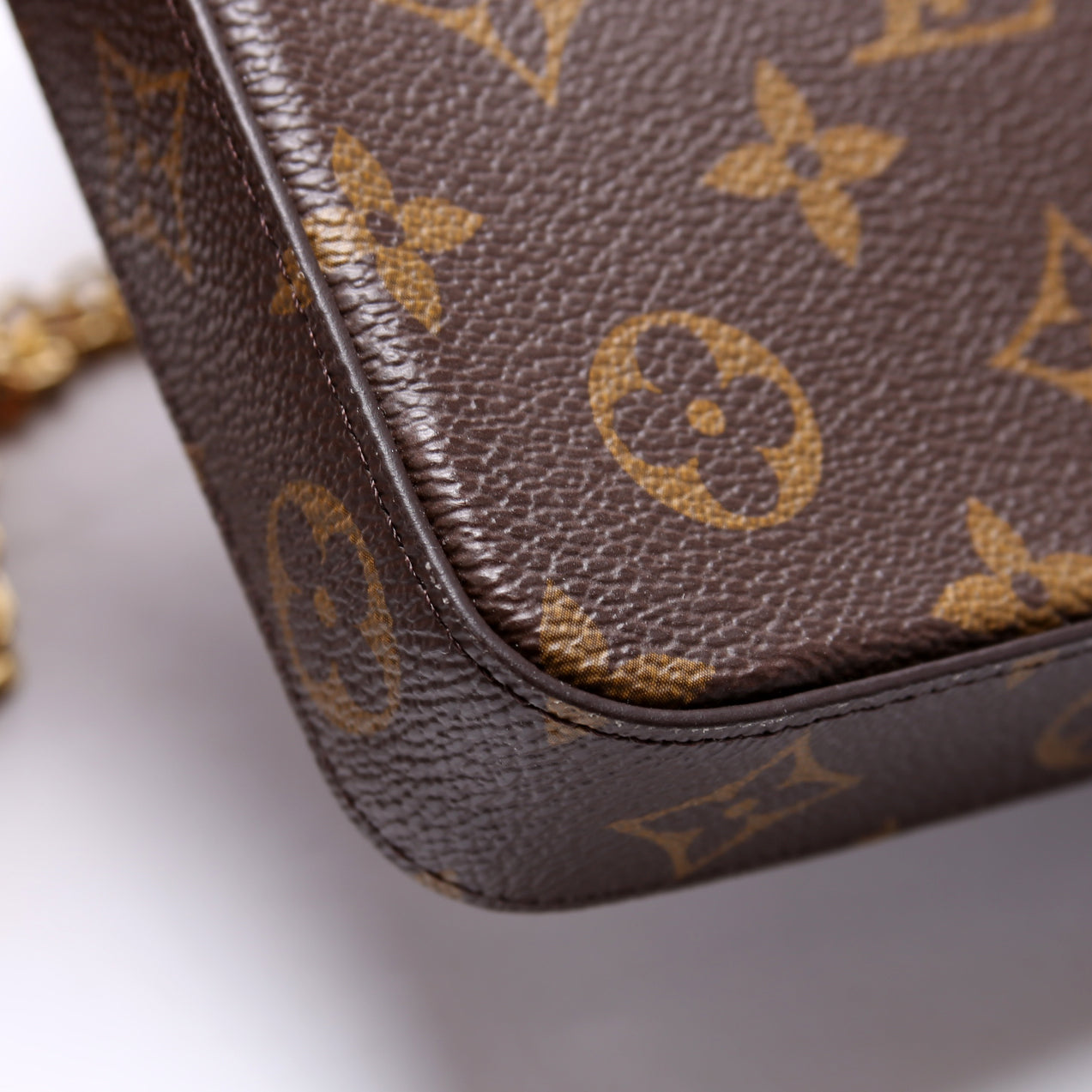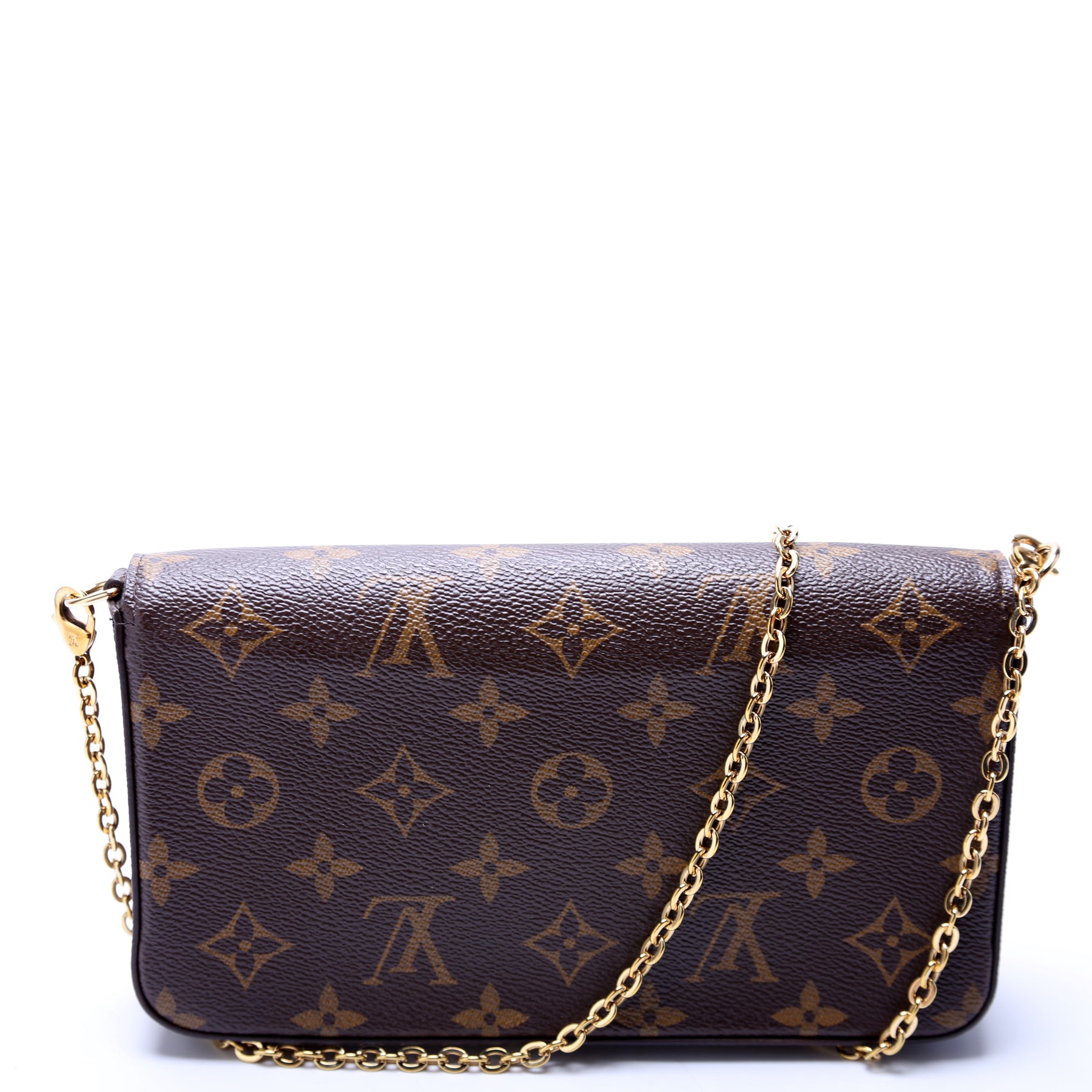 This pre-owned Louis Vuitton Pochette Felicie 2022 Christmas Animation Monogram is guaranteed 100% authentic. The exterior is in the classic Monogram coated canvas.