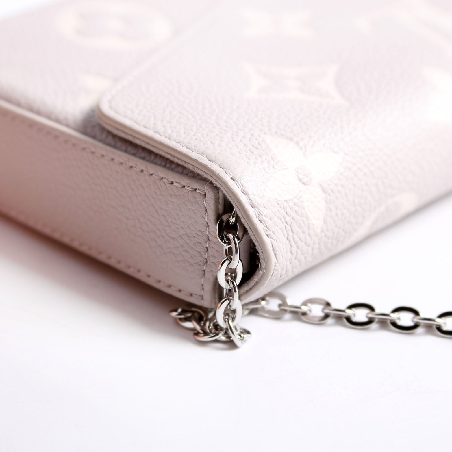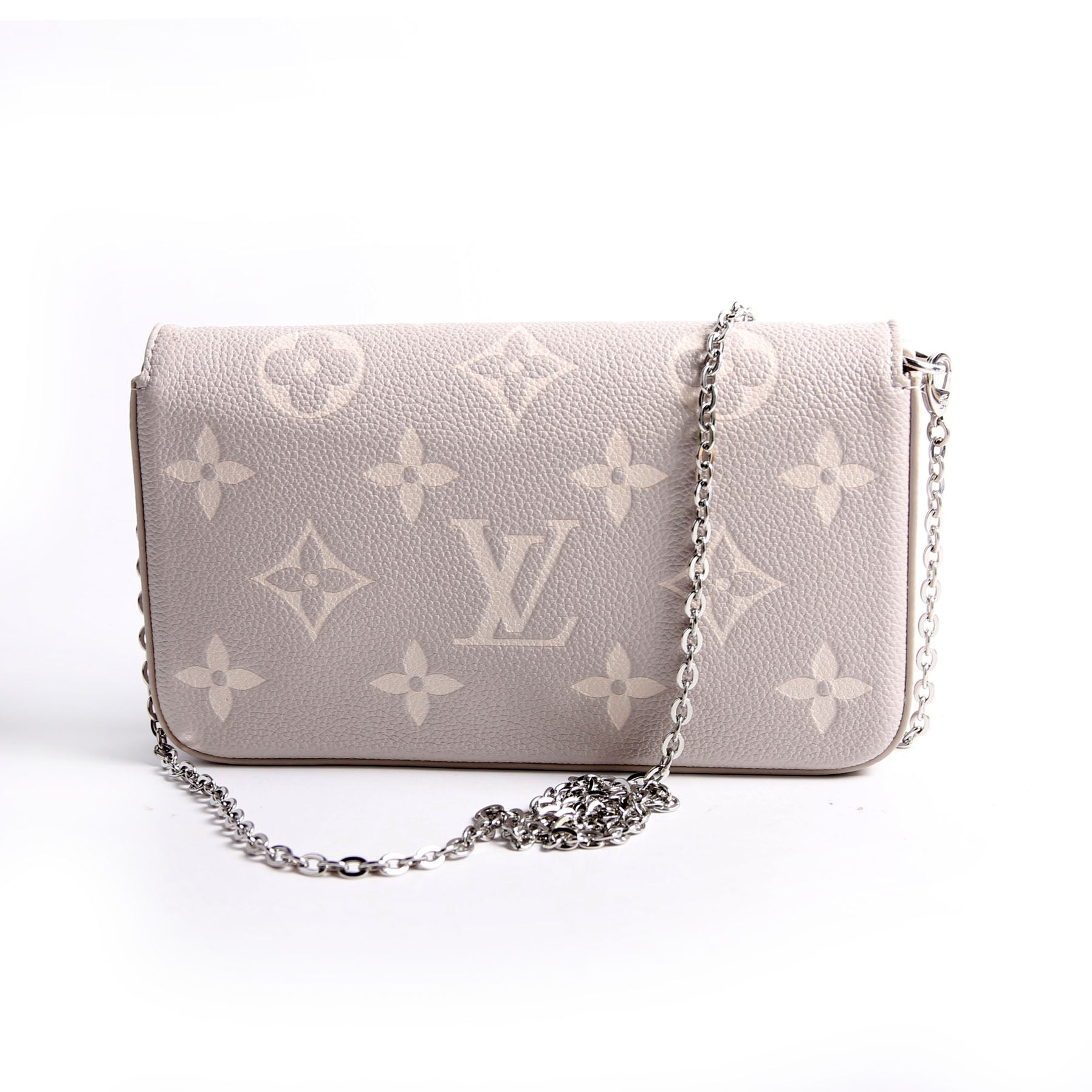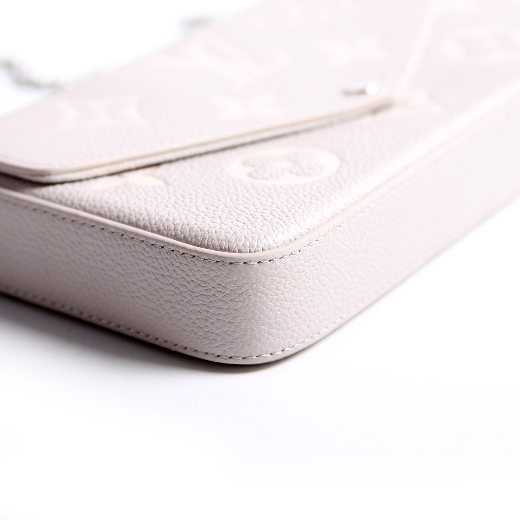 This pre-owned Louis Vuitton Pochette Felicie Bicolor is guaranteed 100% authentic. The exterior is in the classic Louis Vuitton Empreinte leather.