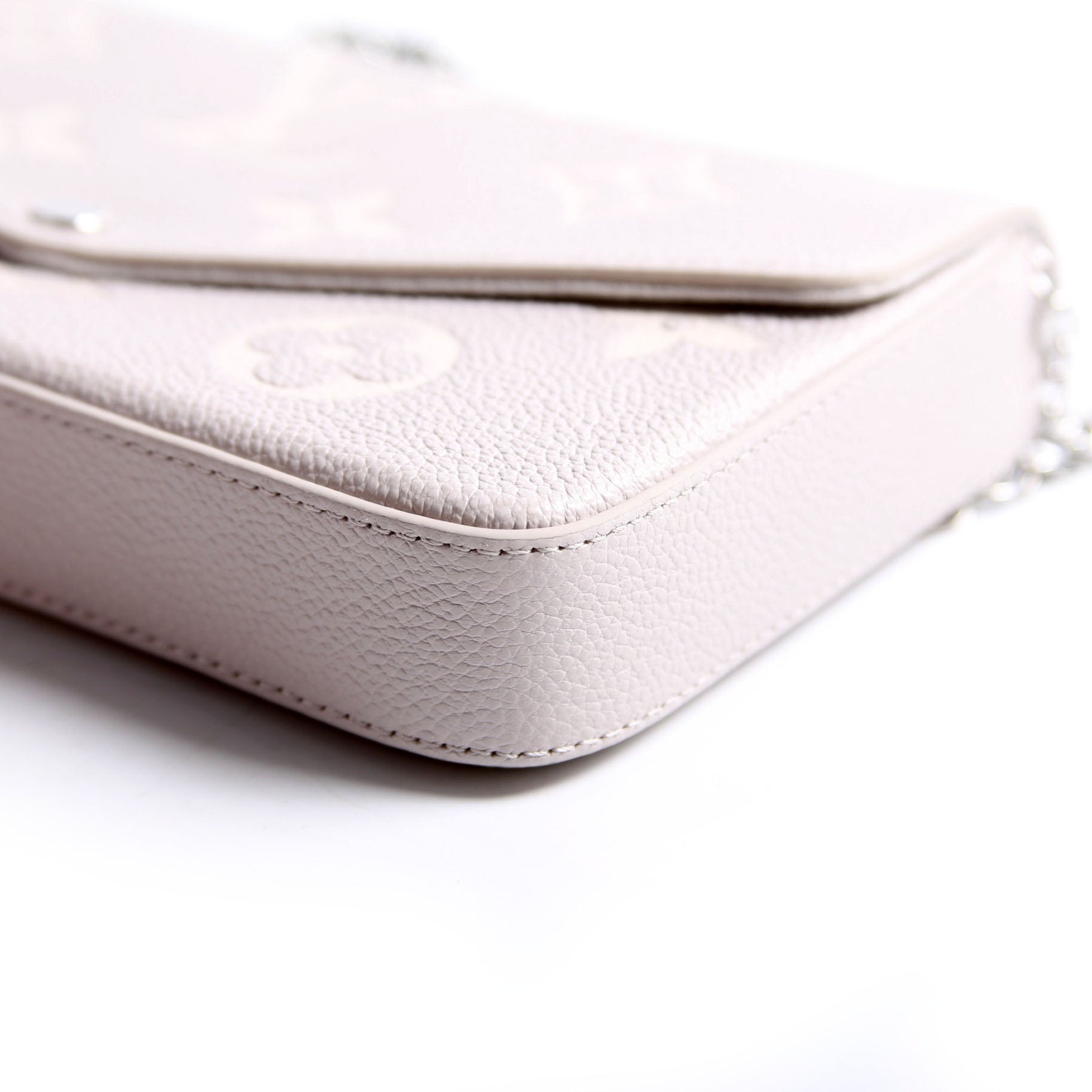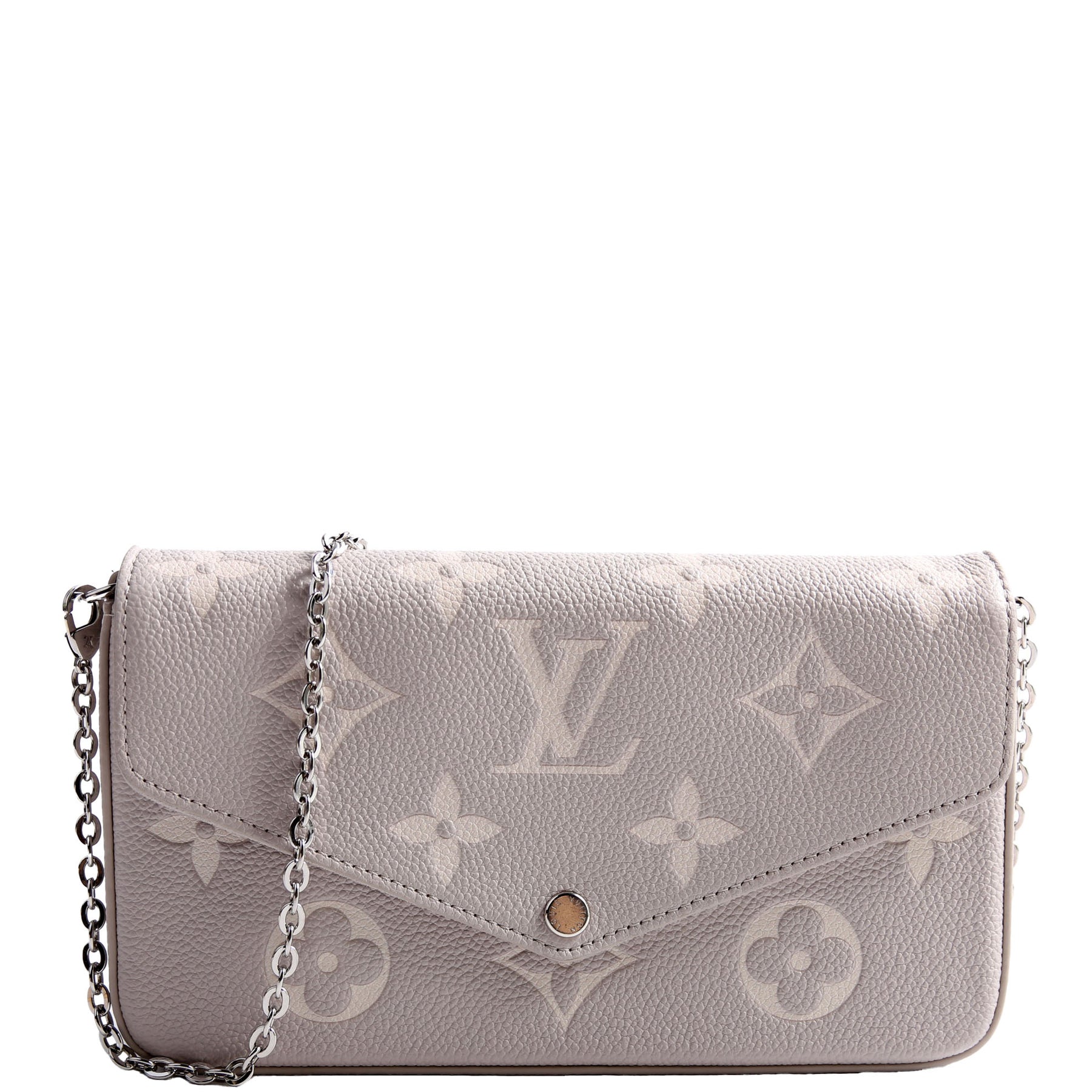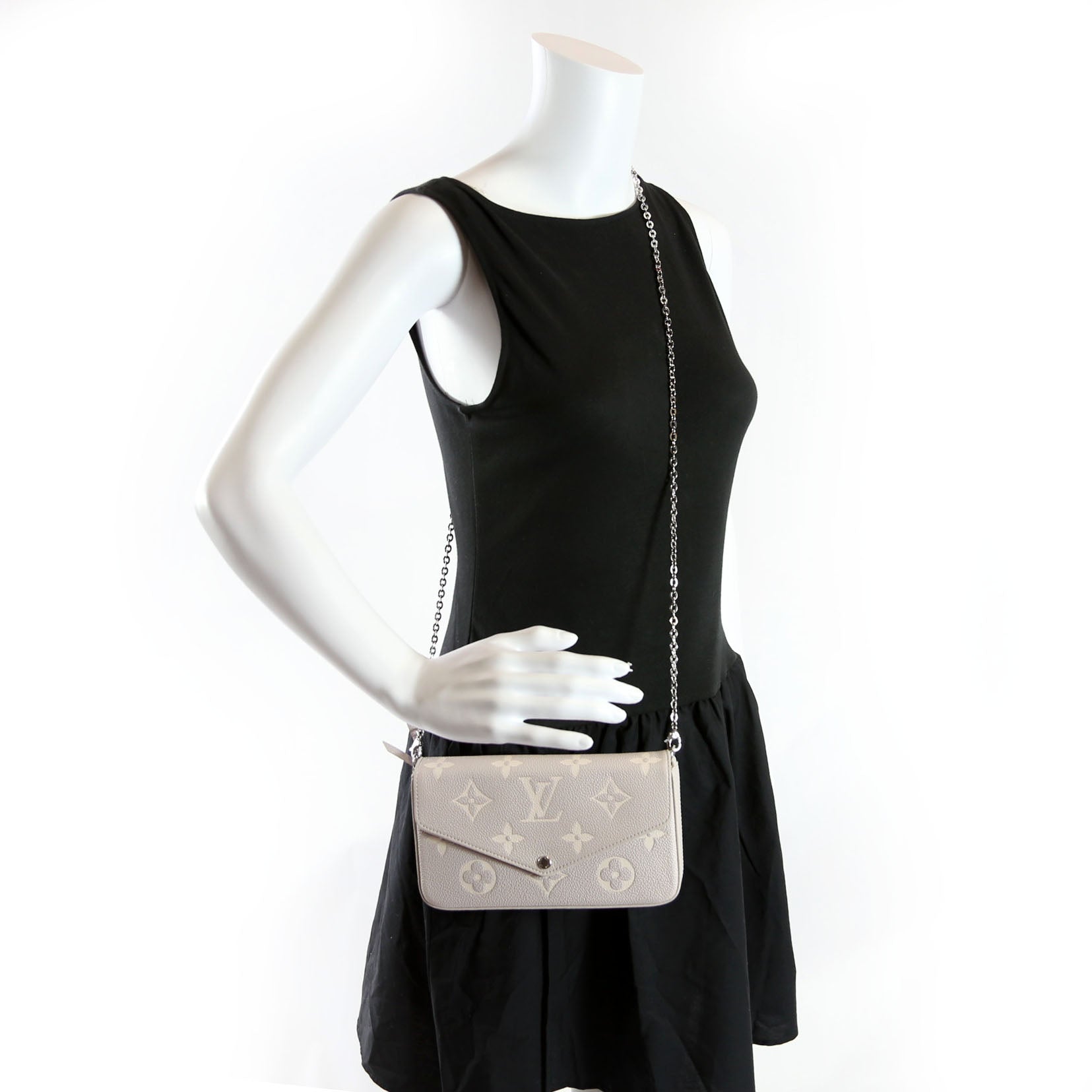 This pre-owned Louis Vuitton Pochette Felicie Bicolor is guaranteed 100% authentic. The exterior is in the classic Louis Vuitton Empreinte leather.