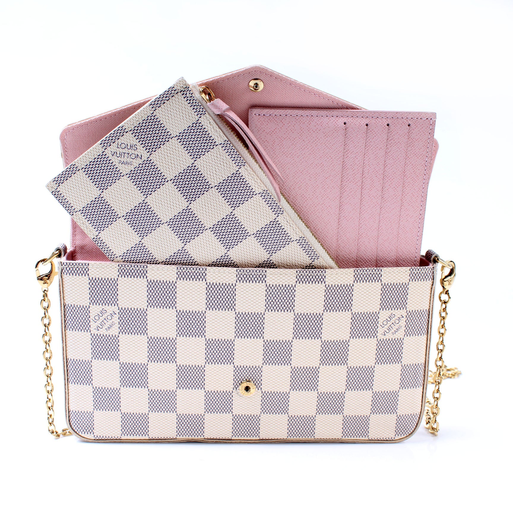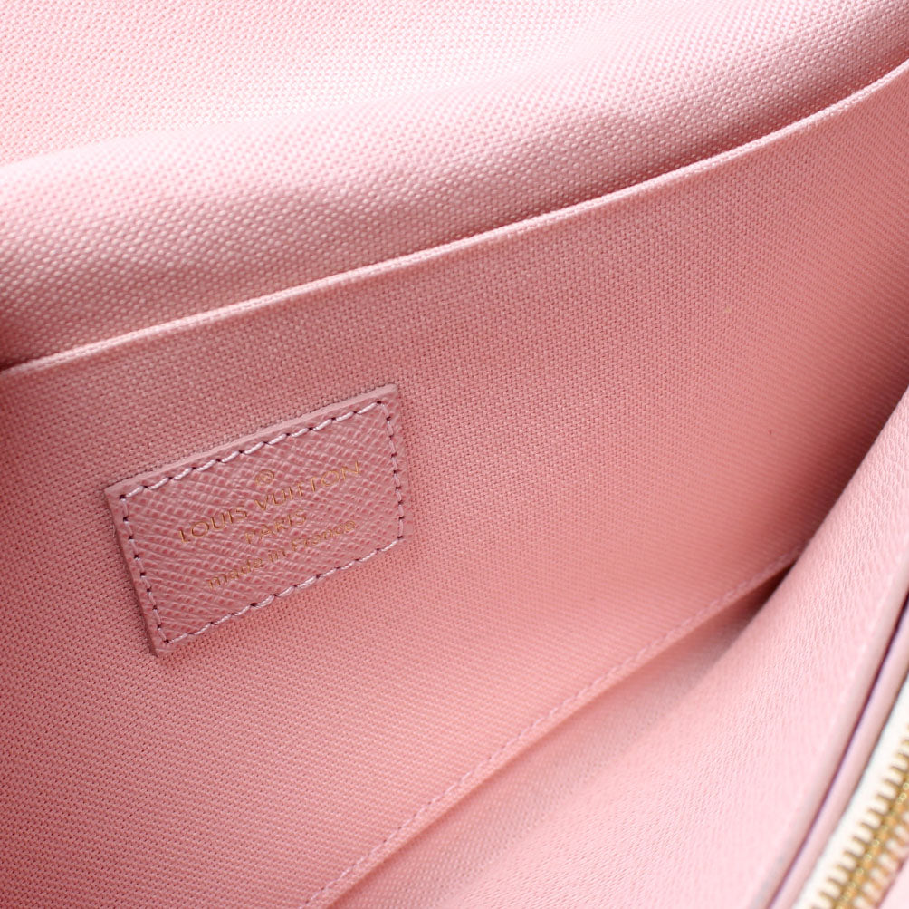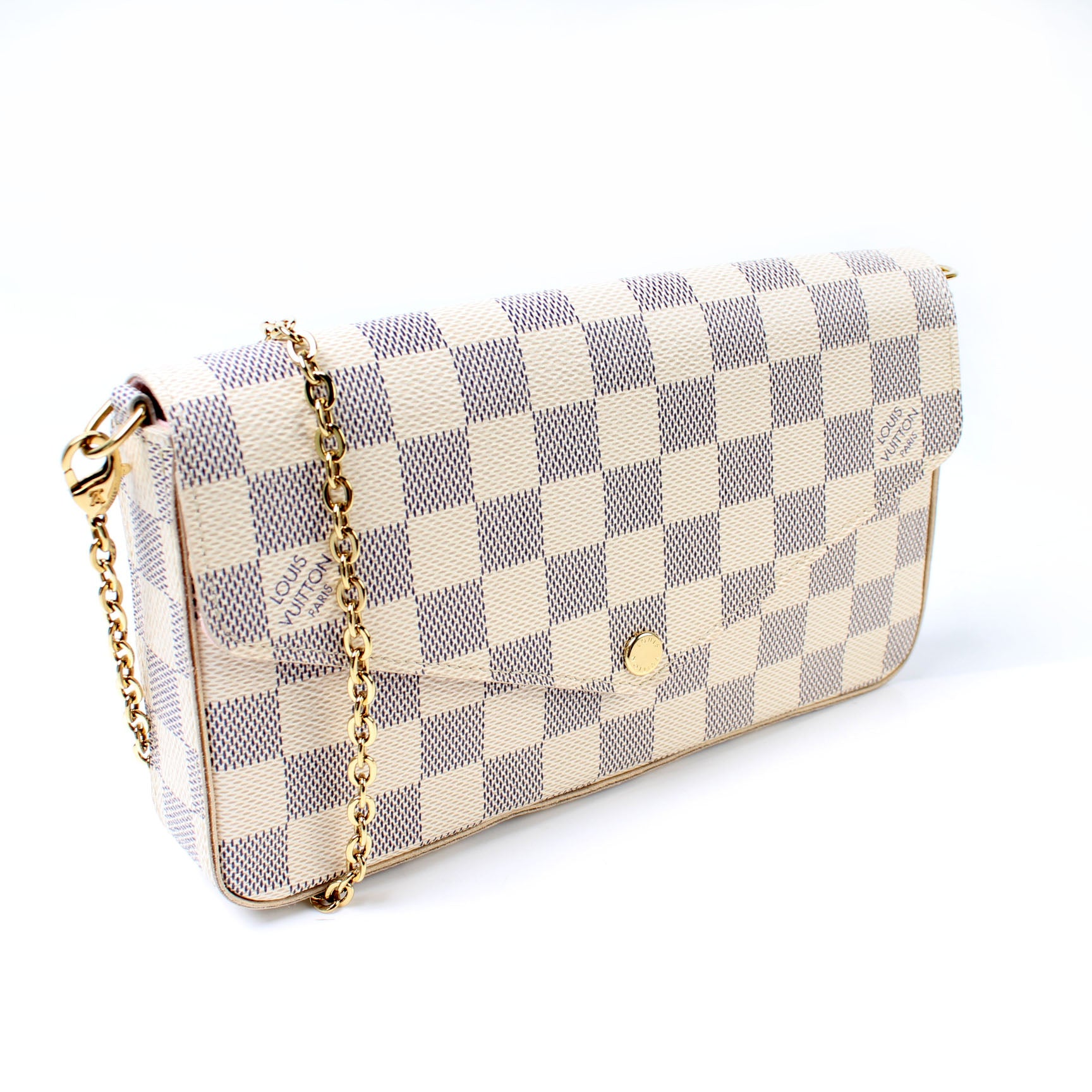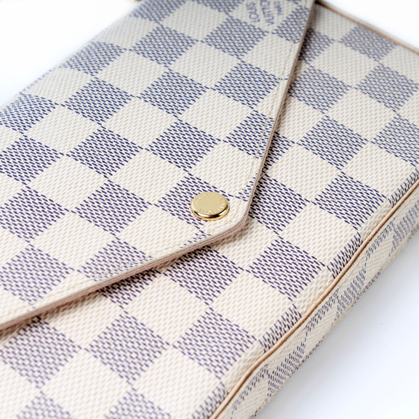 This pre-owned Louis Vuitton Pochette Felicie is guaranteed 100% authentic. The exterior is in the classic Louis Vuitton Damier Azur coated canvas.