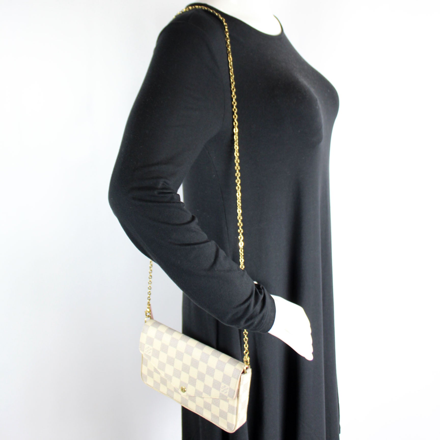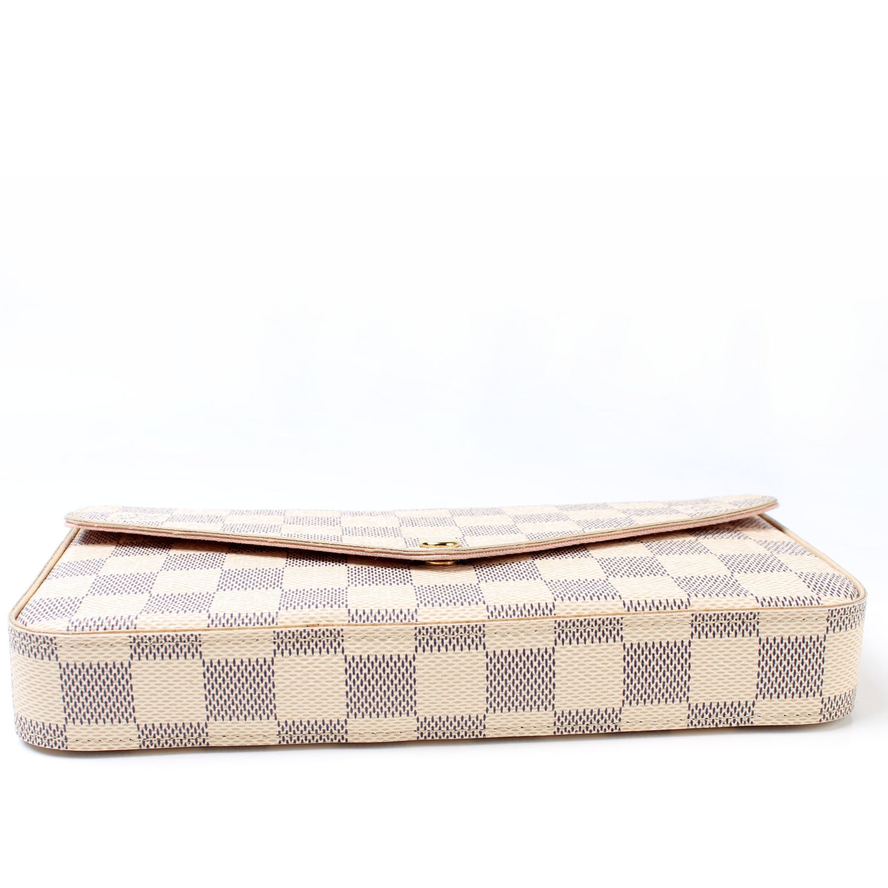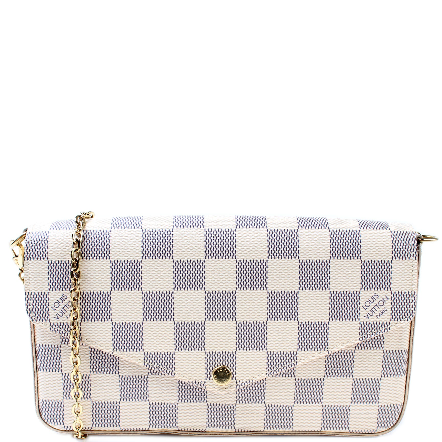 This pre-owned Louis Vuitton Pochette Felicie is guaranteed 100% authentic. The exterior is in the classic Louis Vuitton Damier Azur coated canvas.