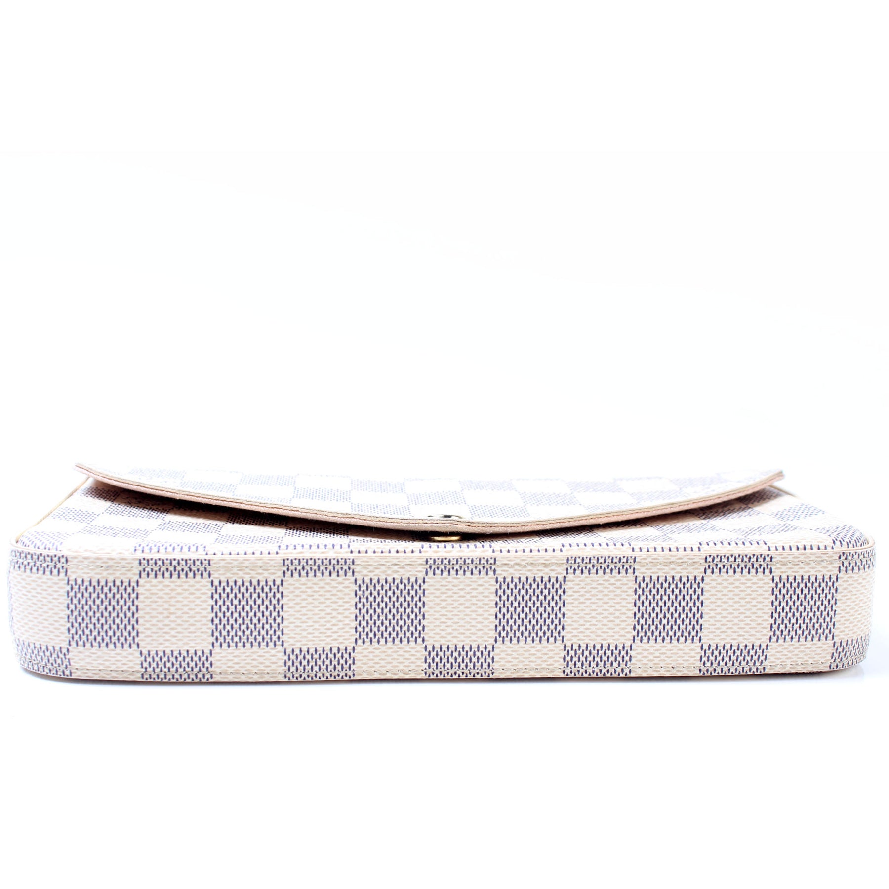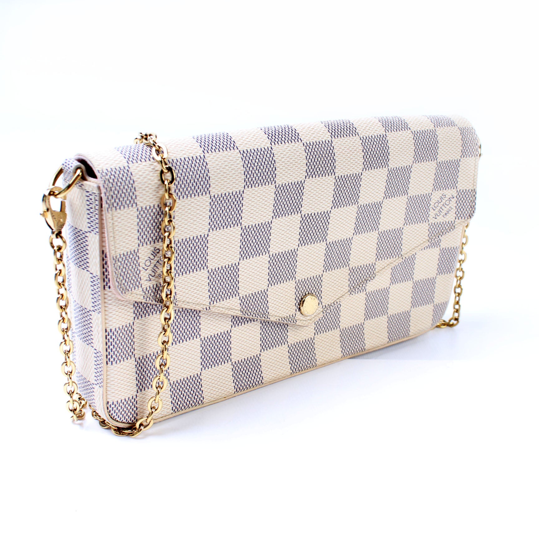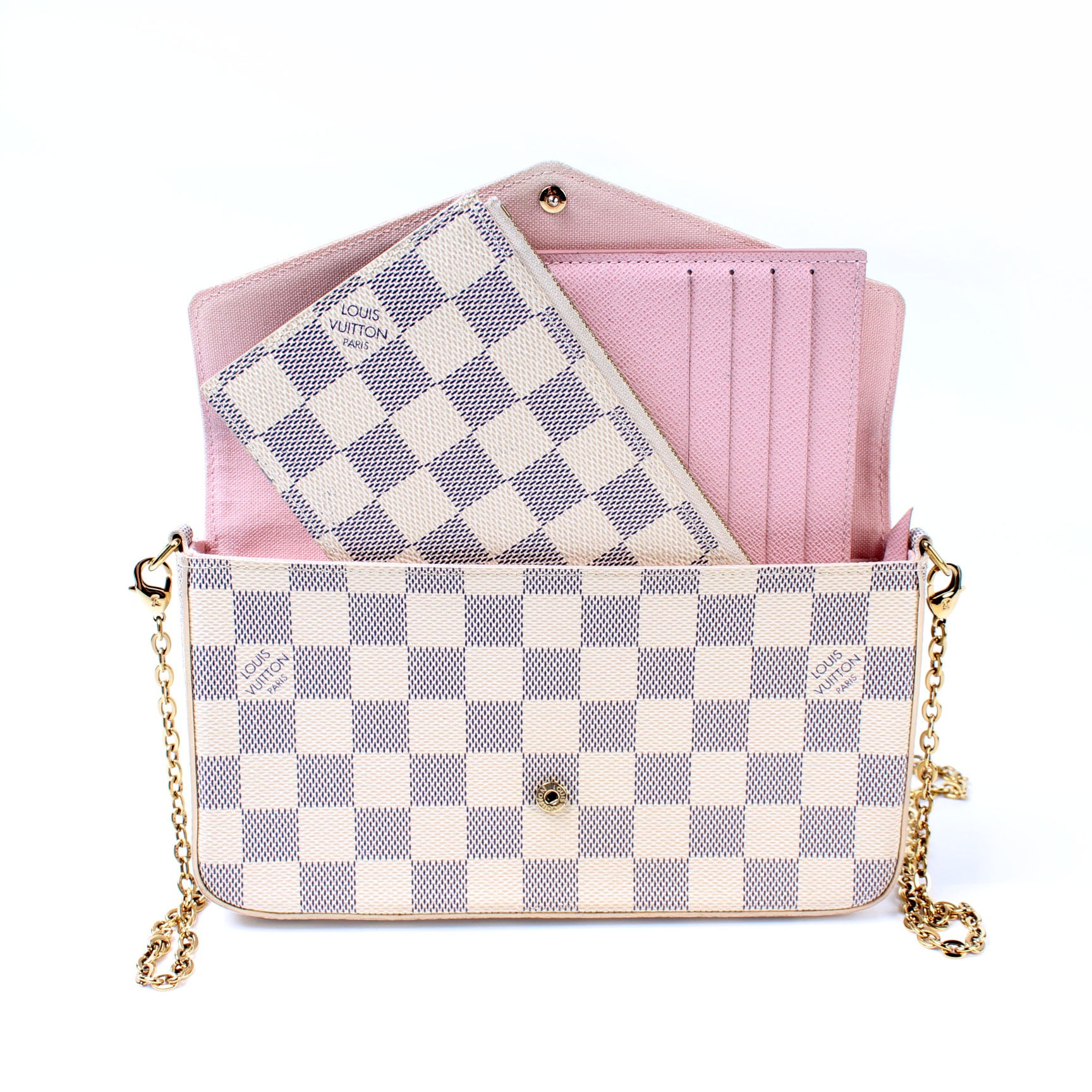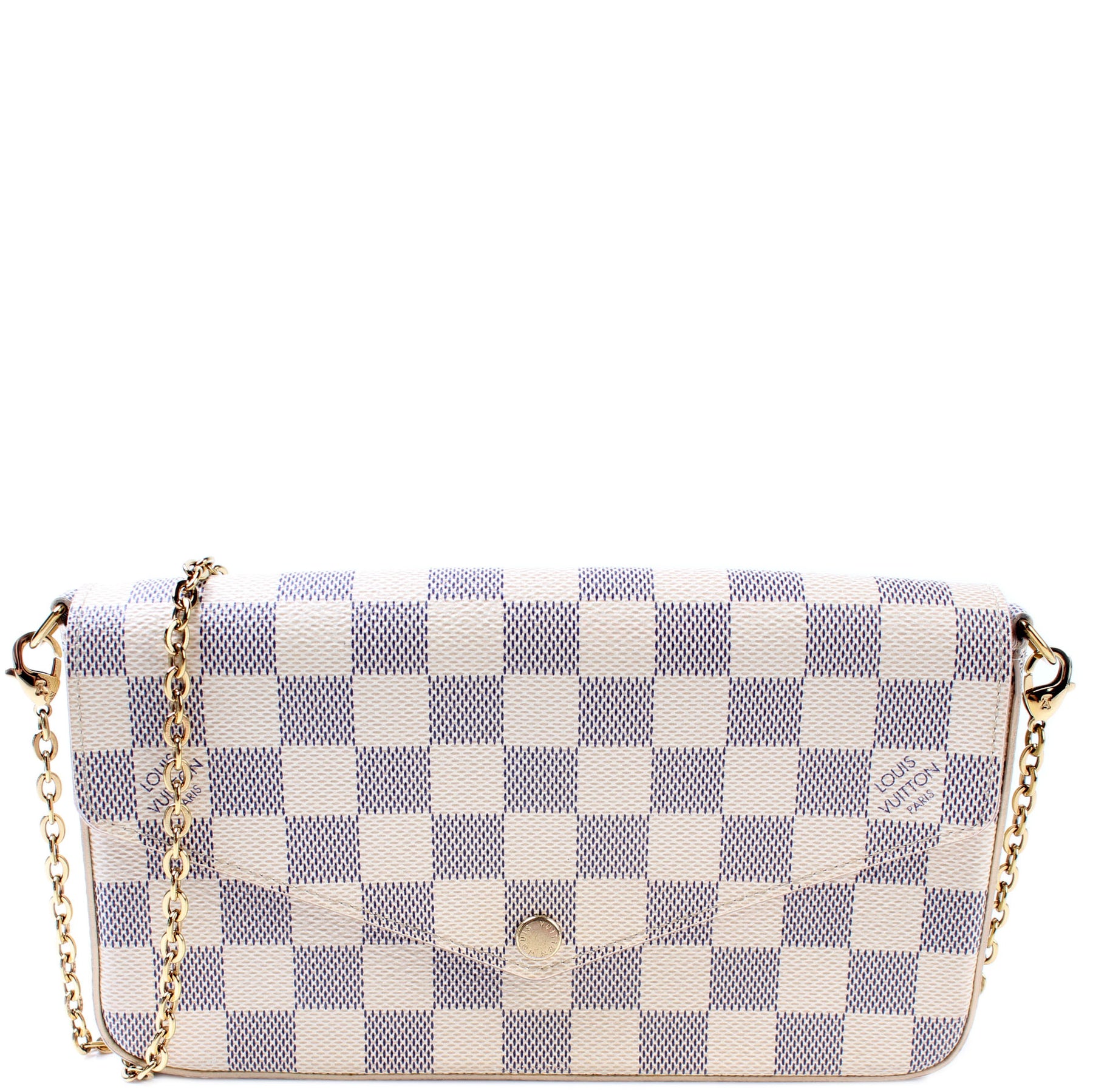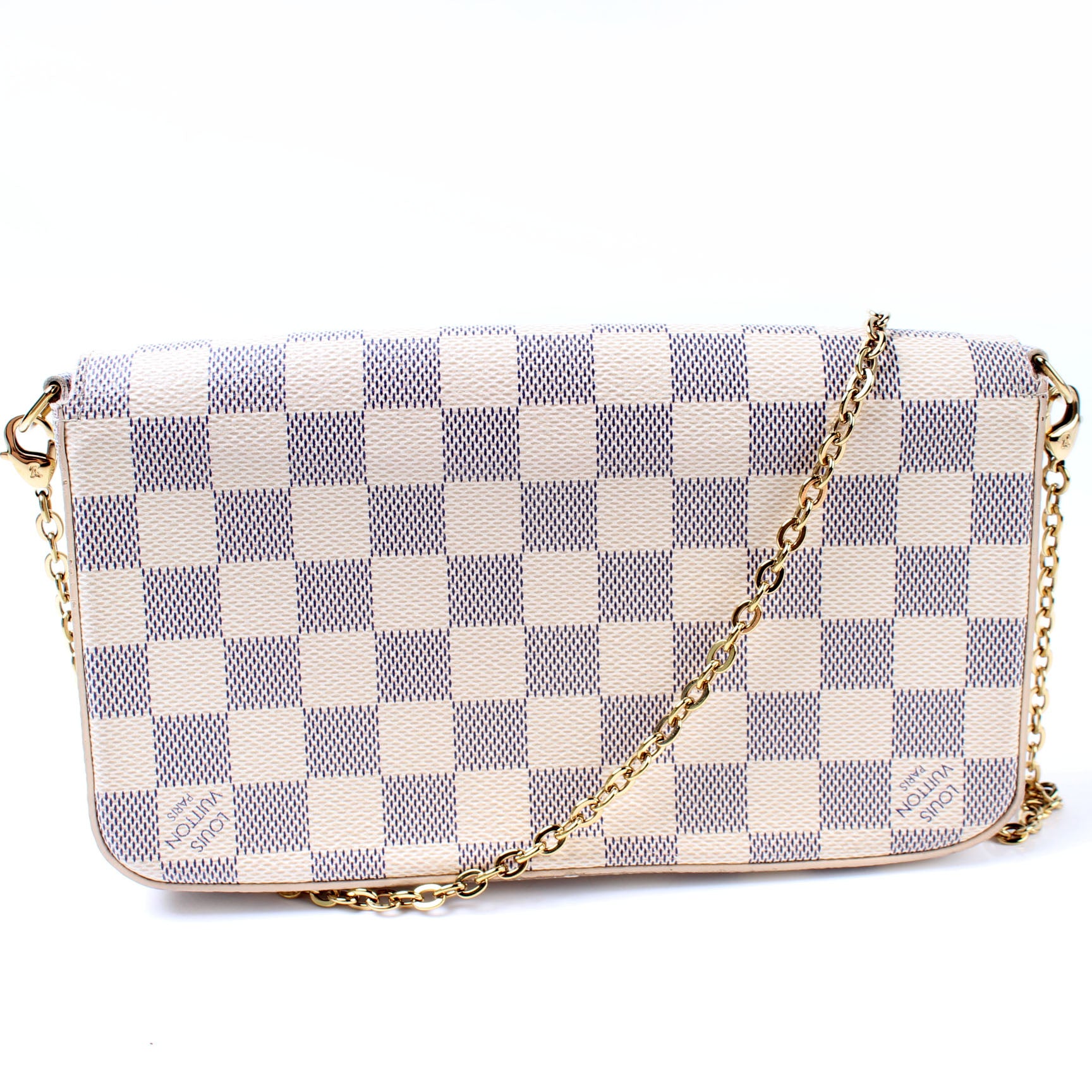 This pre-owned Louis Vuitton Pochette Felicie is guaranteed 100% authentic. The exterior is in the classic Louis Vuitton Damier Azur coated canvas.