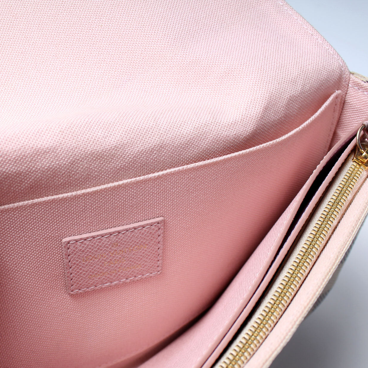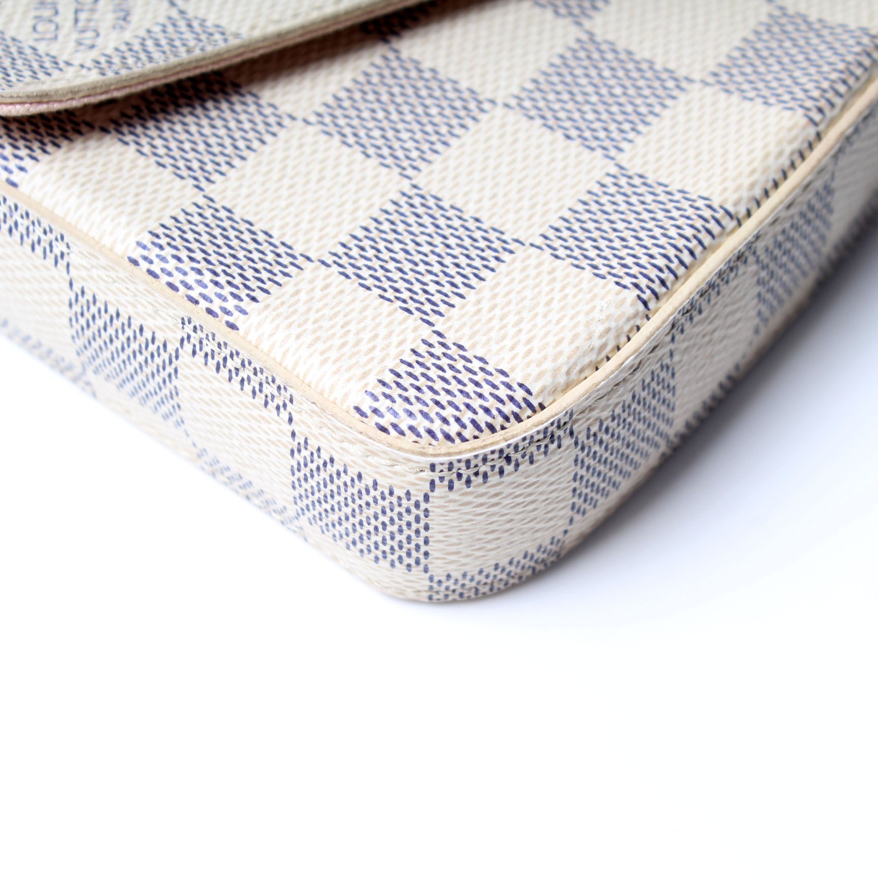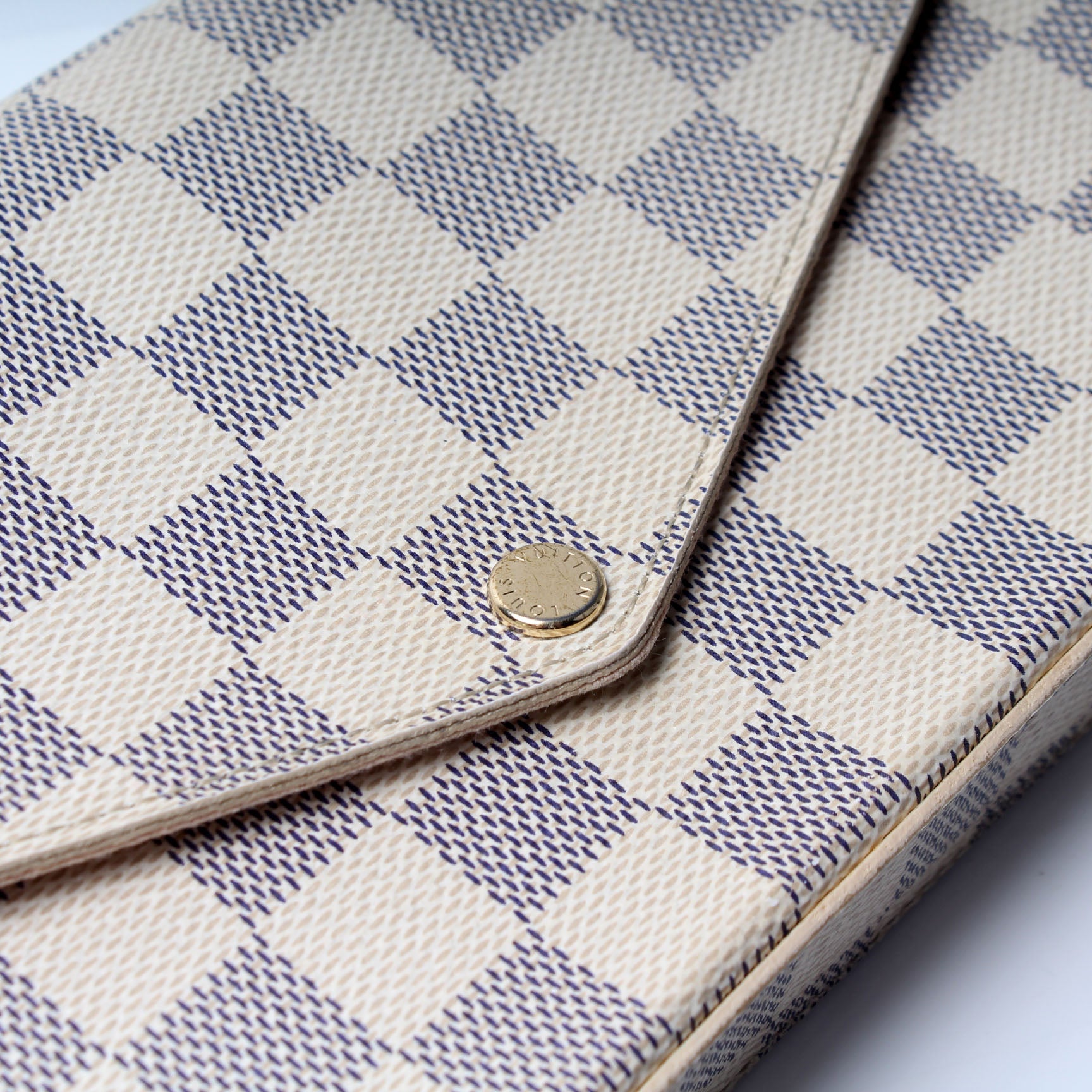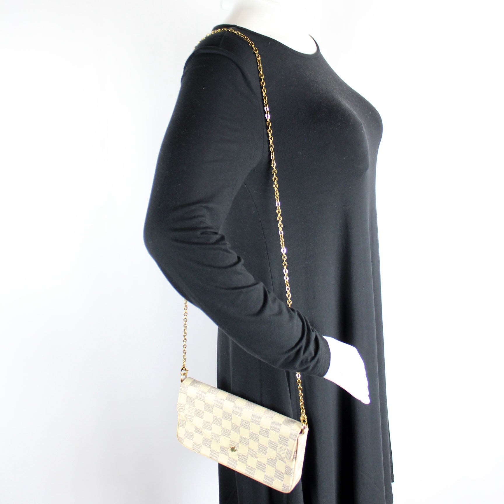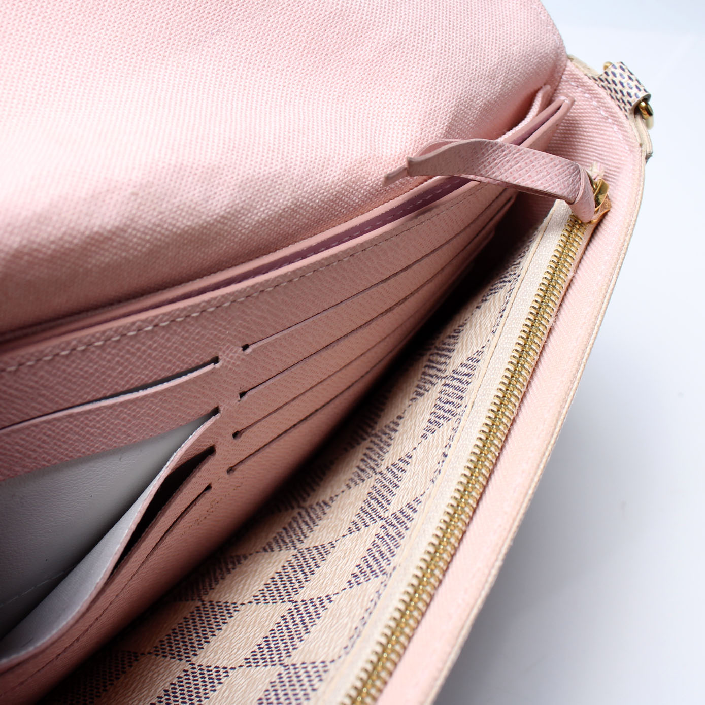 This pre-owned Louis Vuitton Pochette Felicie is guaranteed 100% authentic. The exterior is in the classic Louis Vuitton Damier Azur coated canvas.