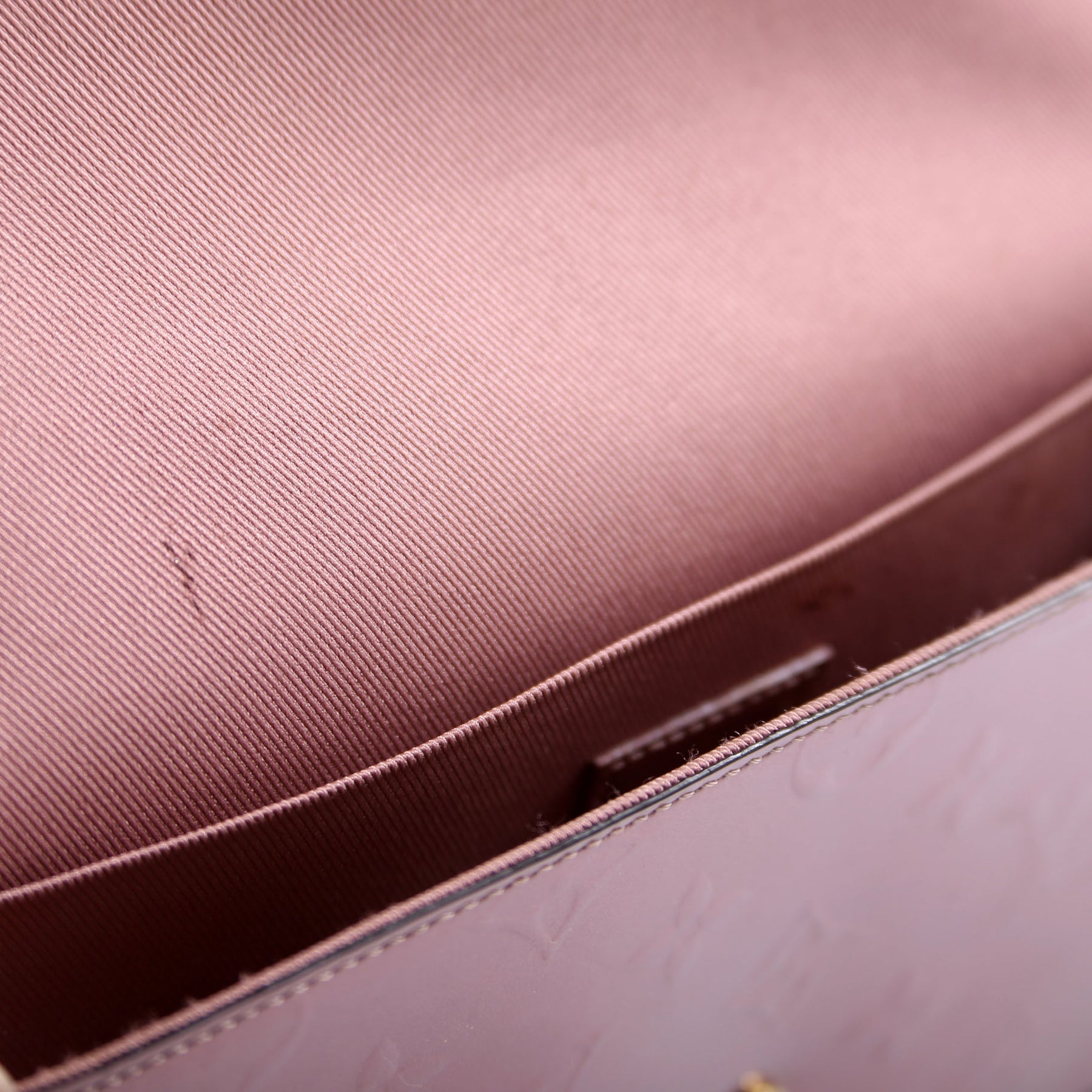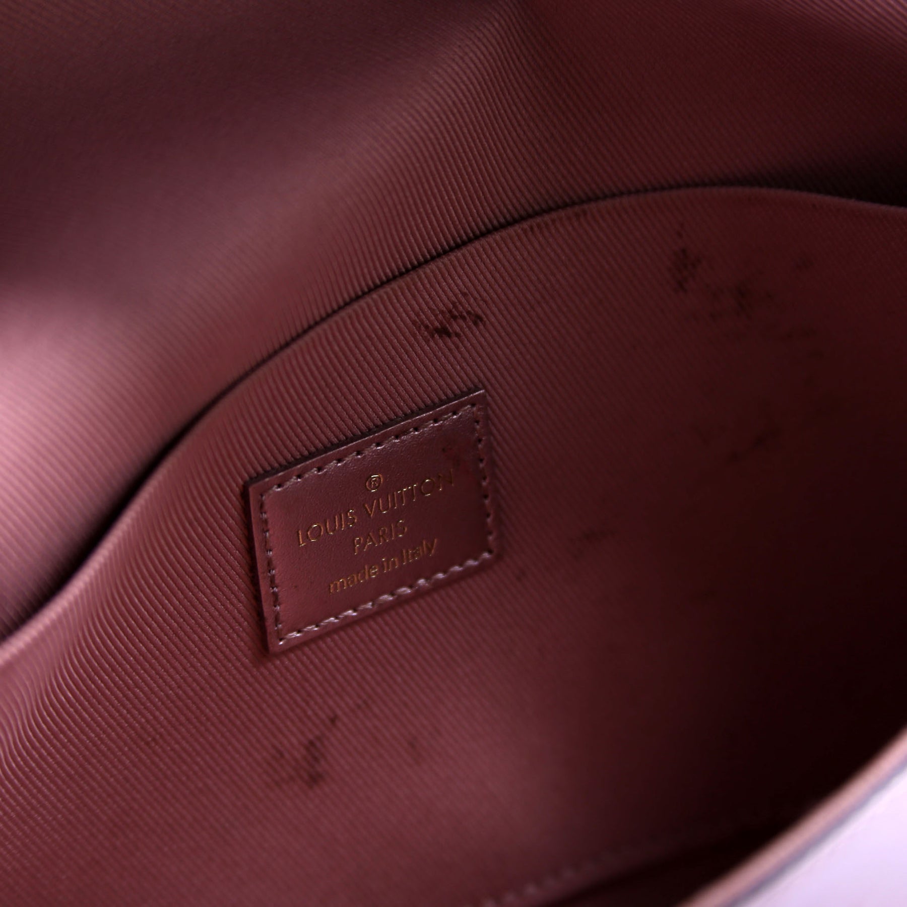 Interior: The interior has minor stains throughout. It features one open pocket. This bag is missing both inserts.