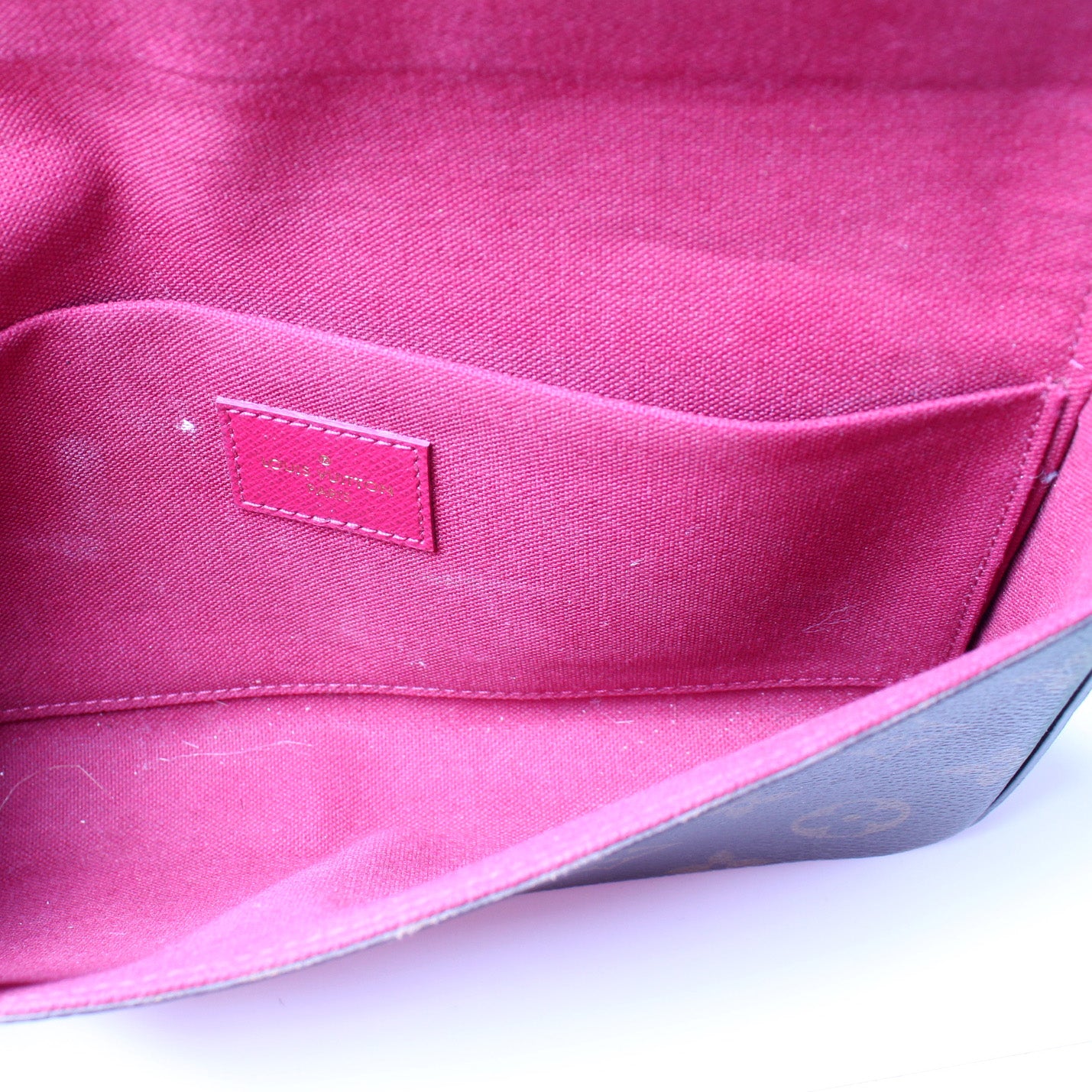 This pre-owned Louis Vuitton Pochette Felicie is guaranteed 100% authentic. The exterior is in the classic Louis Vuitton Monogram coated canvas.