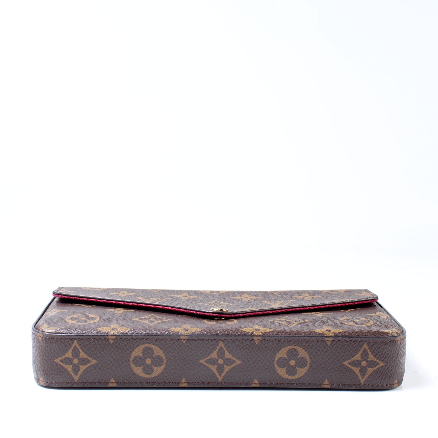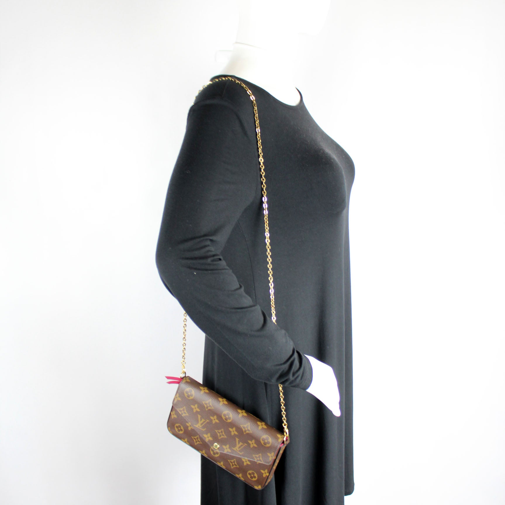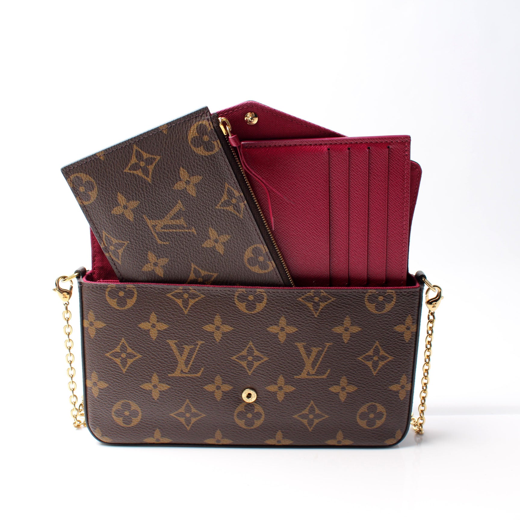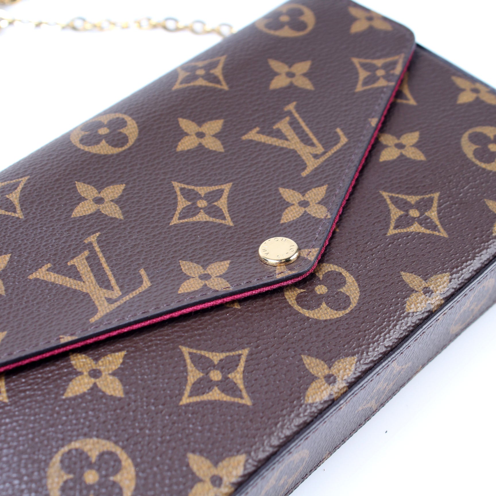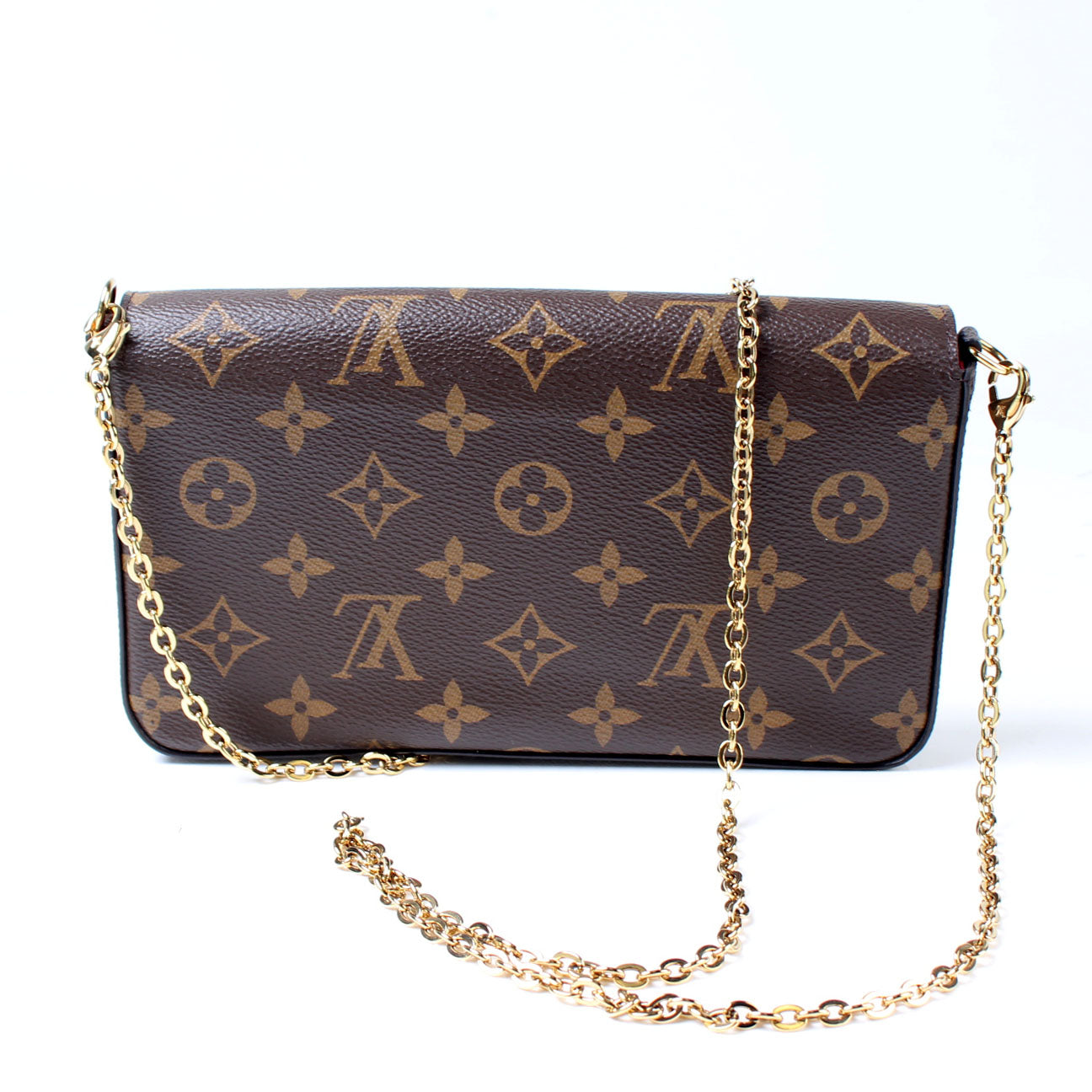 This pre-owned Louis Vuitton Pochette Felicie is guaranteed 100% authentic. The exterior is in the classic Louis Vuitton Monogram coated canvas.