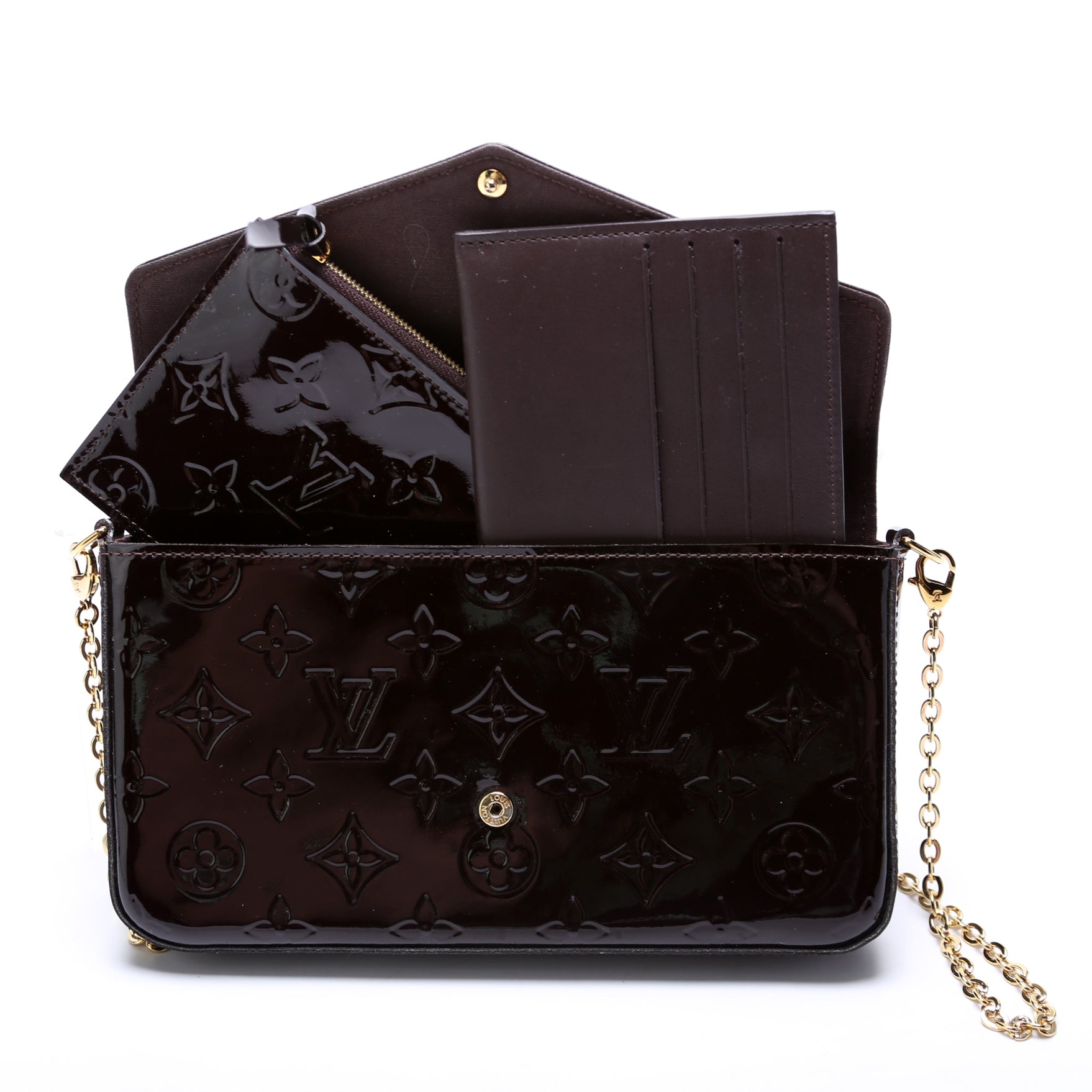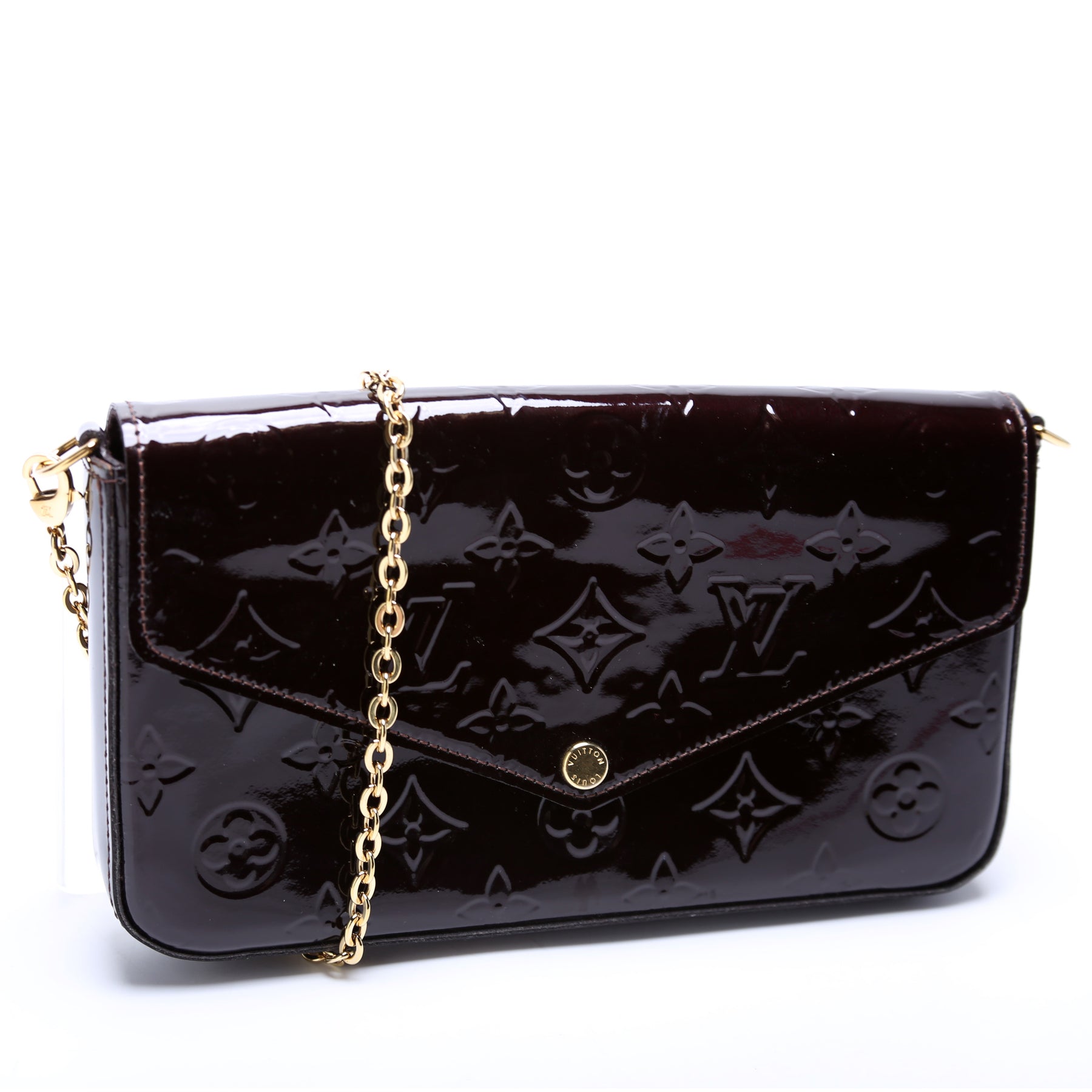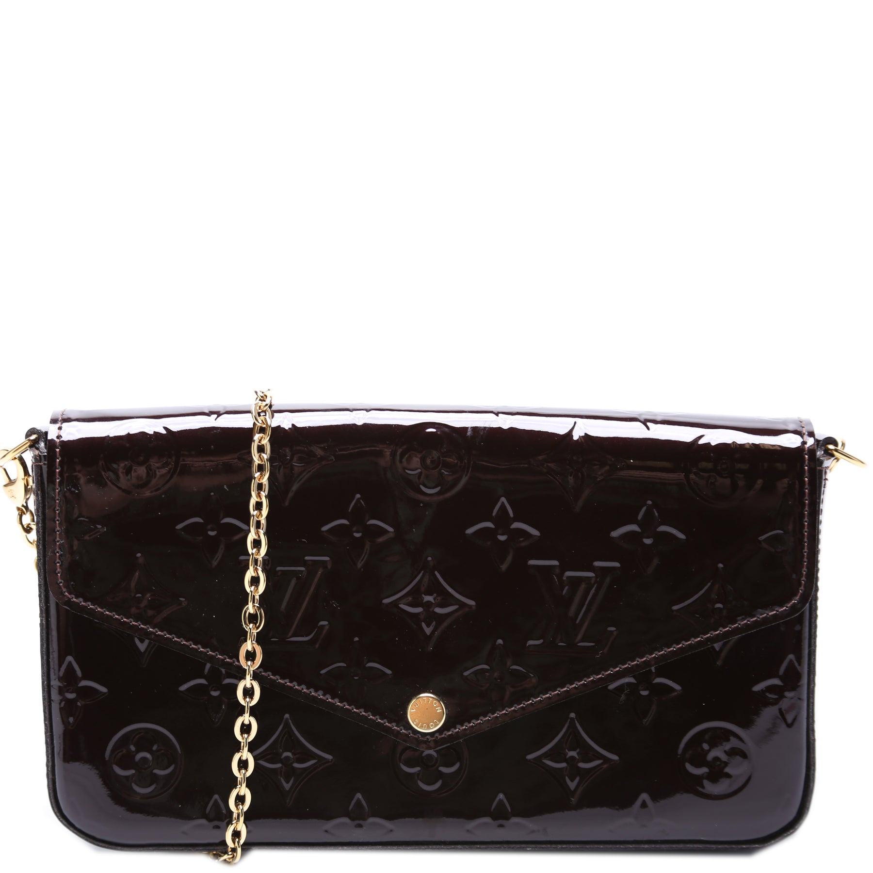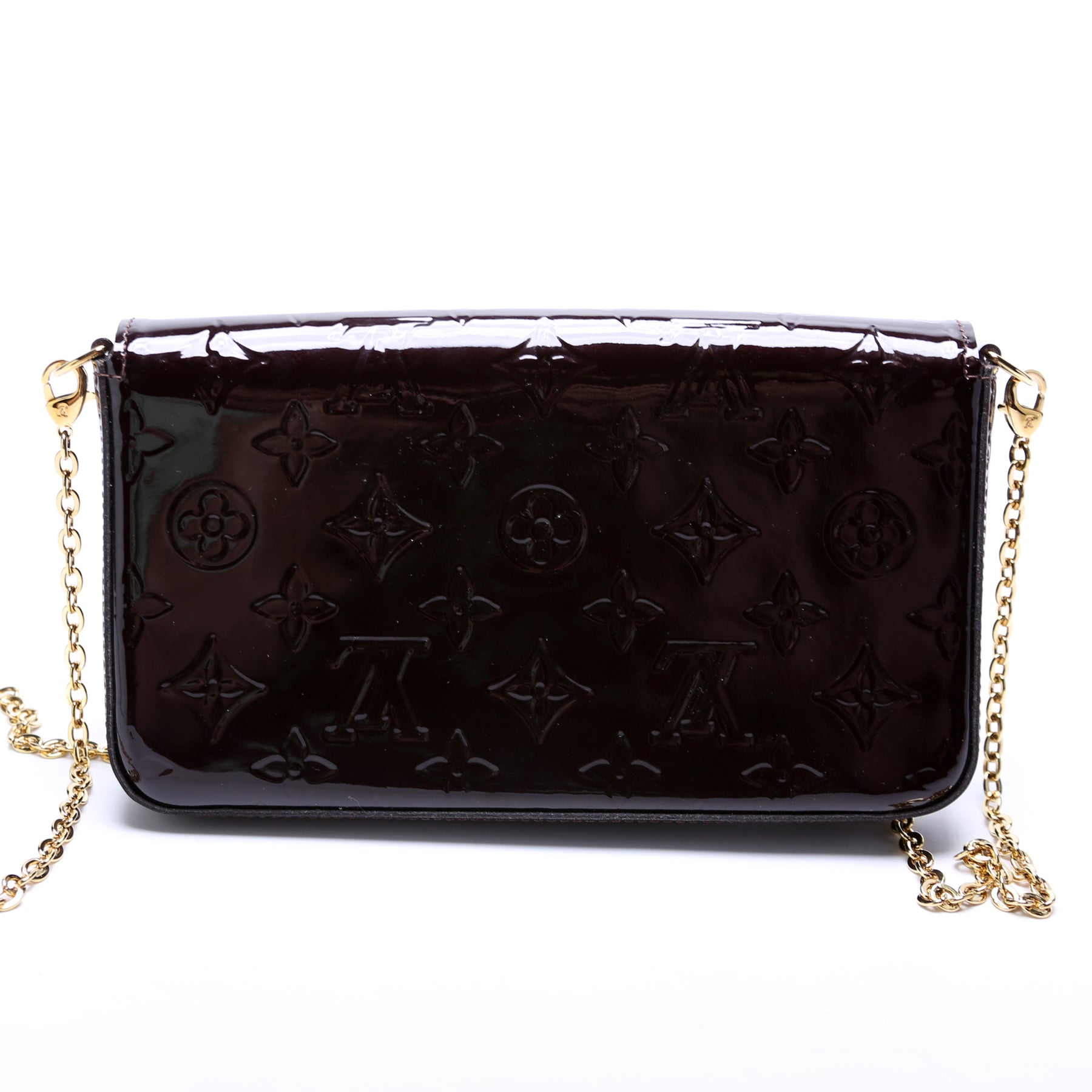 This pre-owned Louis Vuitton Pochette Felicie is guaranteed 100% authentic. The exterior is in the classic Louis Vuitton Vernis leather.