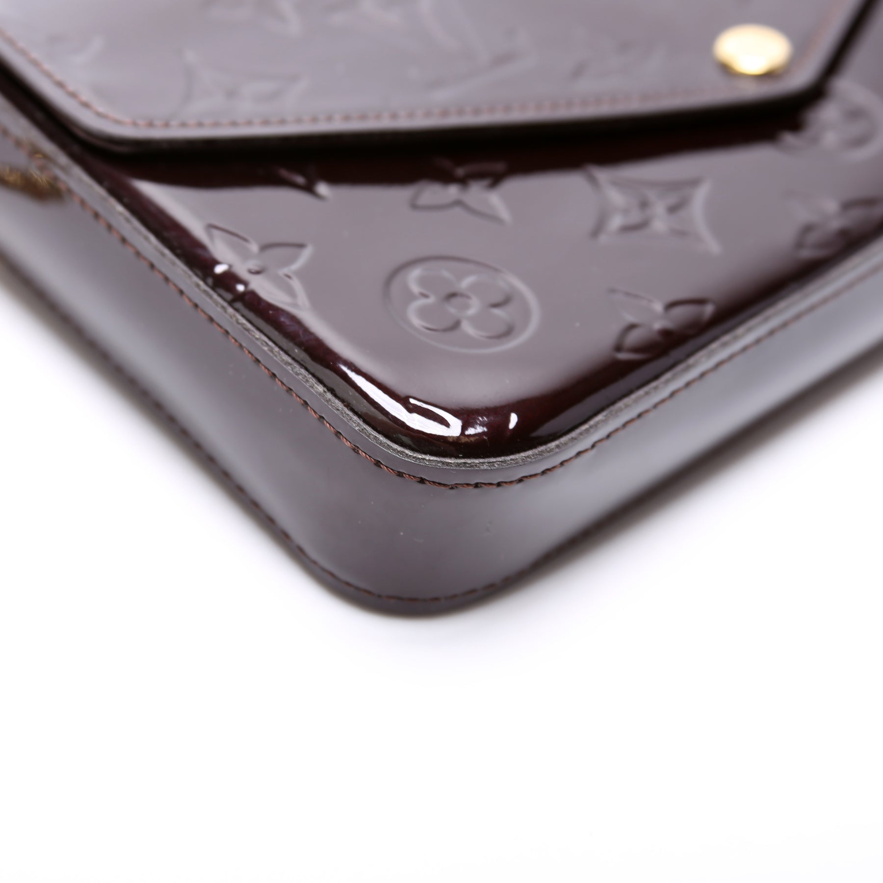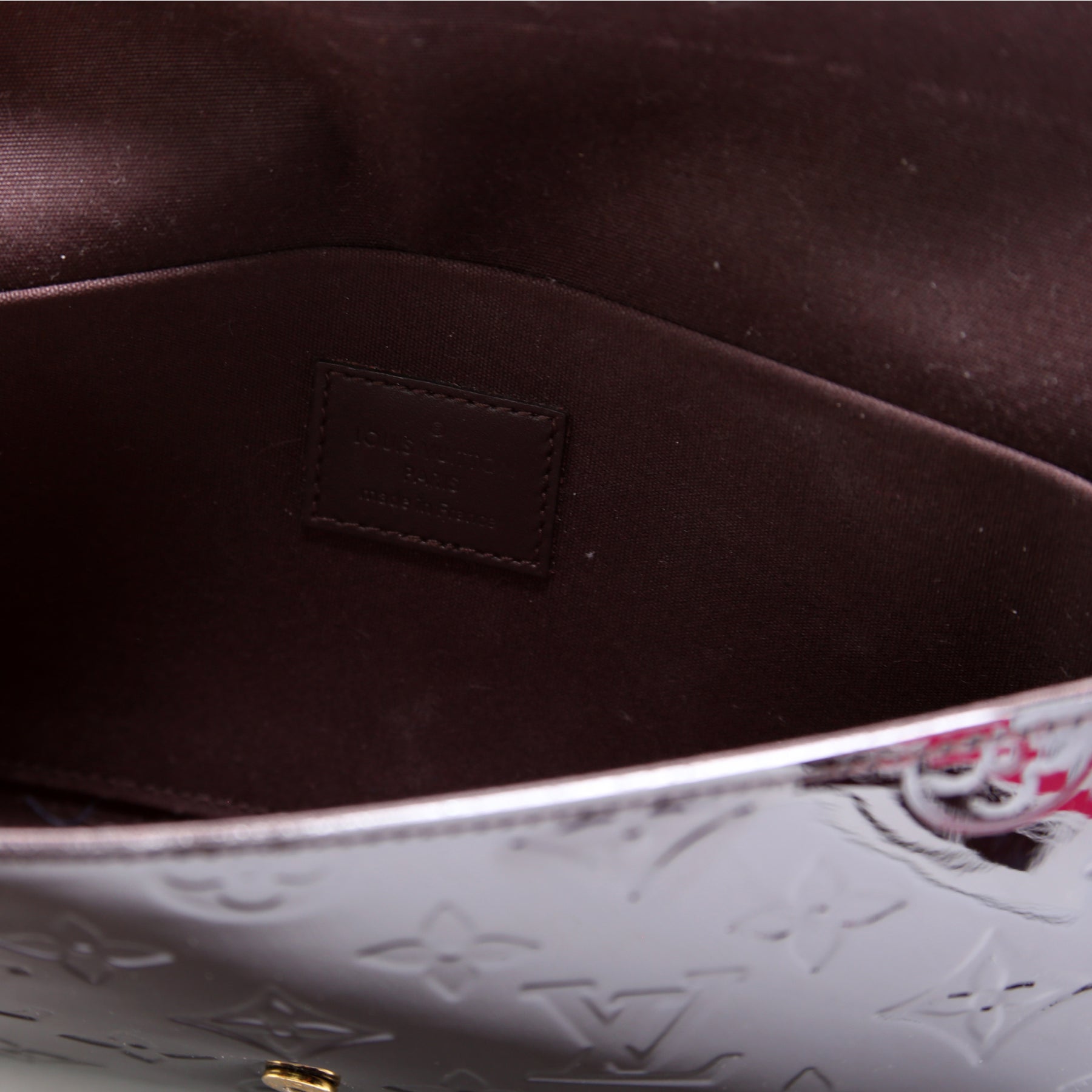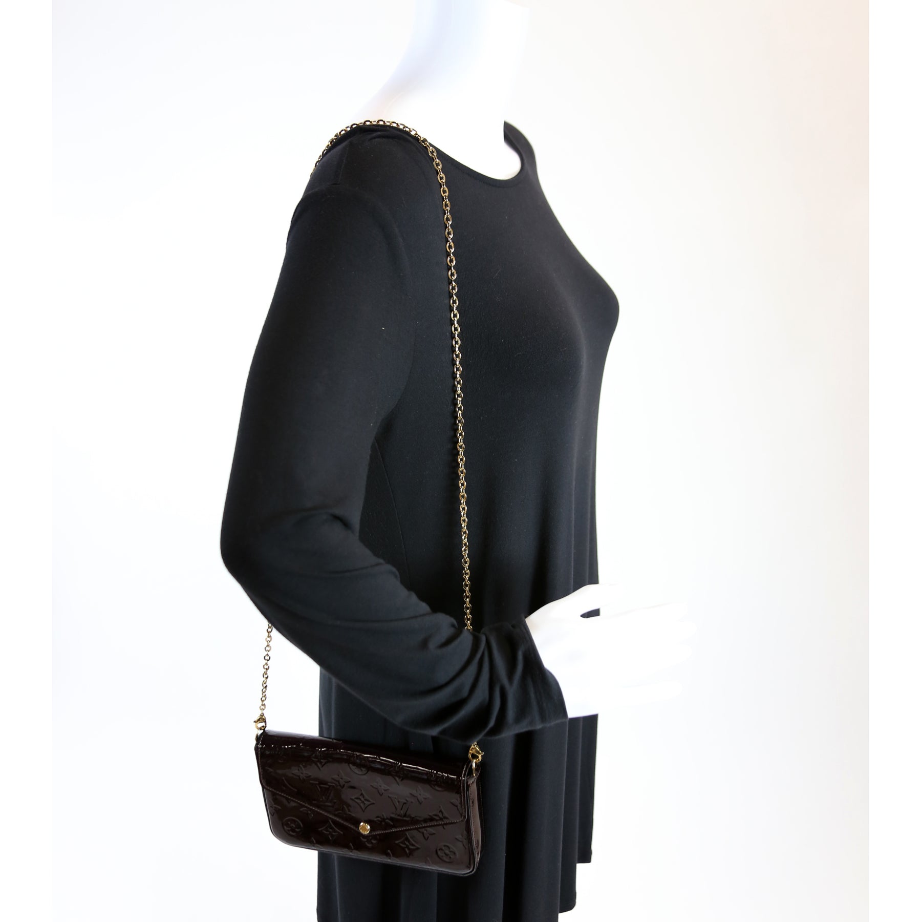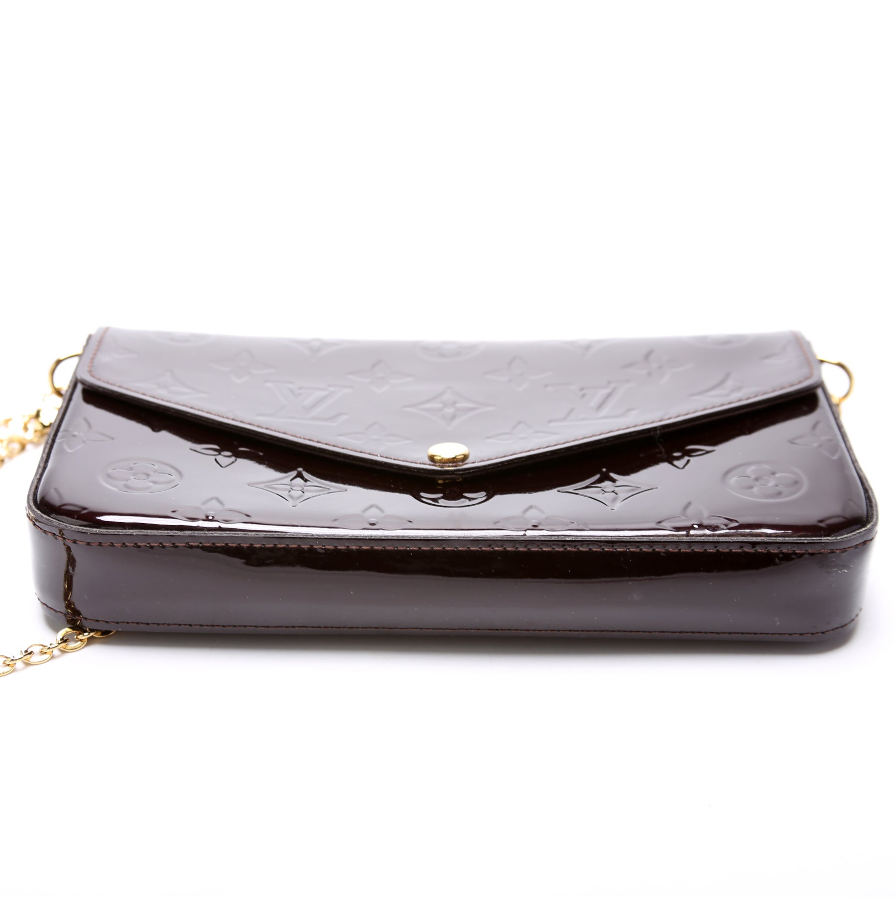 This pre-owned Louis Vuitton Pochette Felicie is guaranteed 100% authentic. The exterior is in the classic Louis Vuitton Vernis leather.