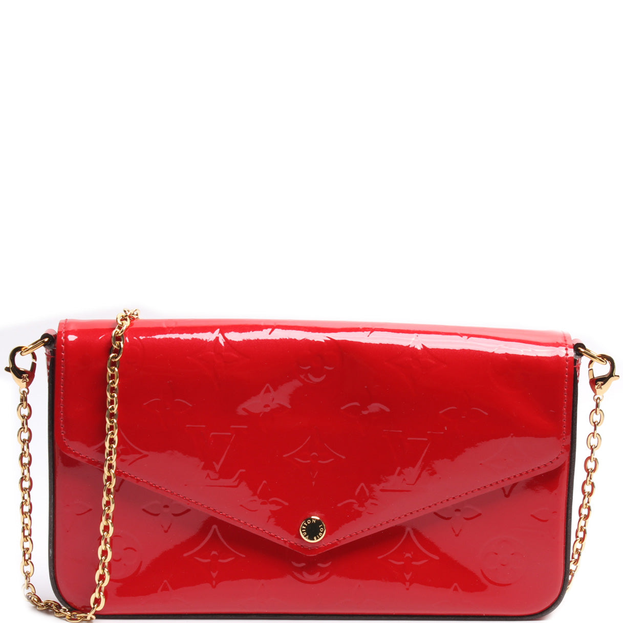 This pre-owned Louis Vuitton Pochette Felicie is guaranteed 100% authentic. The exterior is in the classic Louis Vuitton Vernis leather.