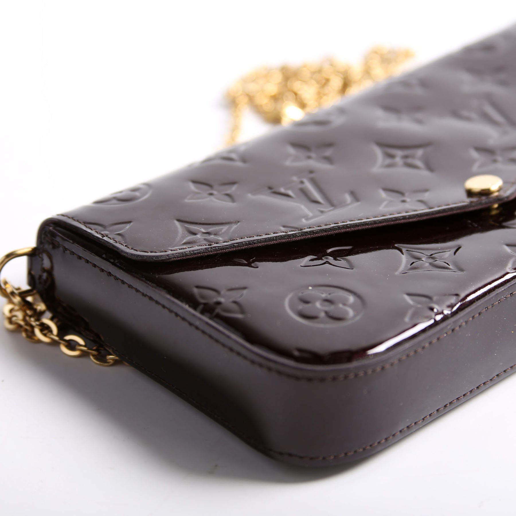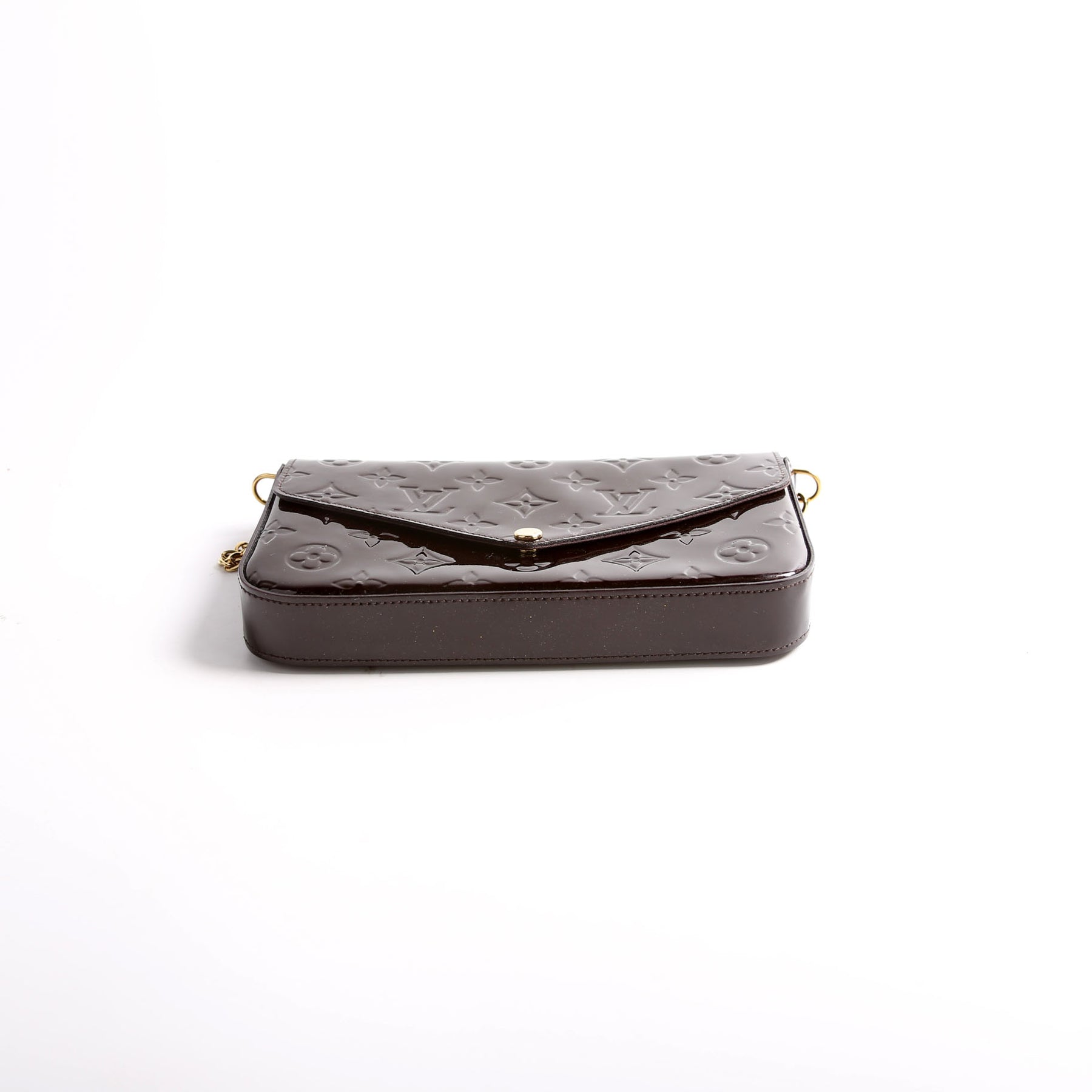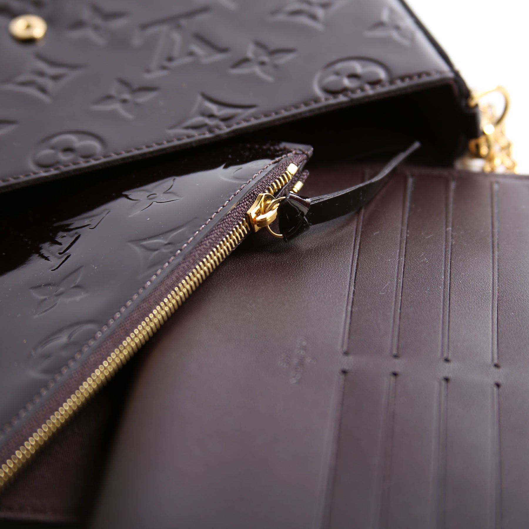 This pre-owned Louis Vuitton Pochette Felicie is guaranteed 100% authentic. The exterior is in the classic Louis Vuitton Vernis leather.