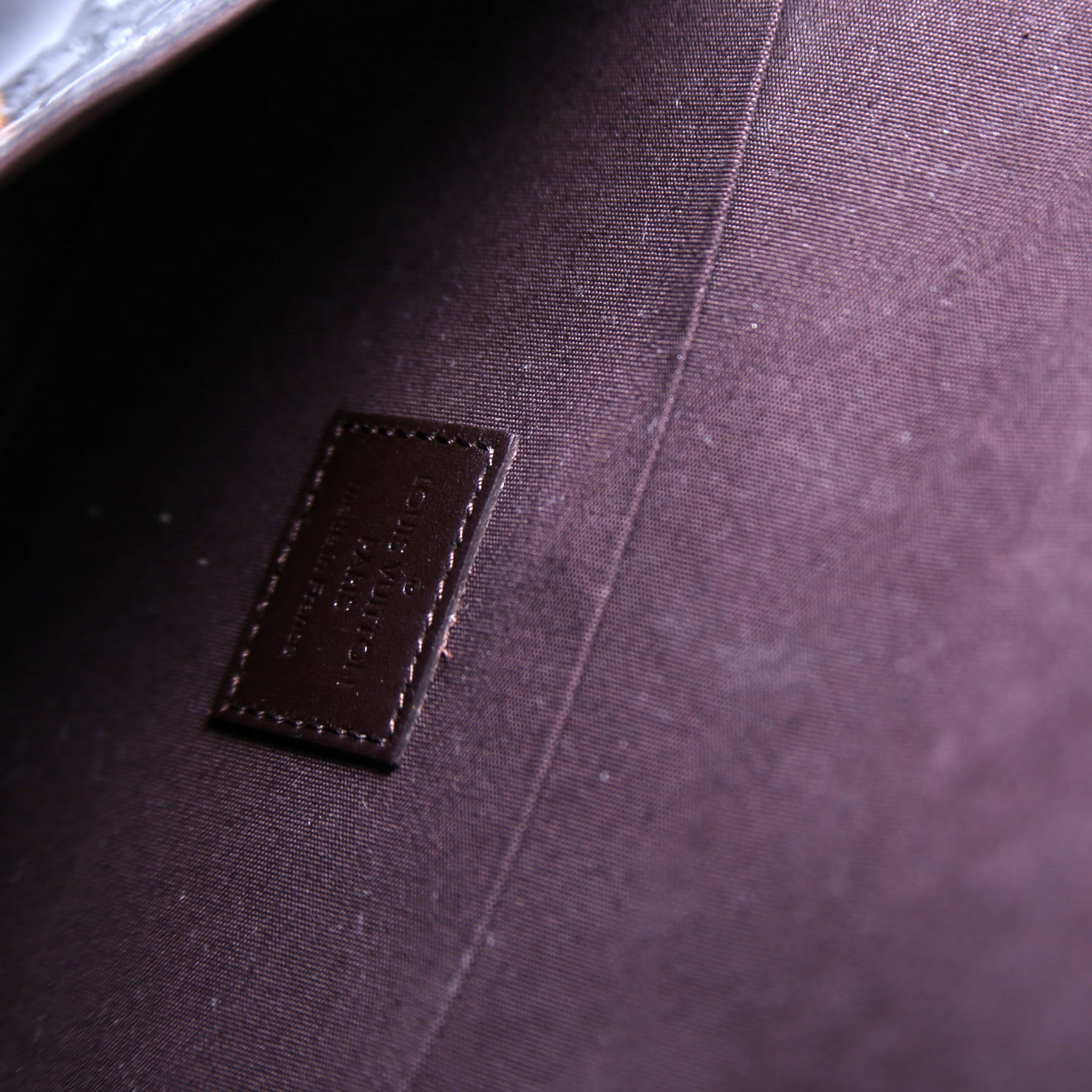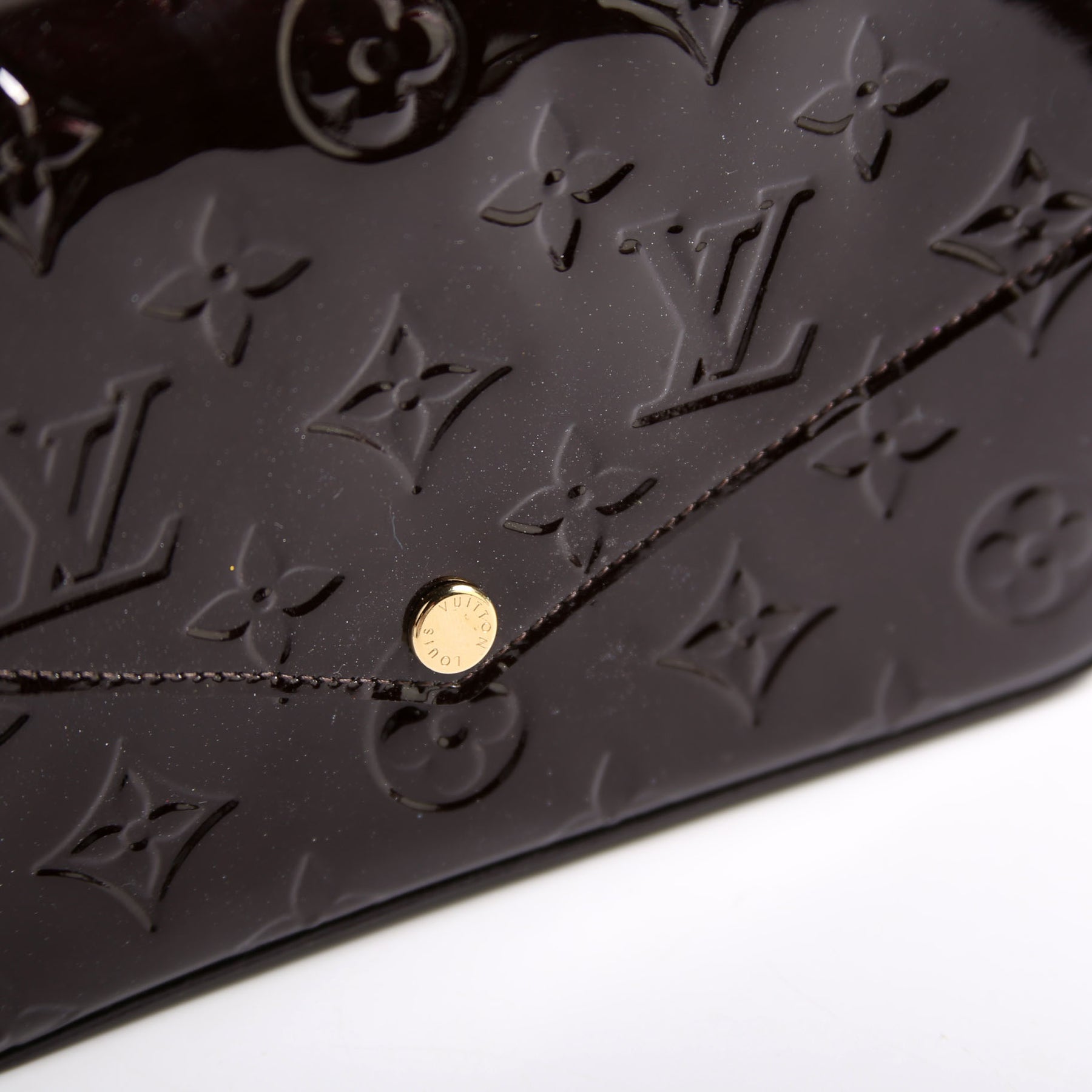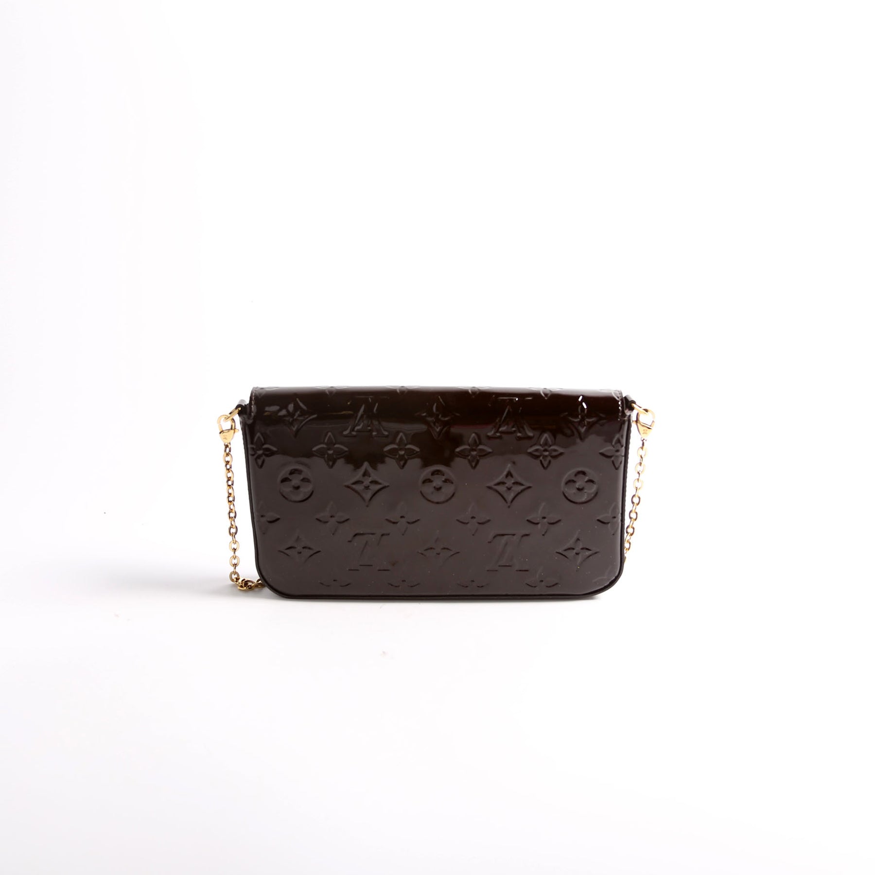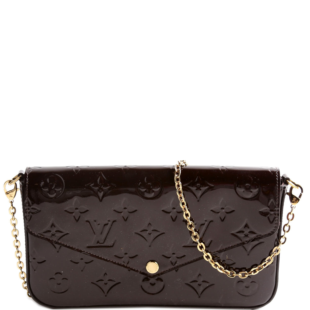 This pre-owned Louis Vuitton Pochette Felicie is guaranteed 100% authentic. The exterior is in the classic Louis Vuitton Vernis leather.