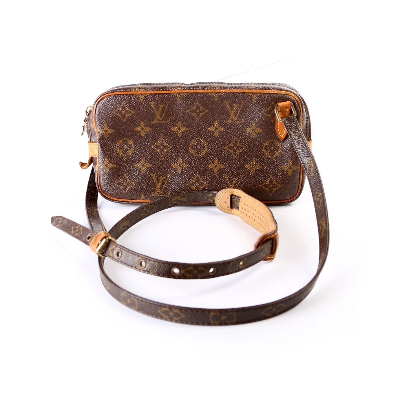 This pre-owned Louis Vuitton Pochette Marly Bandouliere is guaranteed 100% authentic. The exterior is in the classic Louis Vuitton Monogram coated canvas.