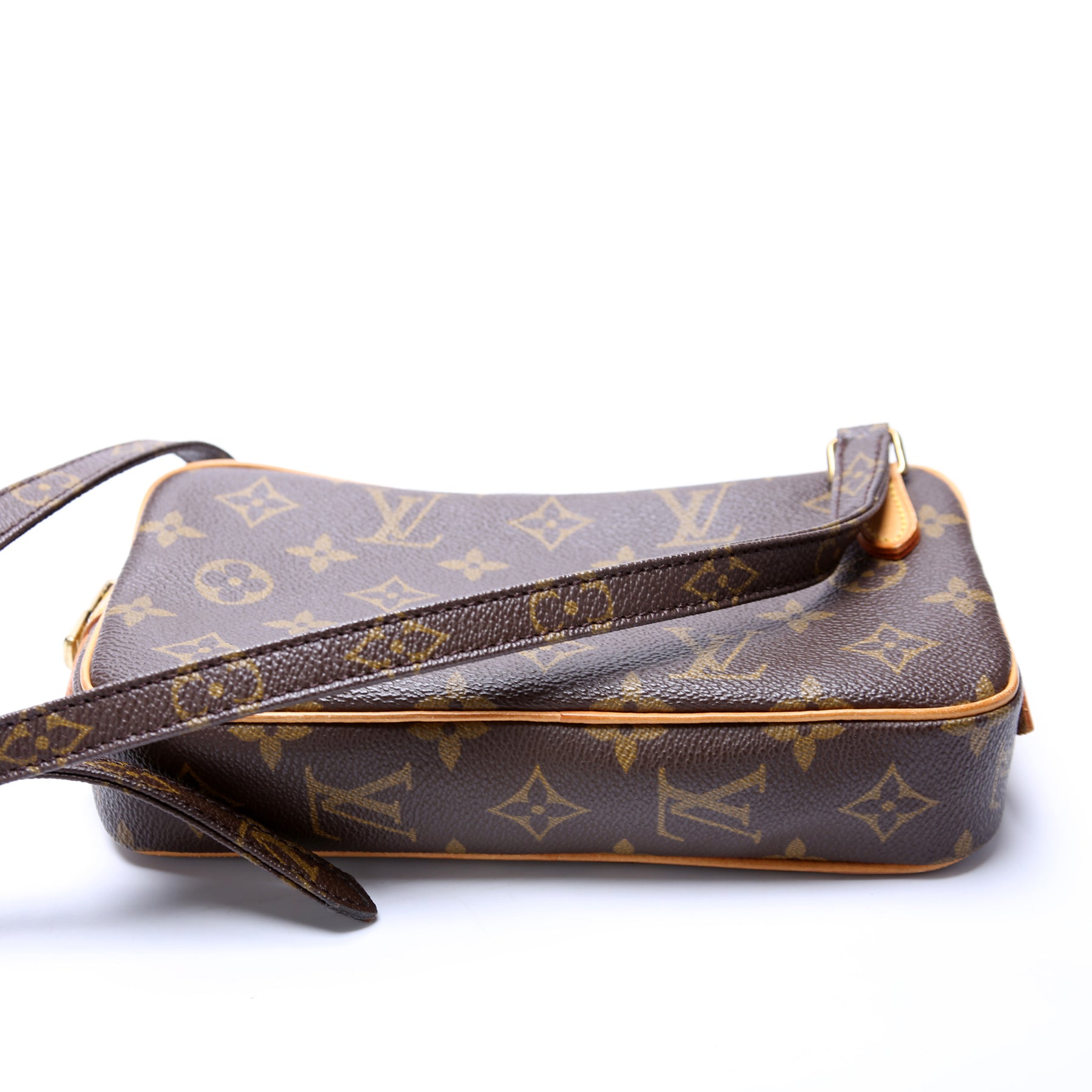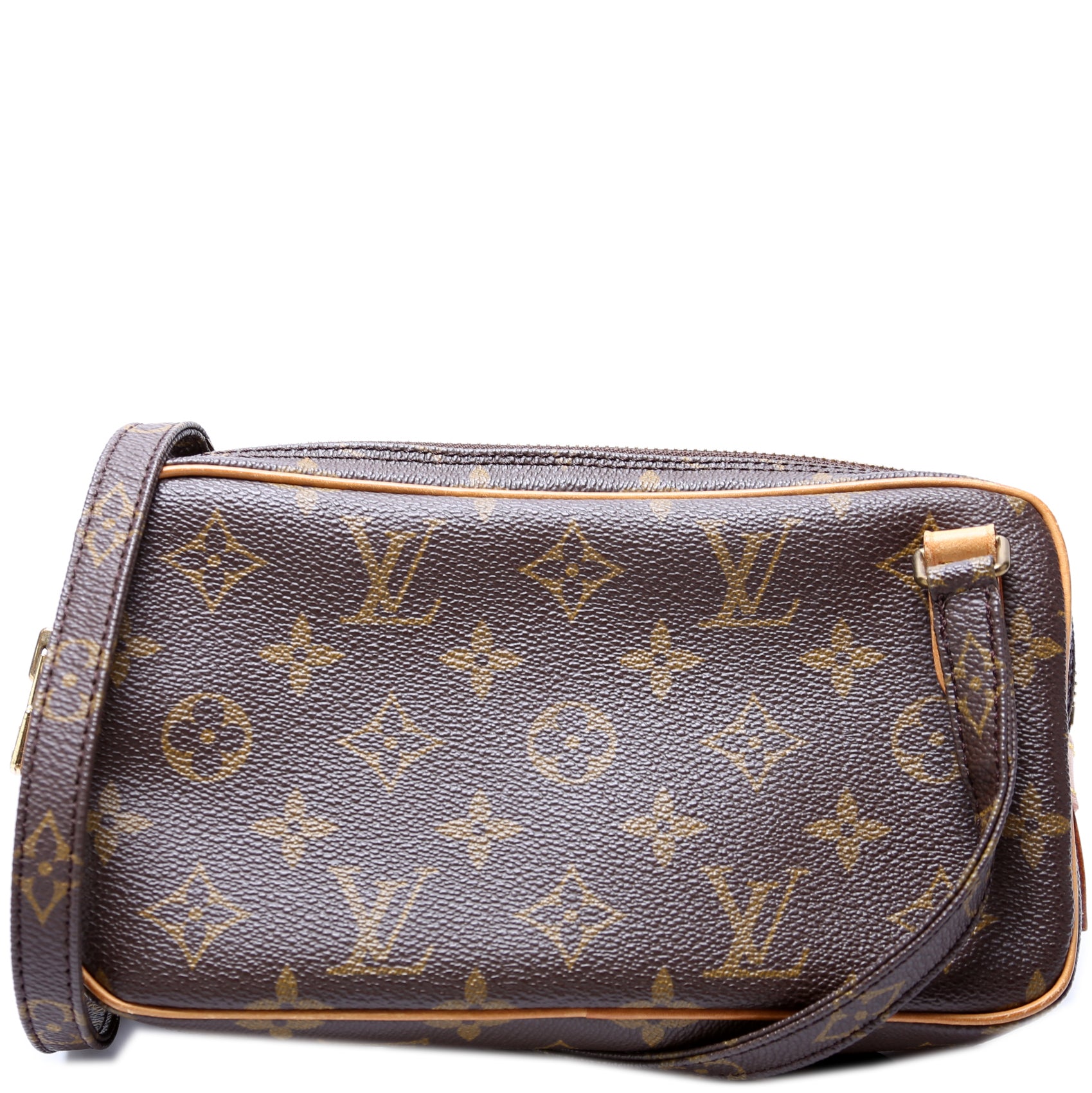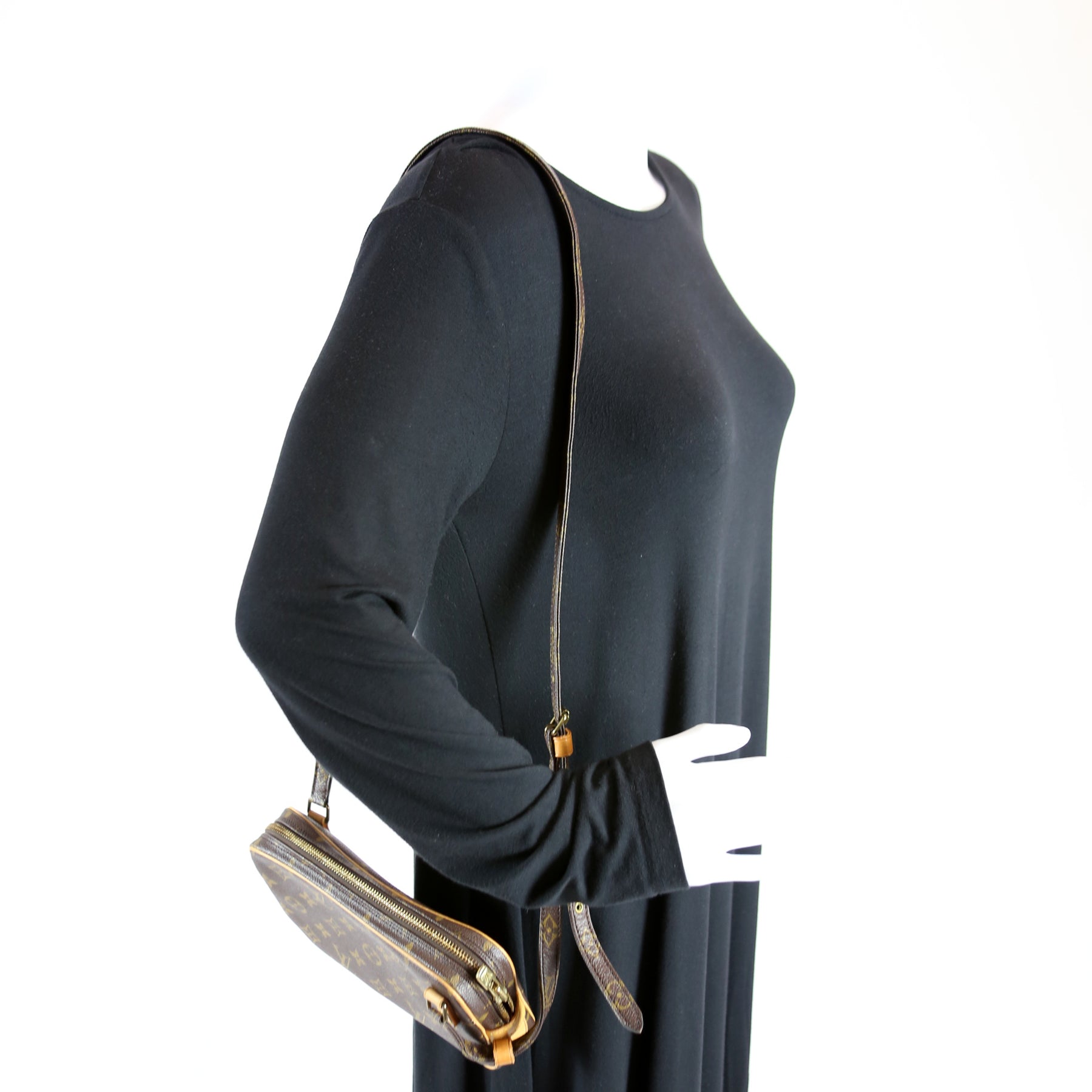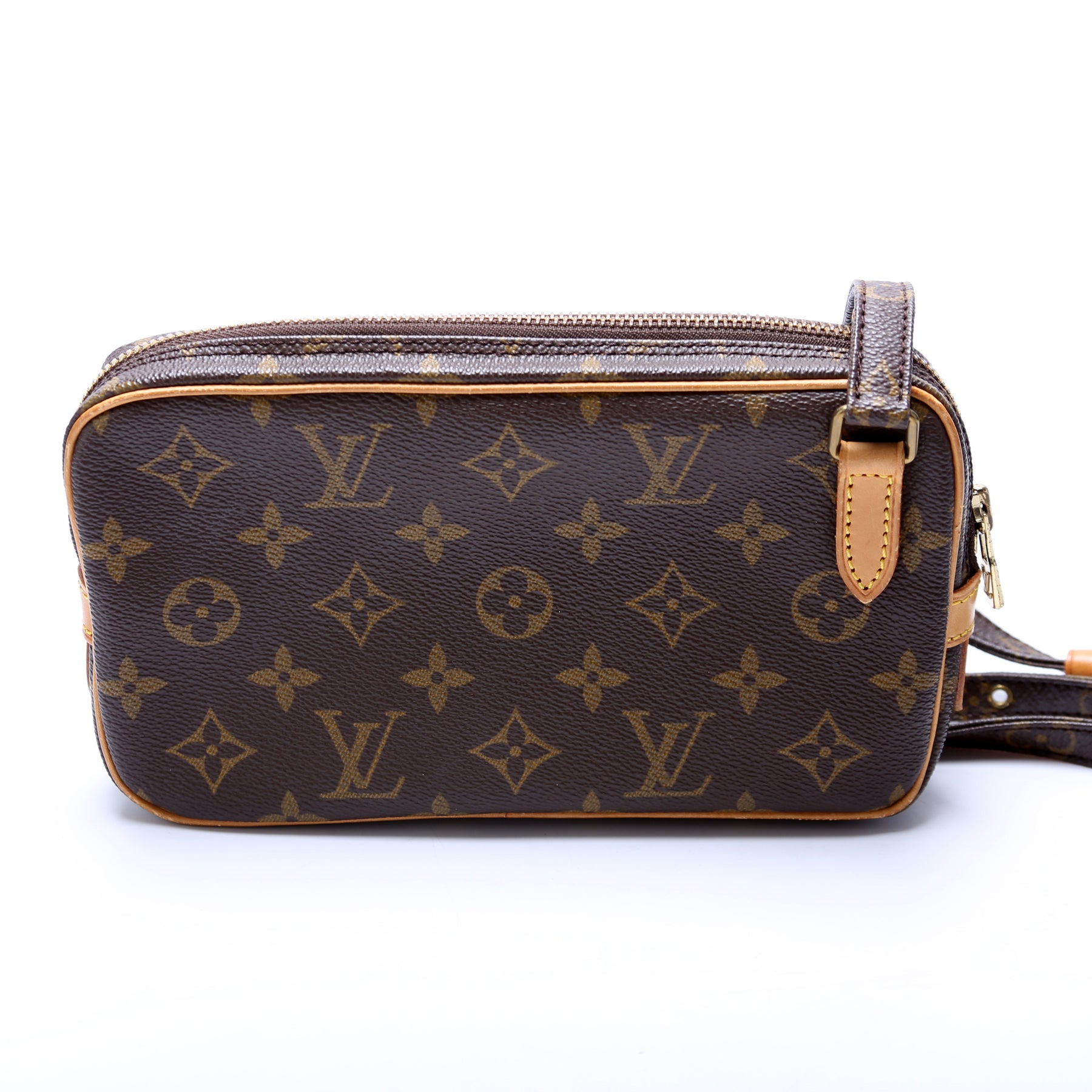 This pre-owned Louis Vuitton Pochette Marly is guaranteed 100% authentic. The exterior is in the classic Louis Vuitton Monogram coated canvas.