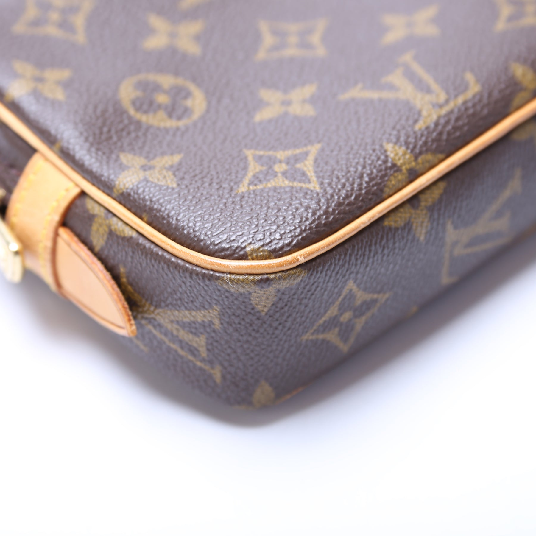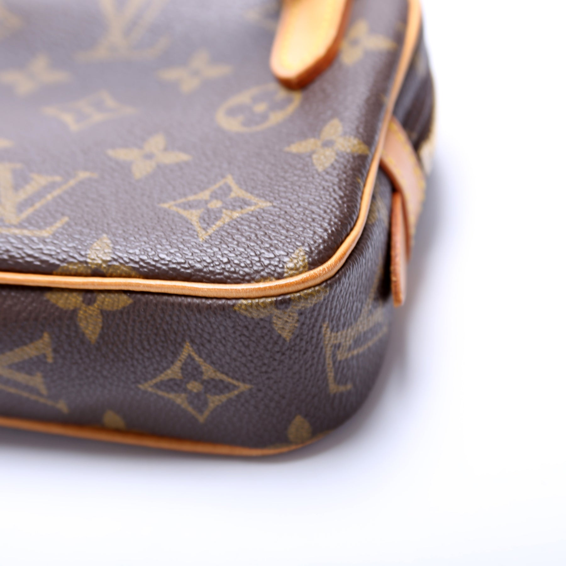 Exterior: The exterior Monogram coated canvas is free of any rips or cracks. The leather trim shows minor scuffs.
