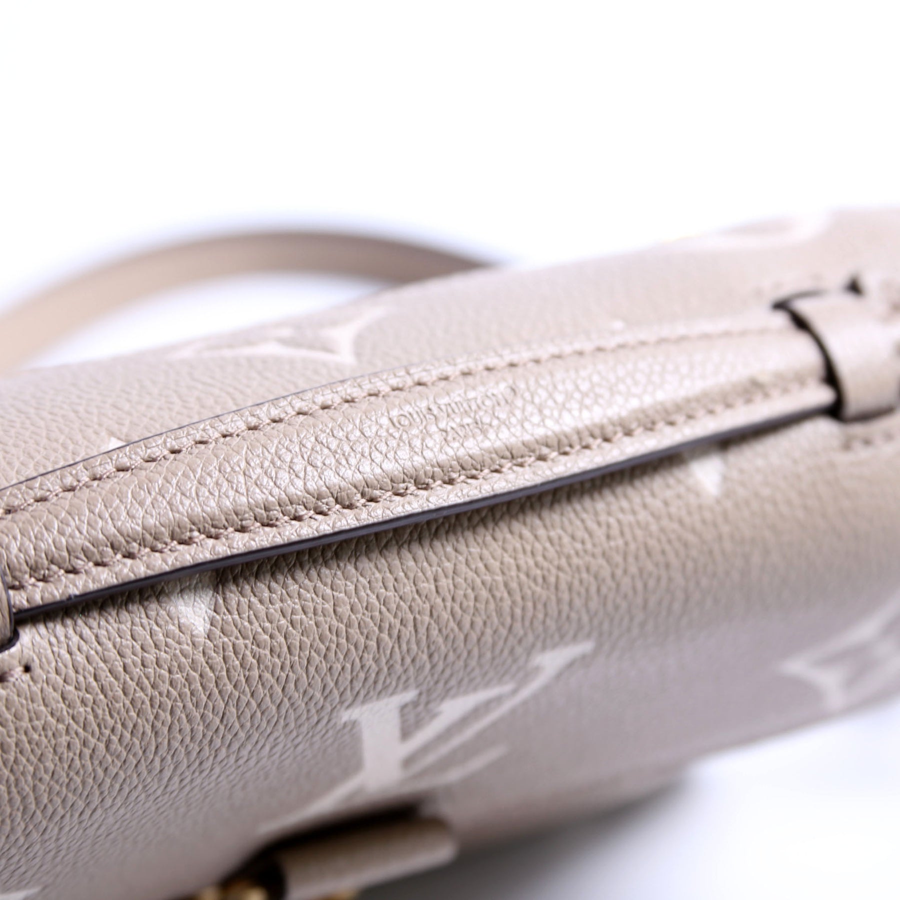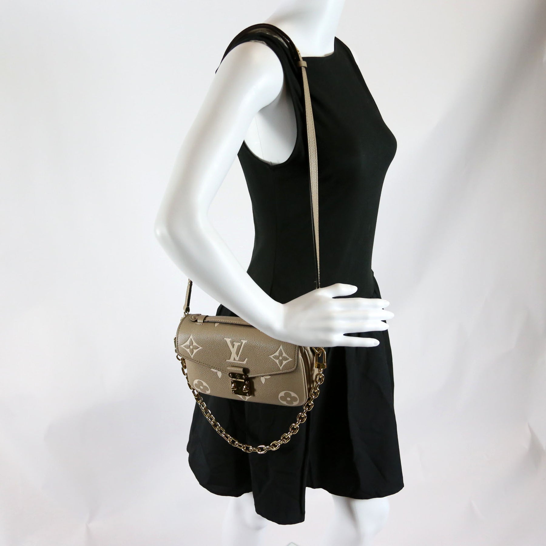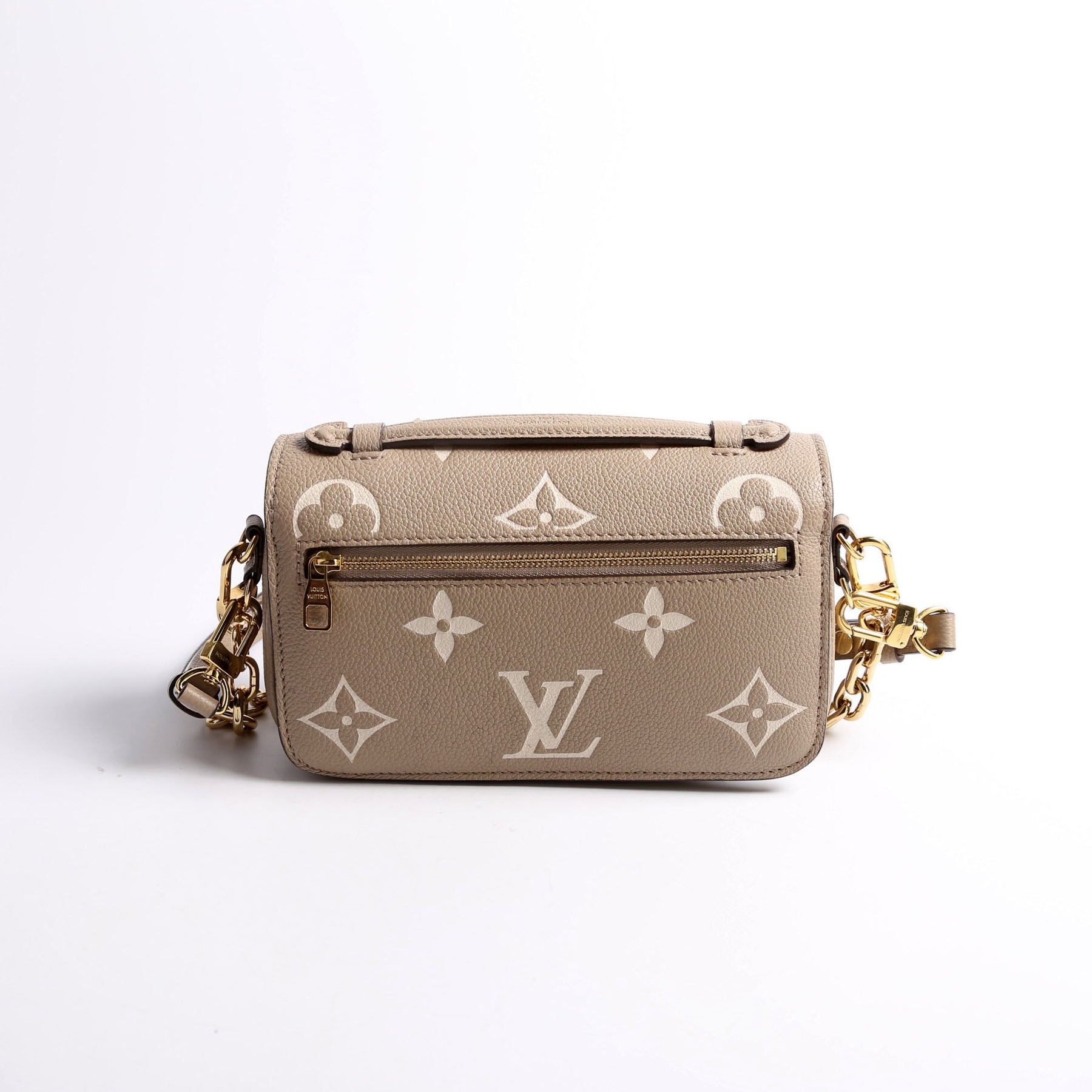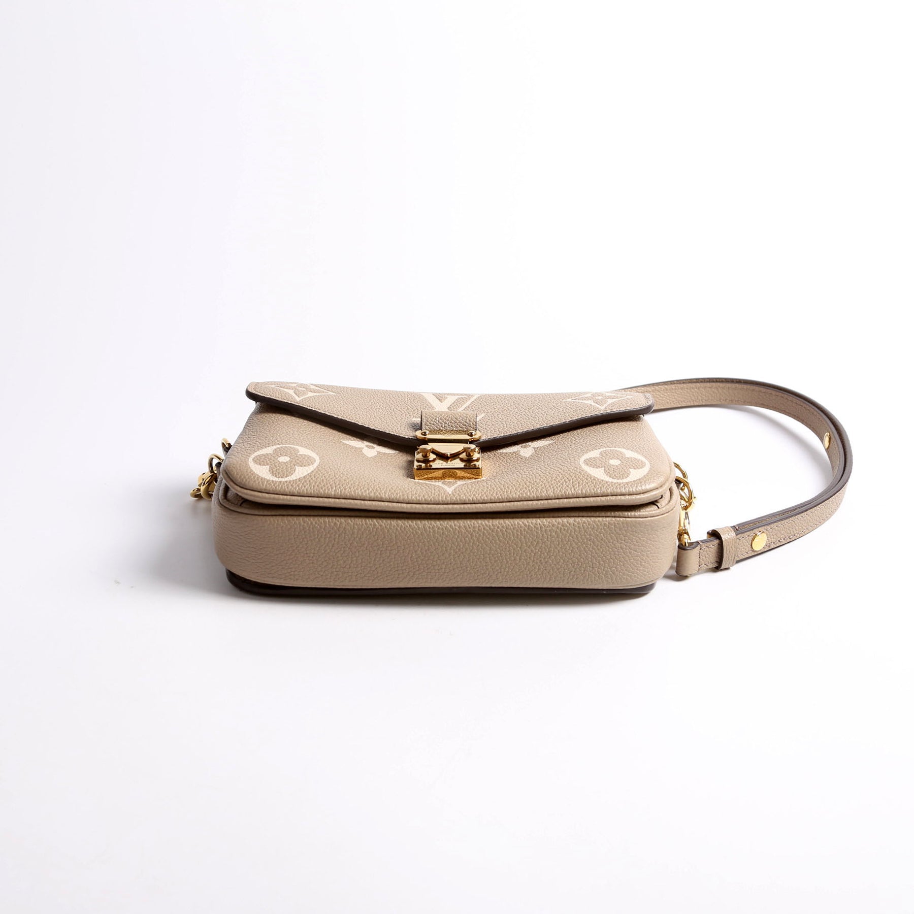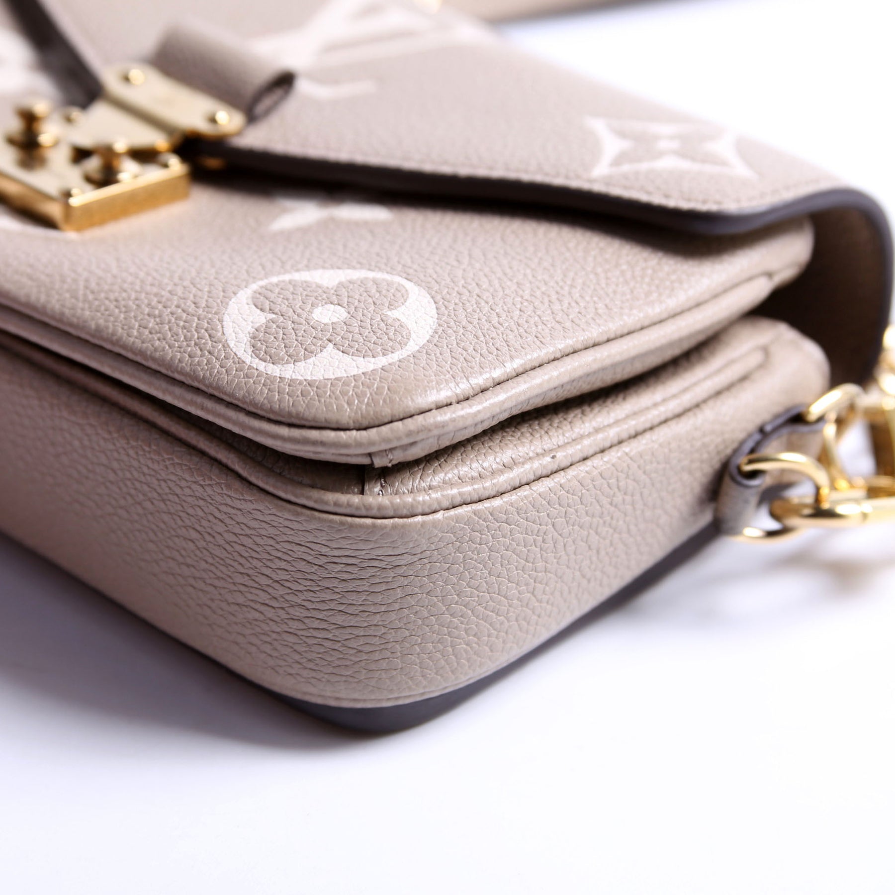 This pre-owned Louis Vuitton Pochette Metis East West is guaranteed 100% authentic. The exterior is in the classic Louis Vuitton Monogram empreinte.