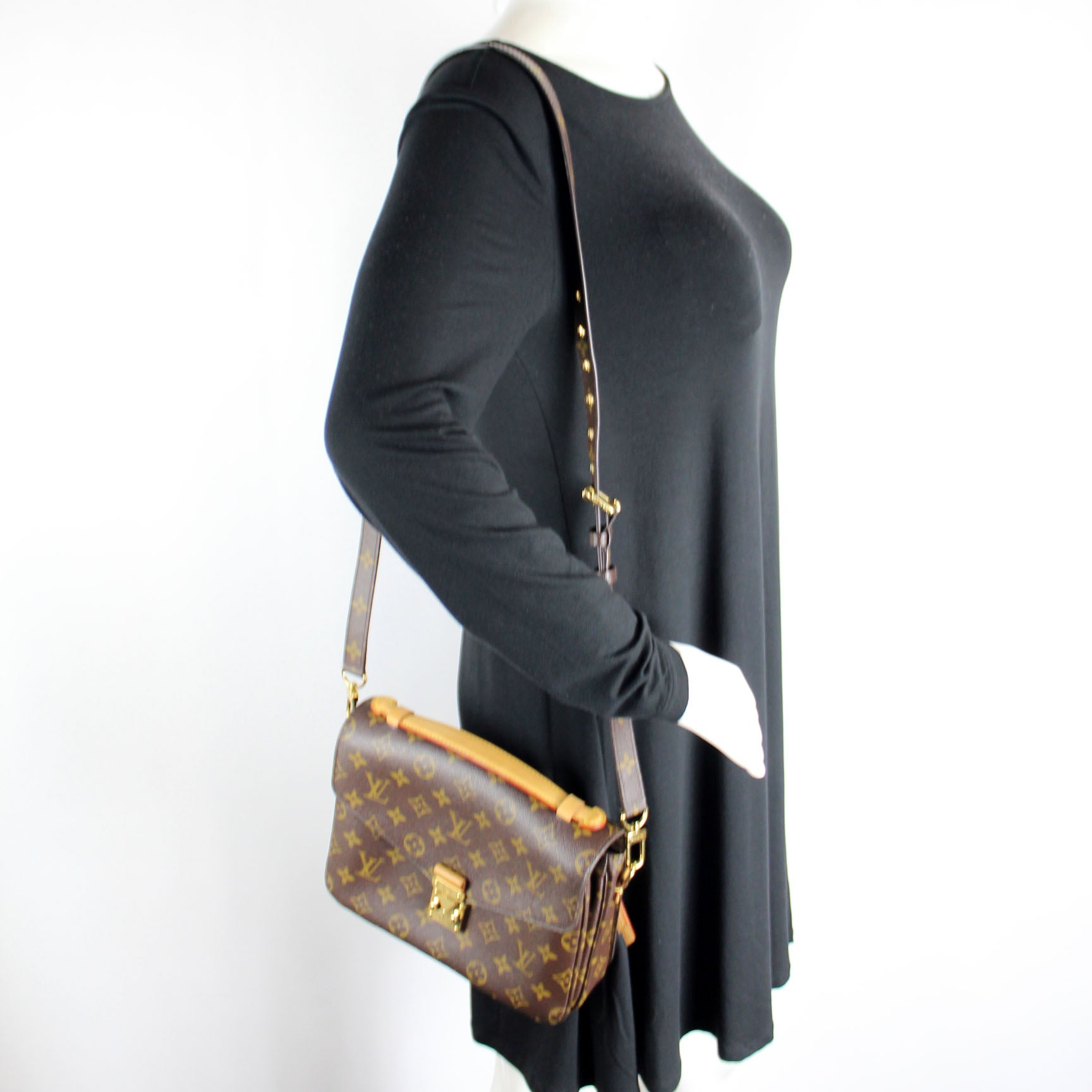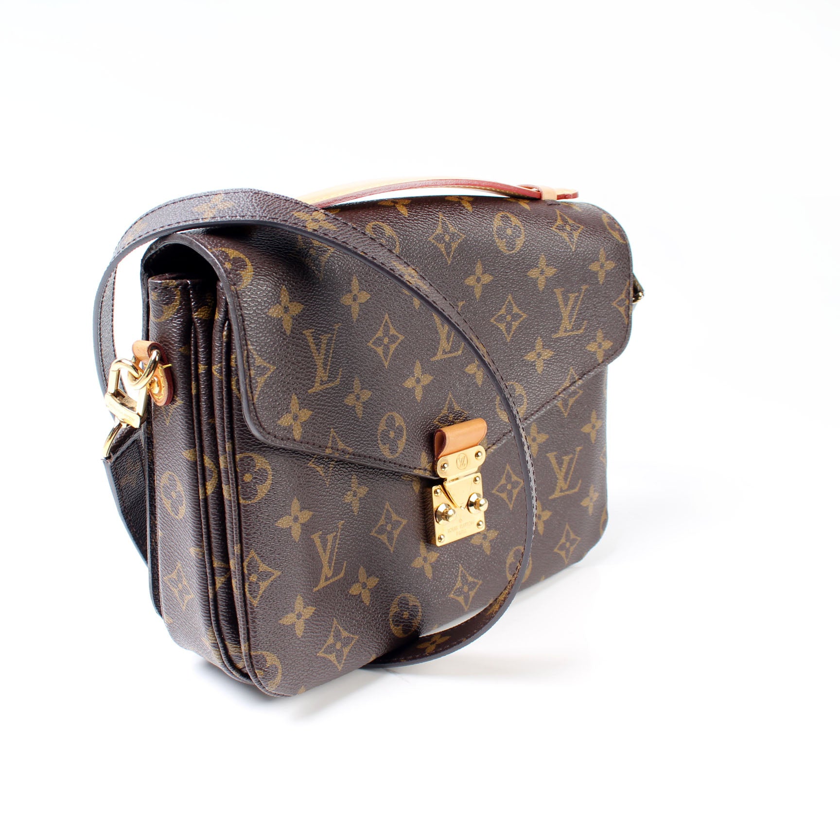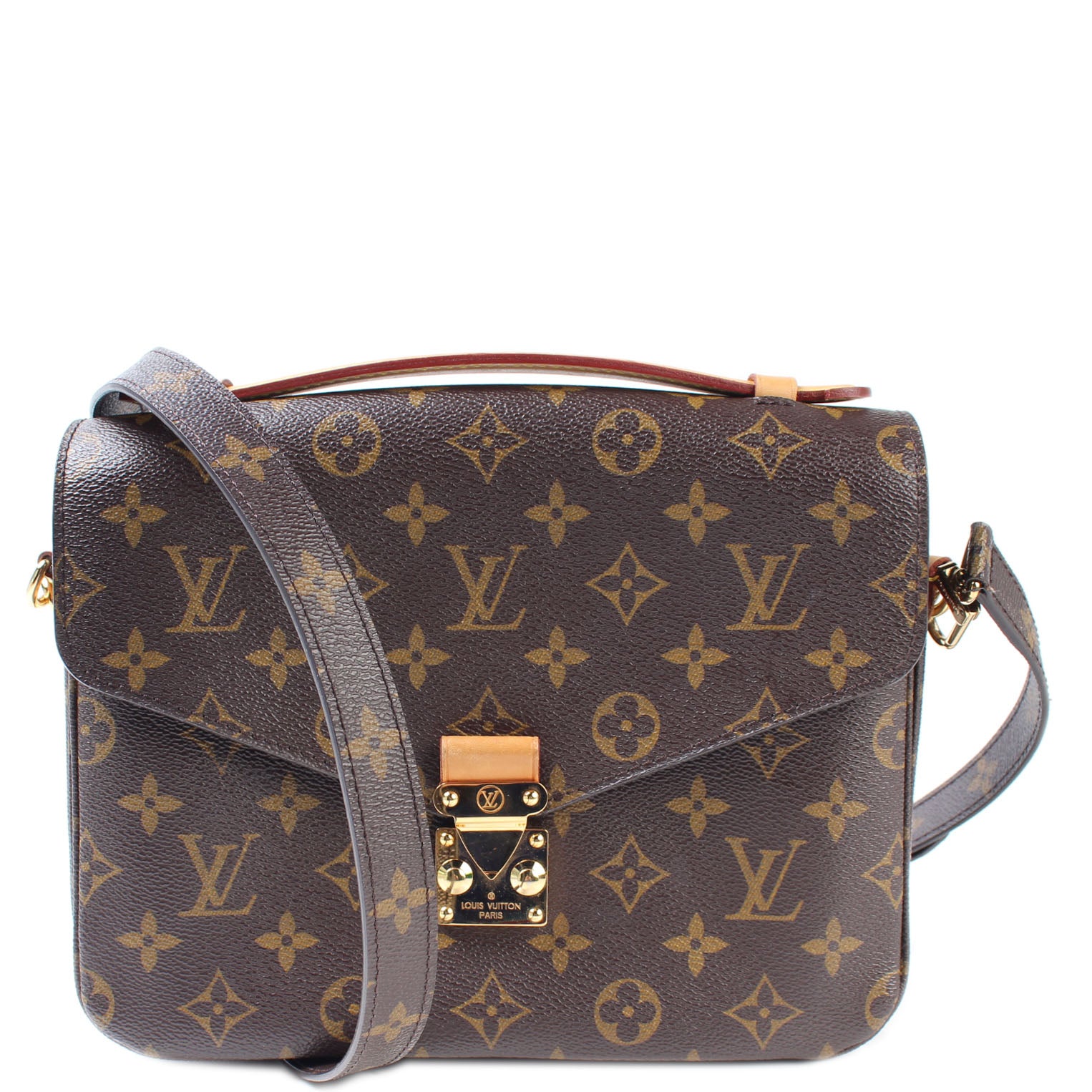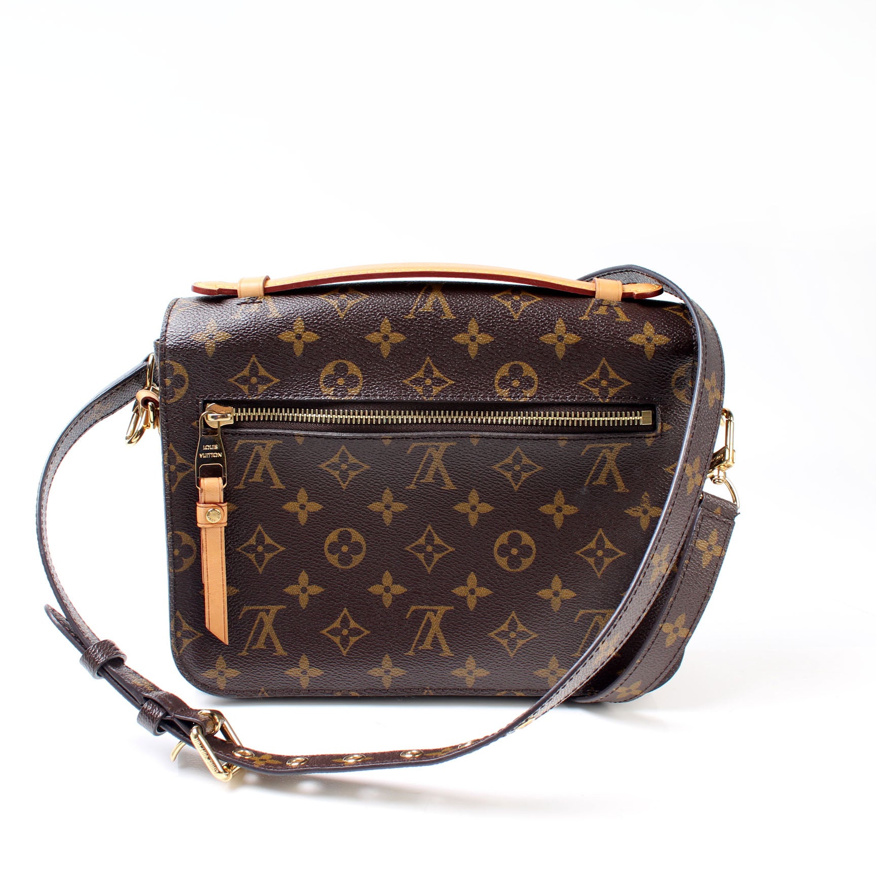This pre-owned Louis Vuitton Pochette Metis is guaranteed 100% authentic. The exterior is in the classic Louis Vuitton Monogram coated canvas.