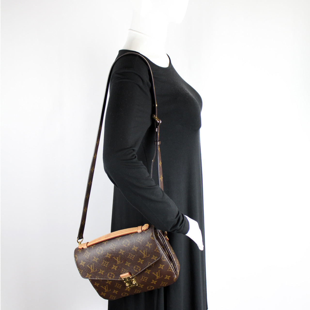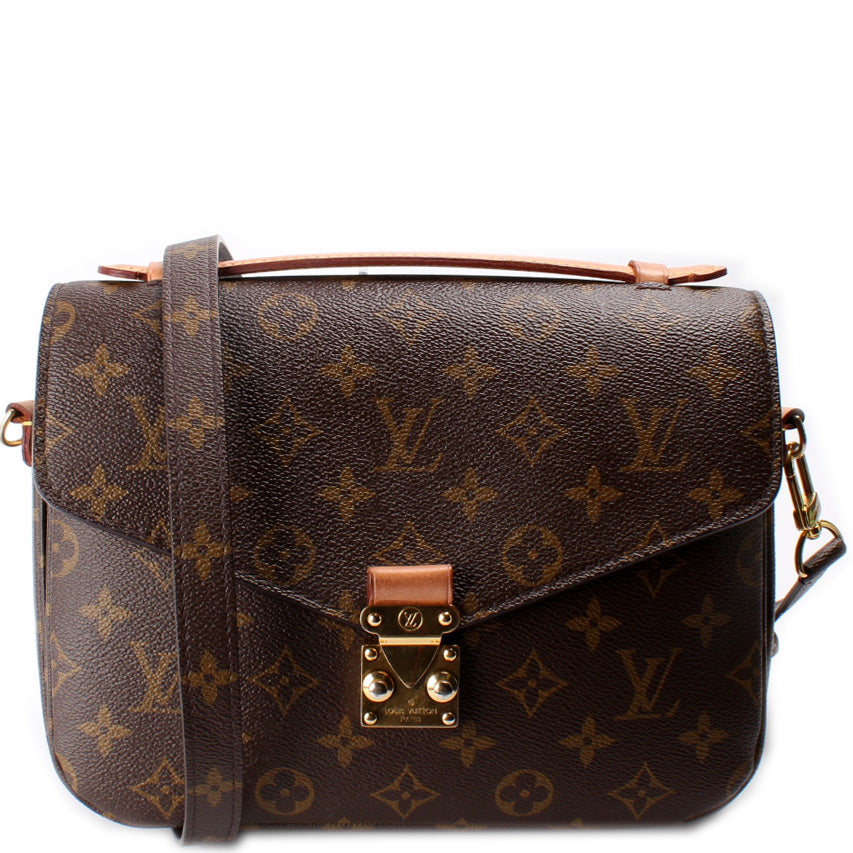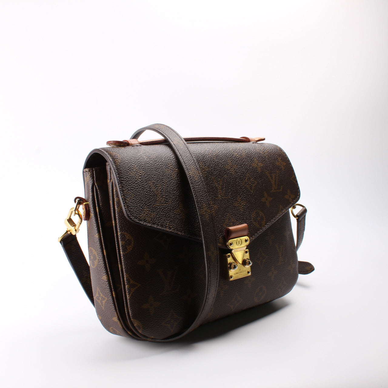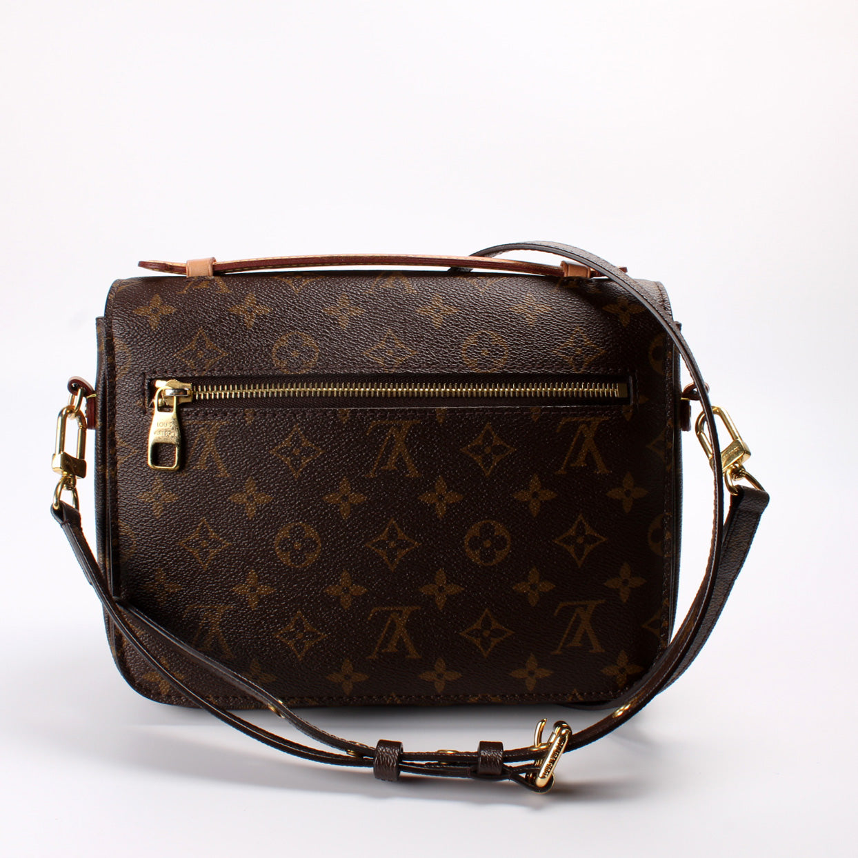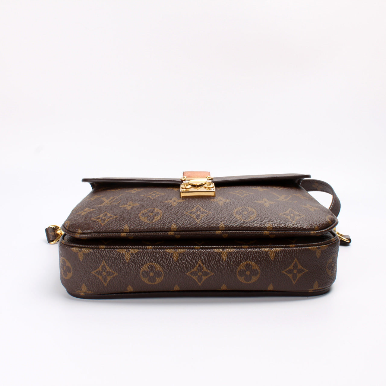 This pre-owned Louis Vuitton Pochette Metis is guaranteed 100% authentic. The exterior is in the classic Louis Vuitton Monogram coated canvas.