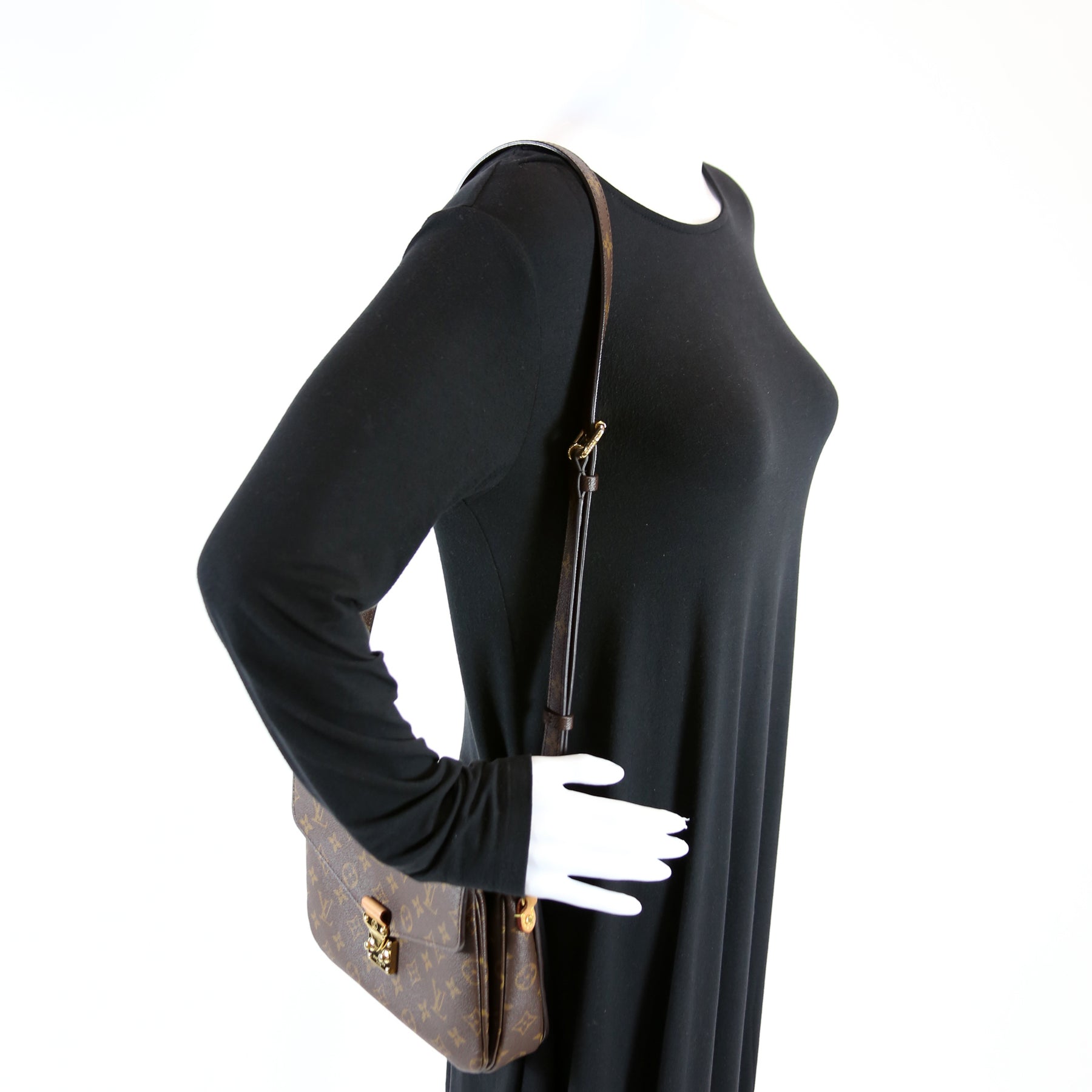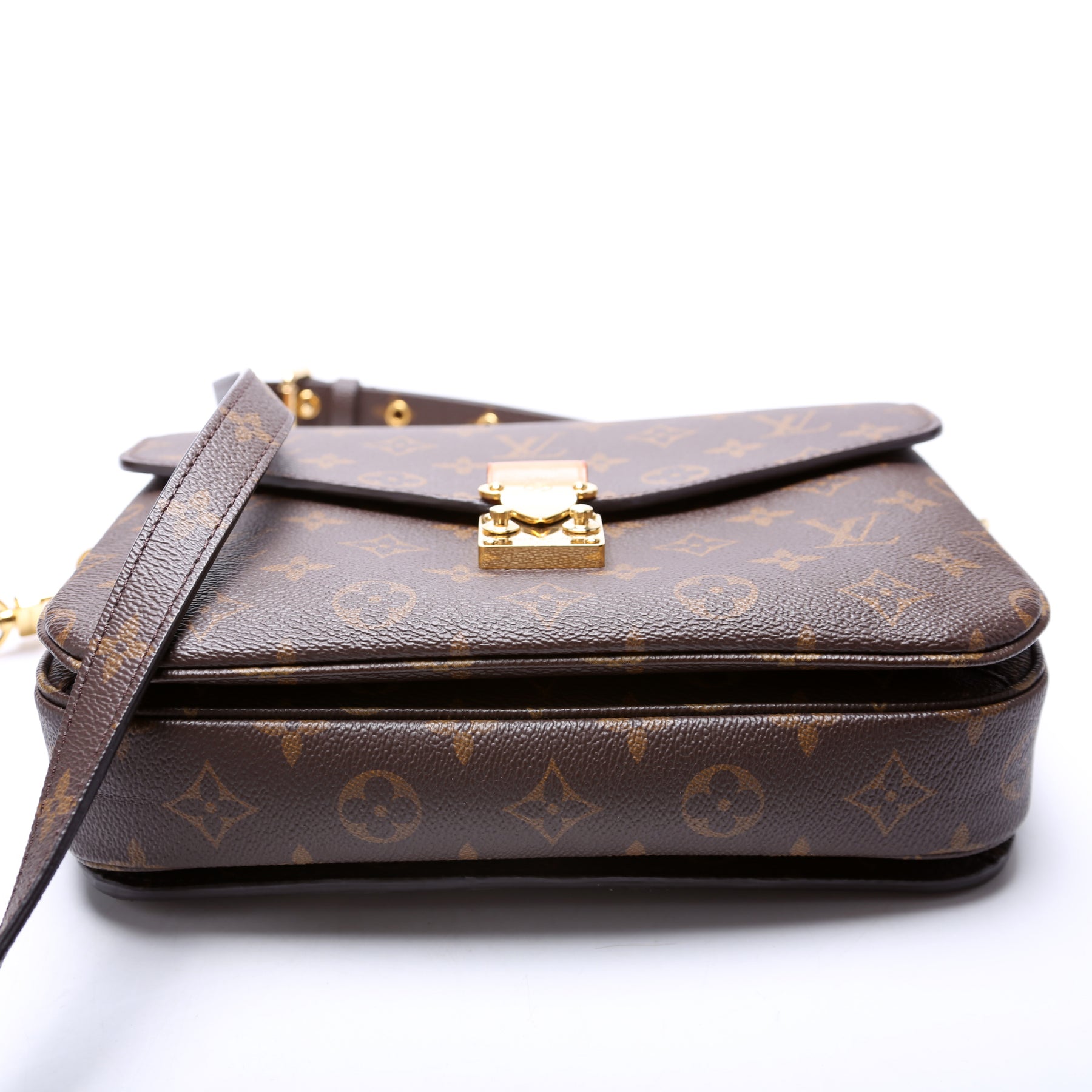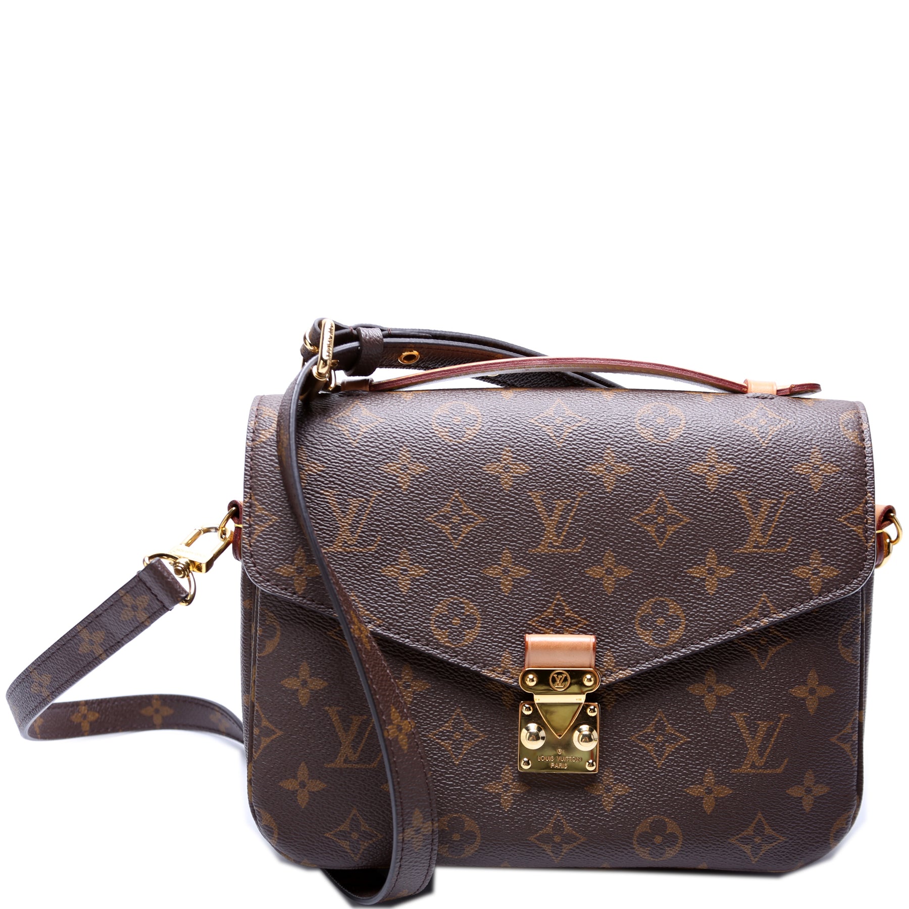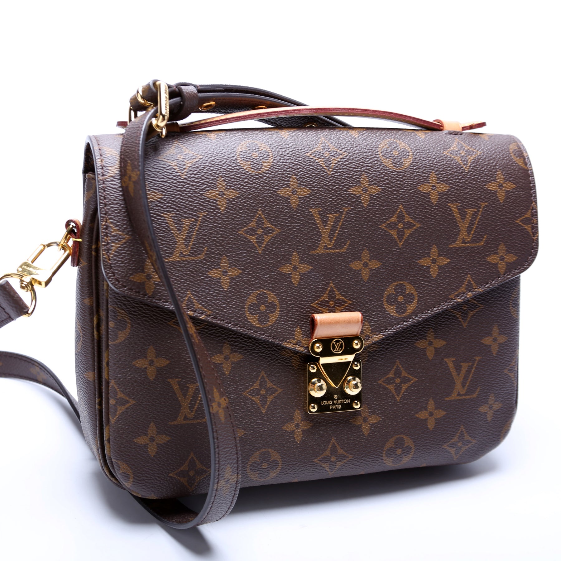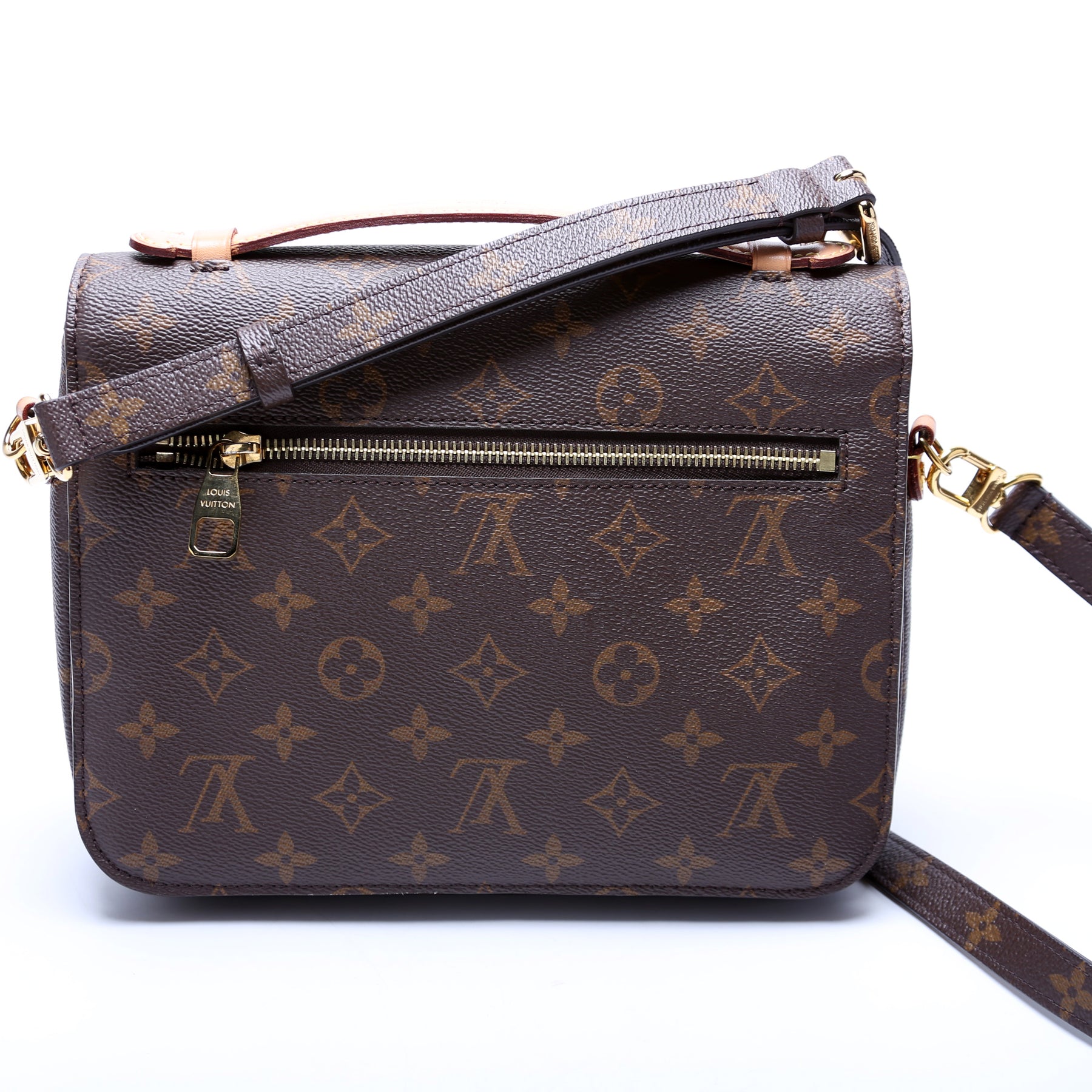 This pre-owned Louis Vuitton Pochette Metis is guaranteed 100% authentic. The exterior is in the classic Louis Vuitton Monogram coated canvas.