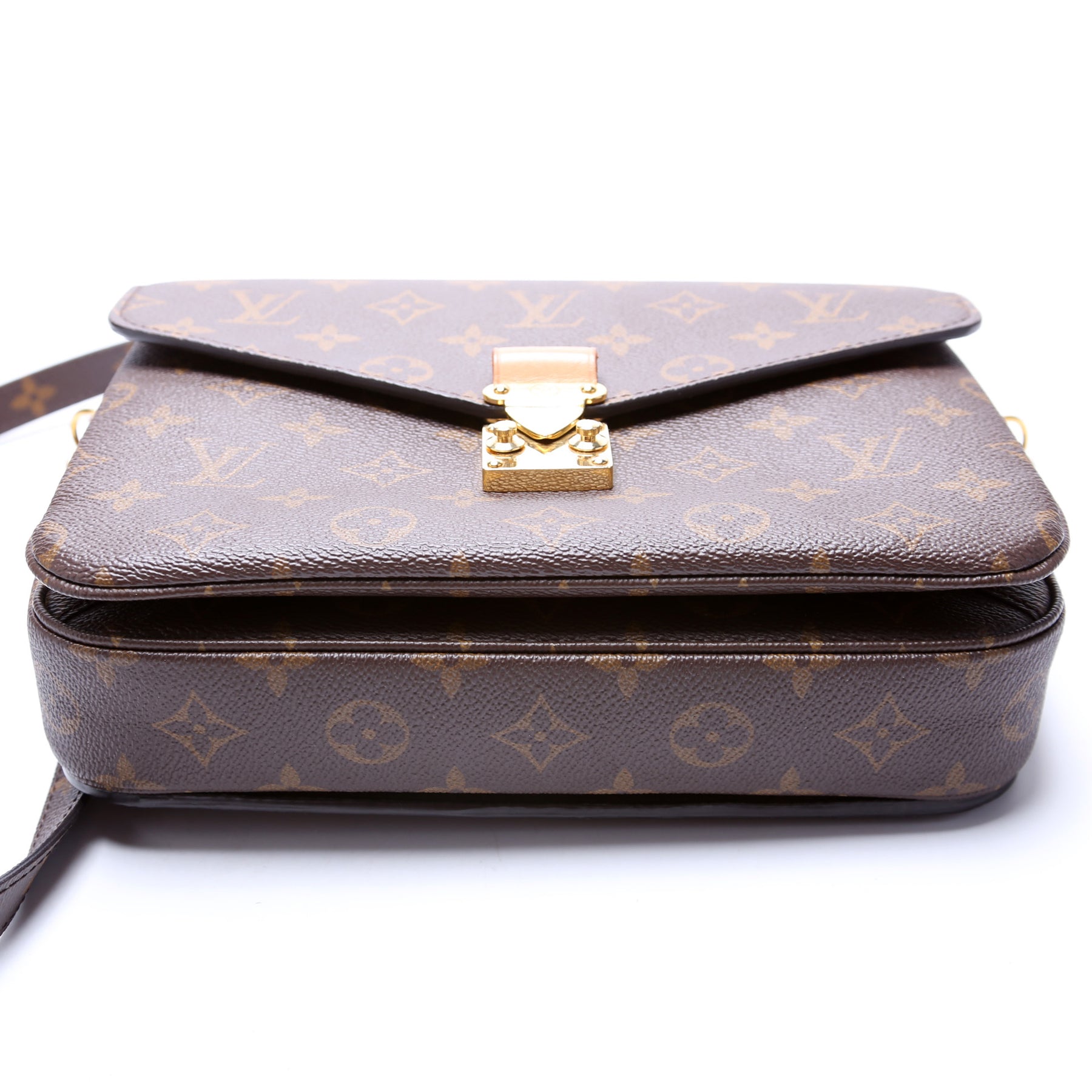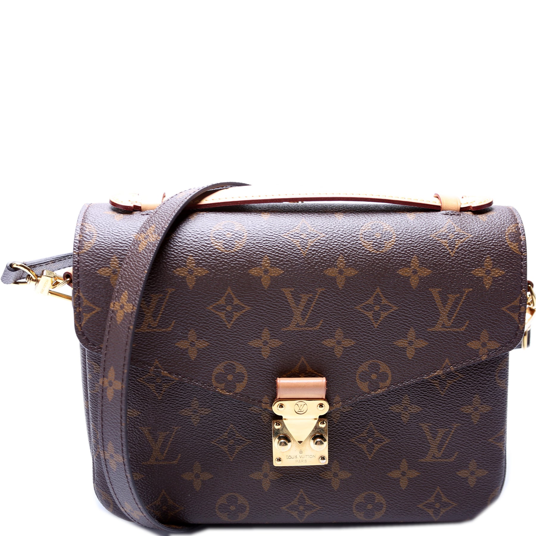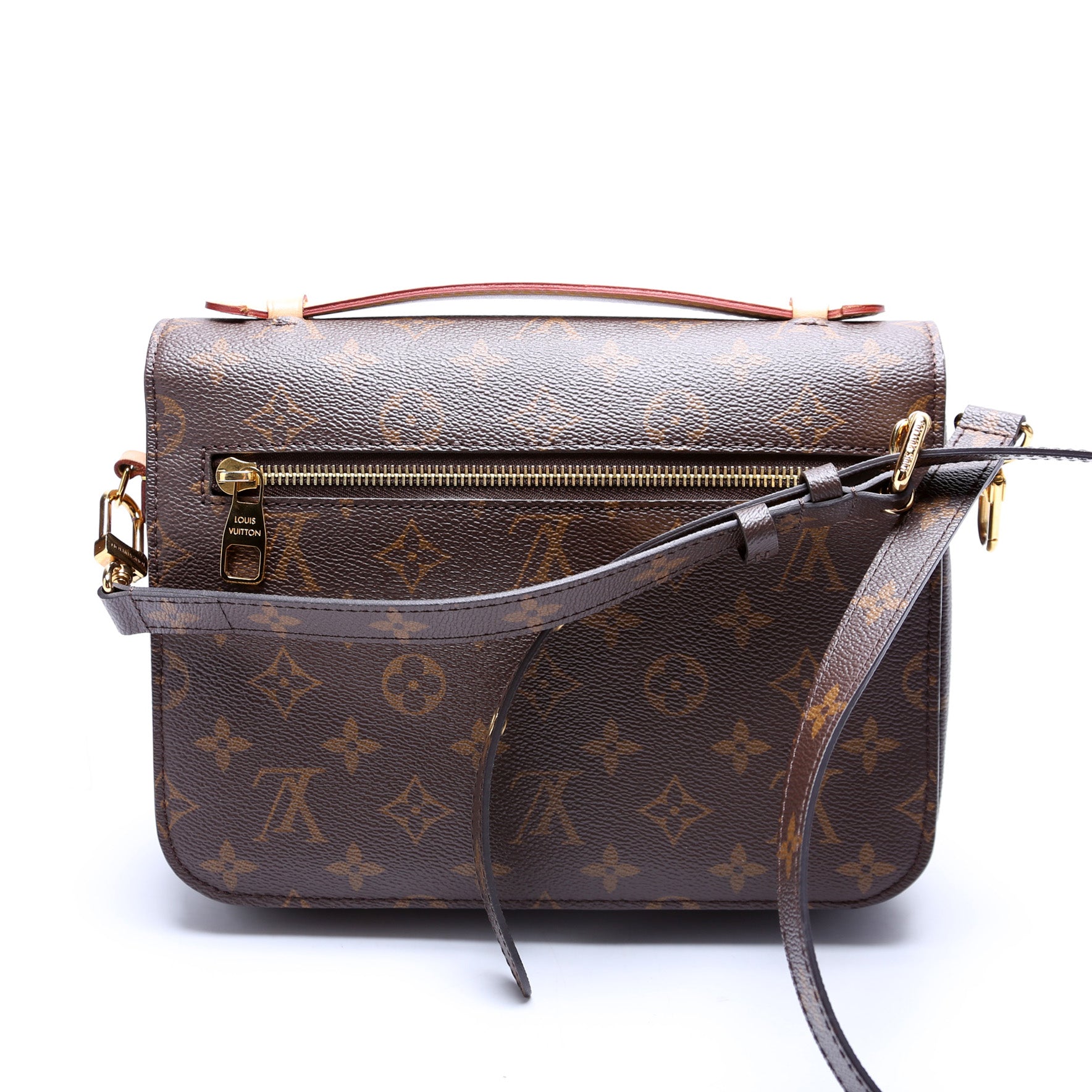 This pre-owned Louis Vuitton Pochette Metis is guaranteed 100% authentic. The exterior is in the classic Louis Vuitton Monogram coated canvas.