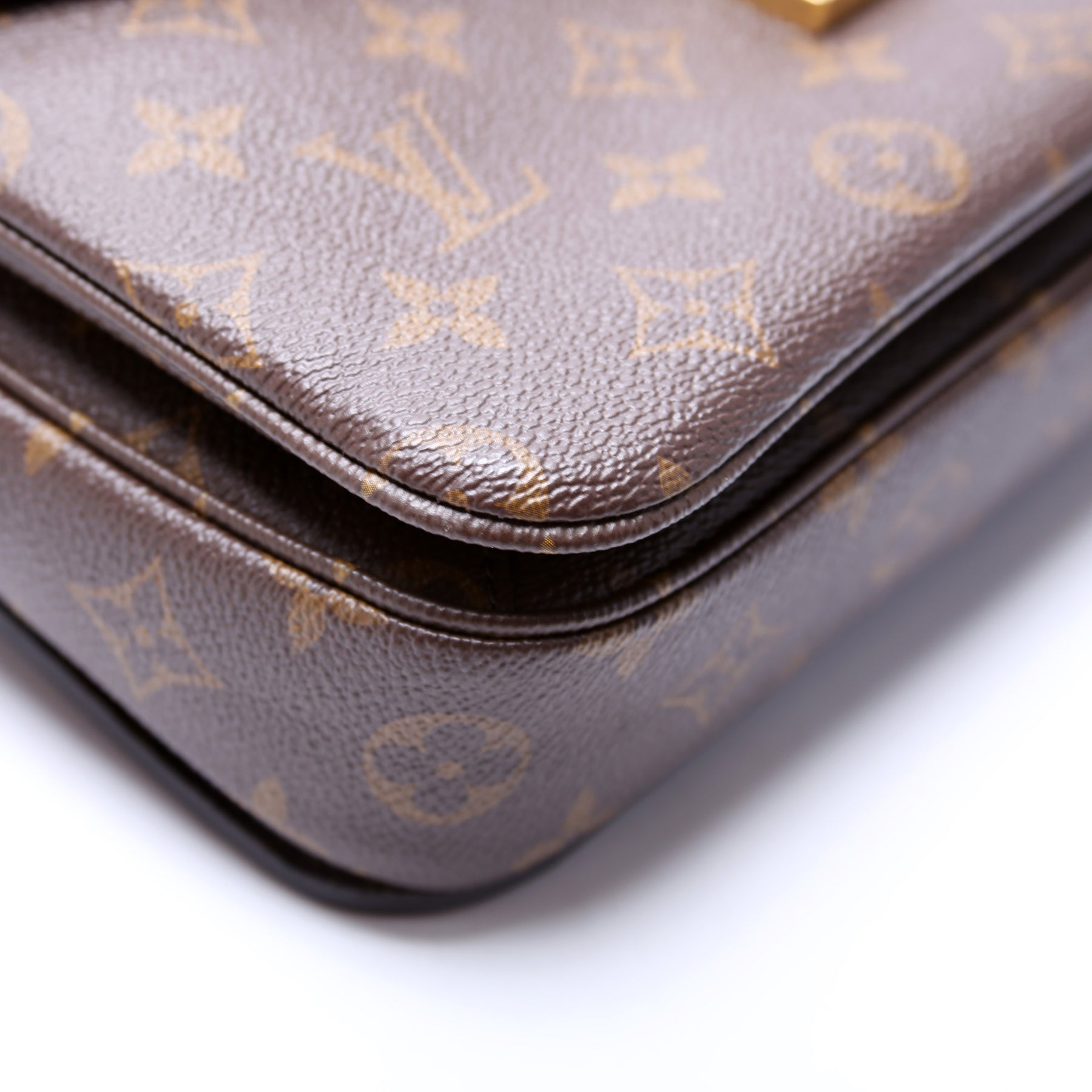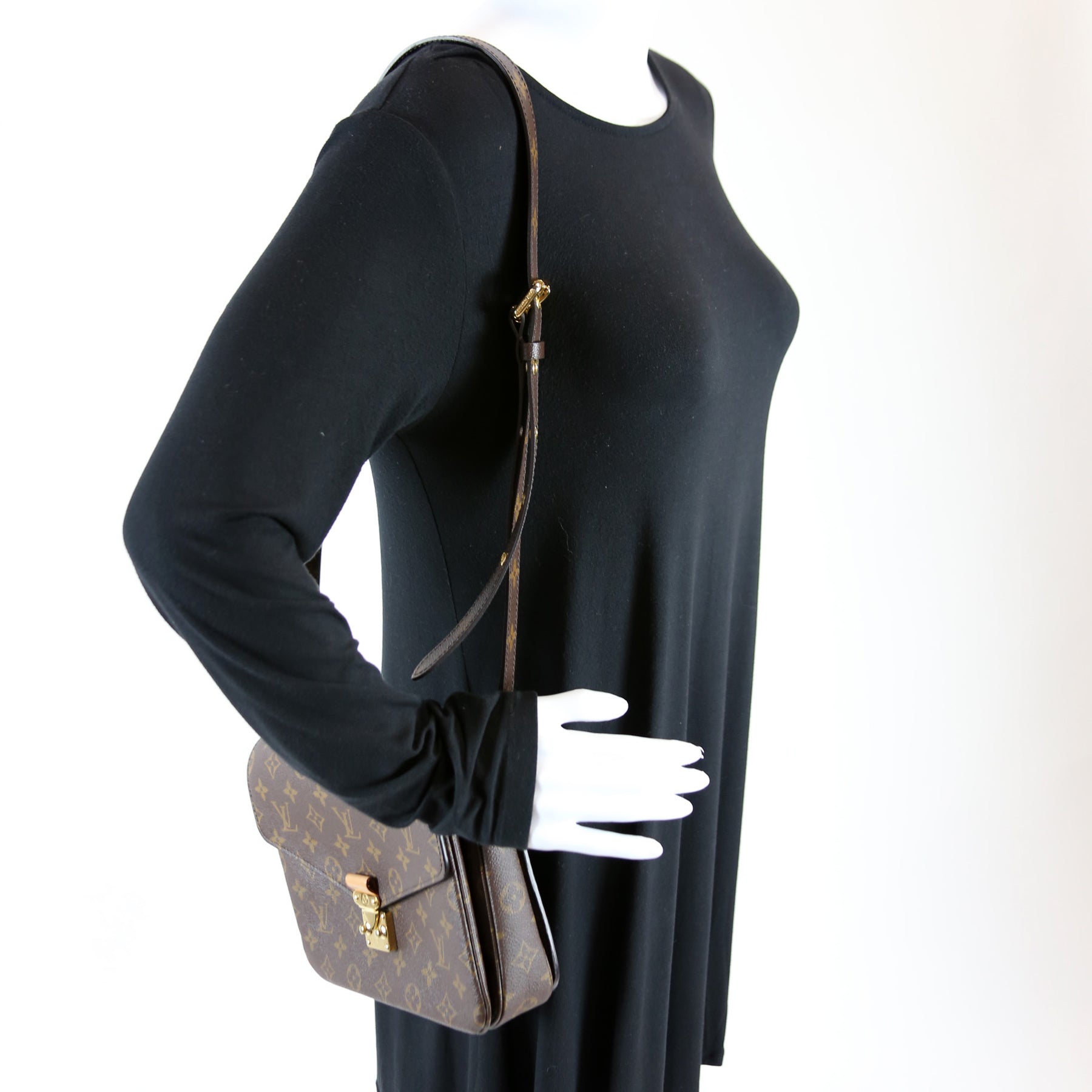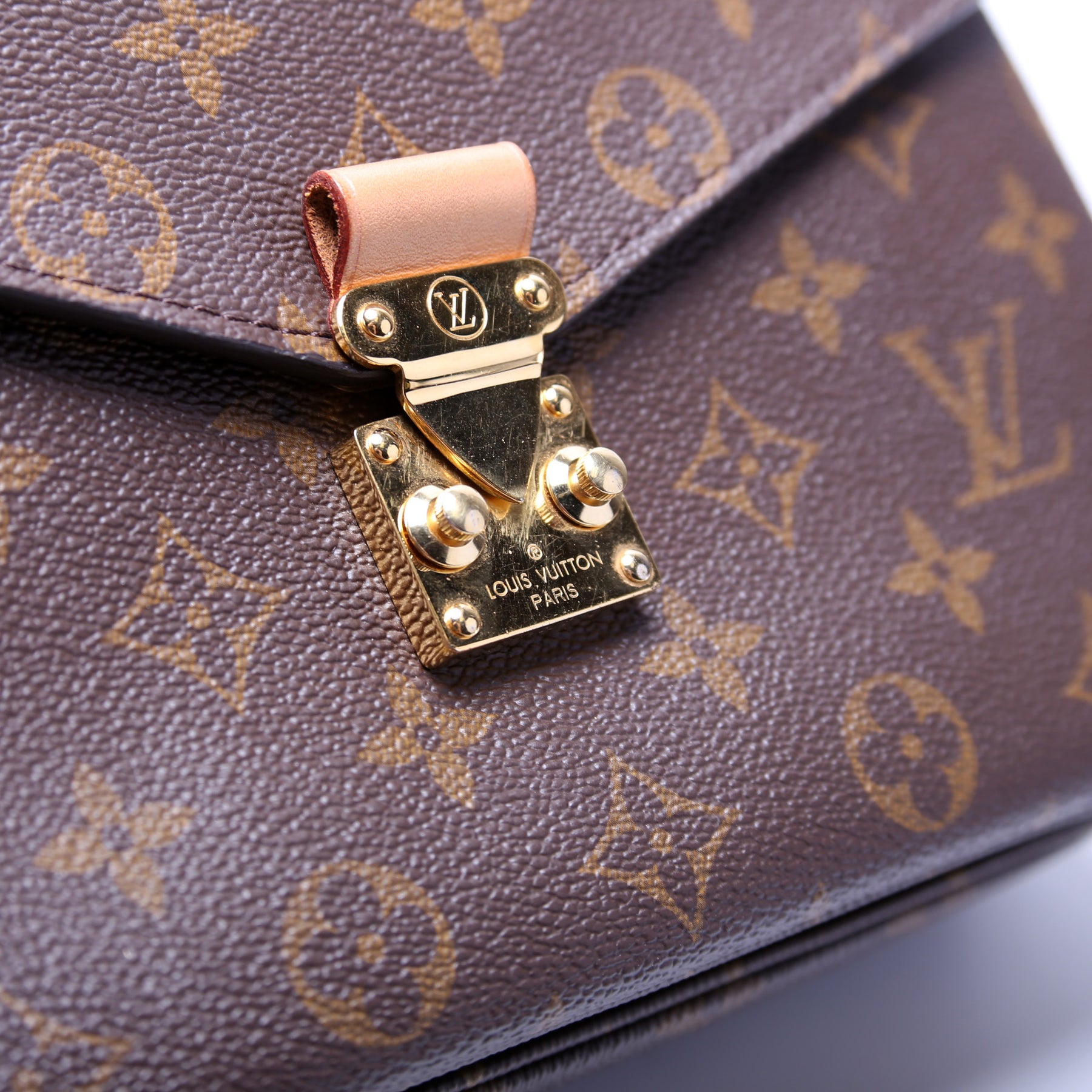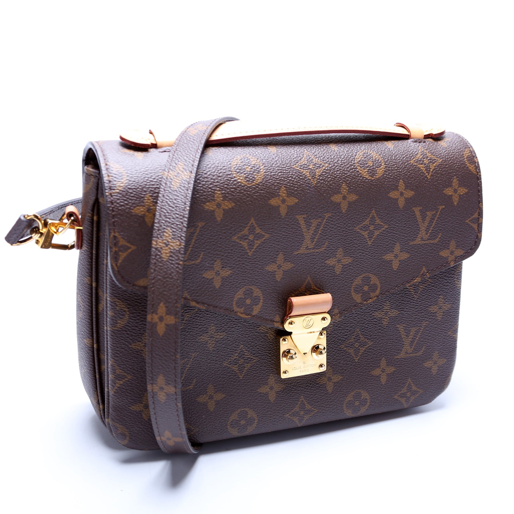 This pre-owned Louis Vuitton Pochette Metis is guaranteed 100% authentic. The exterior is in the classic Louis Vuitton Monogram coated canvas.
