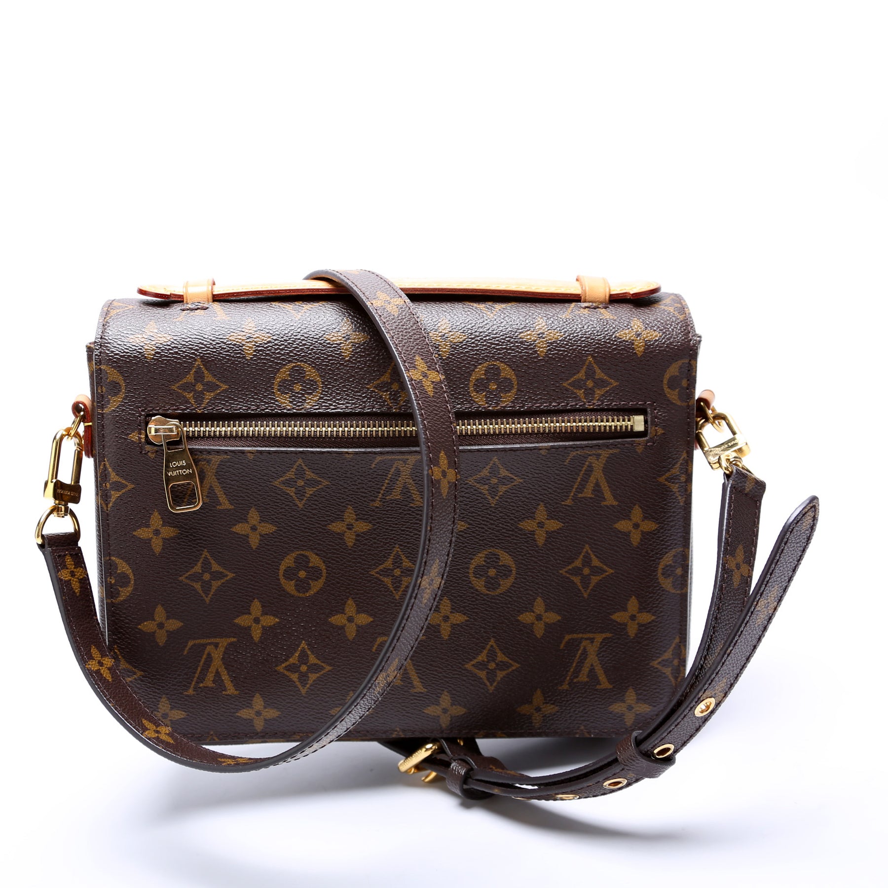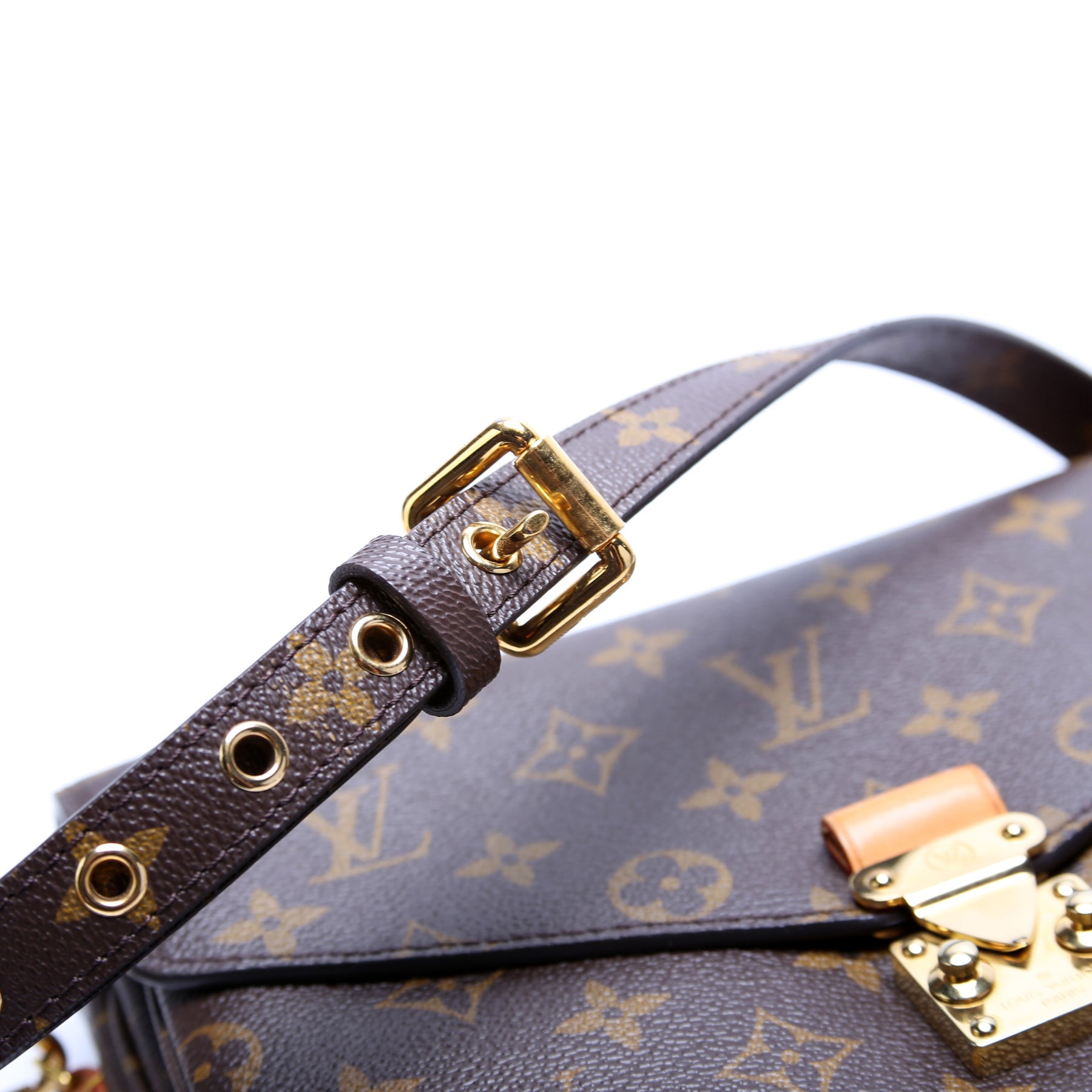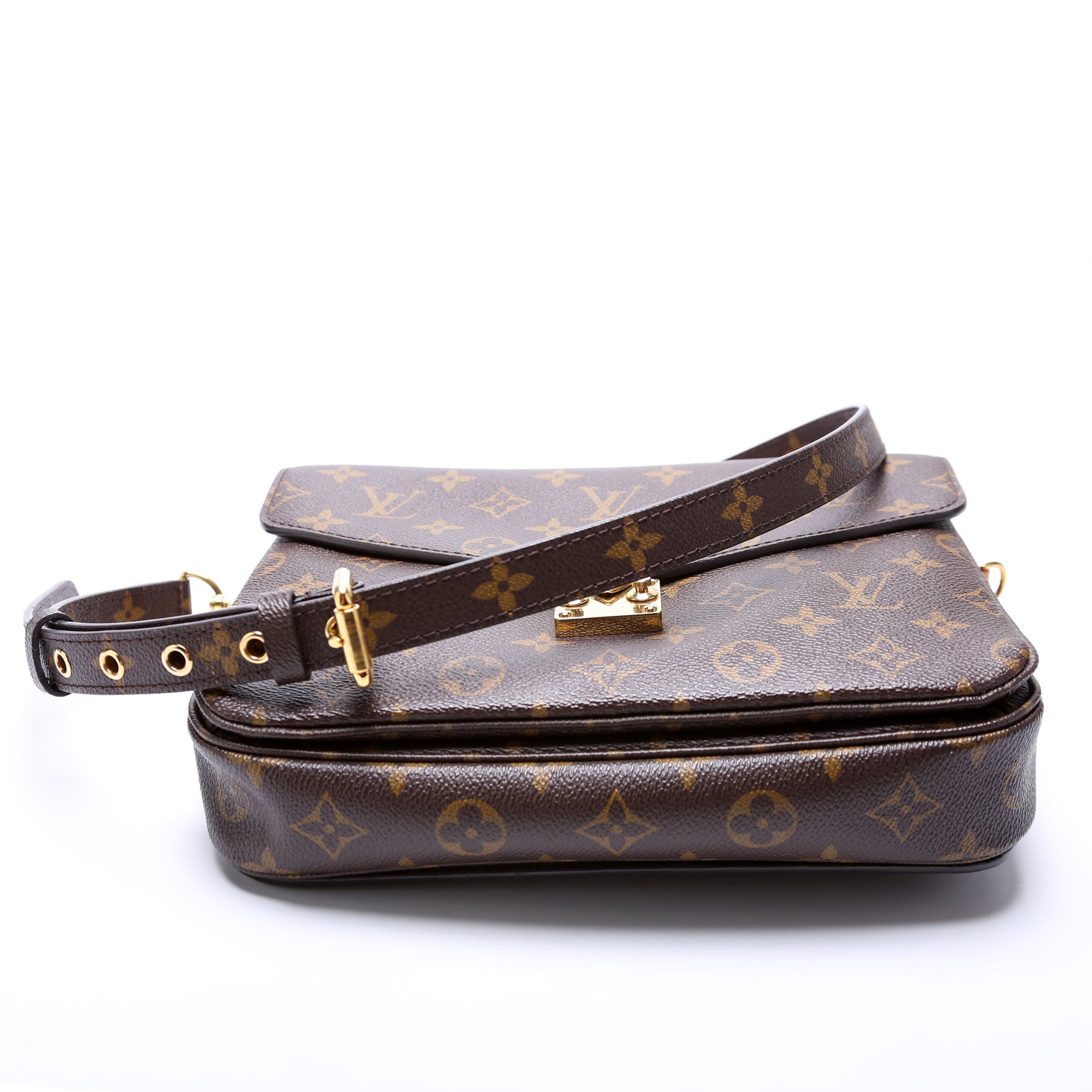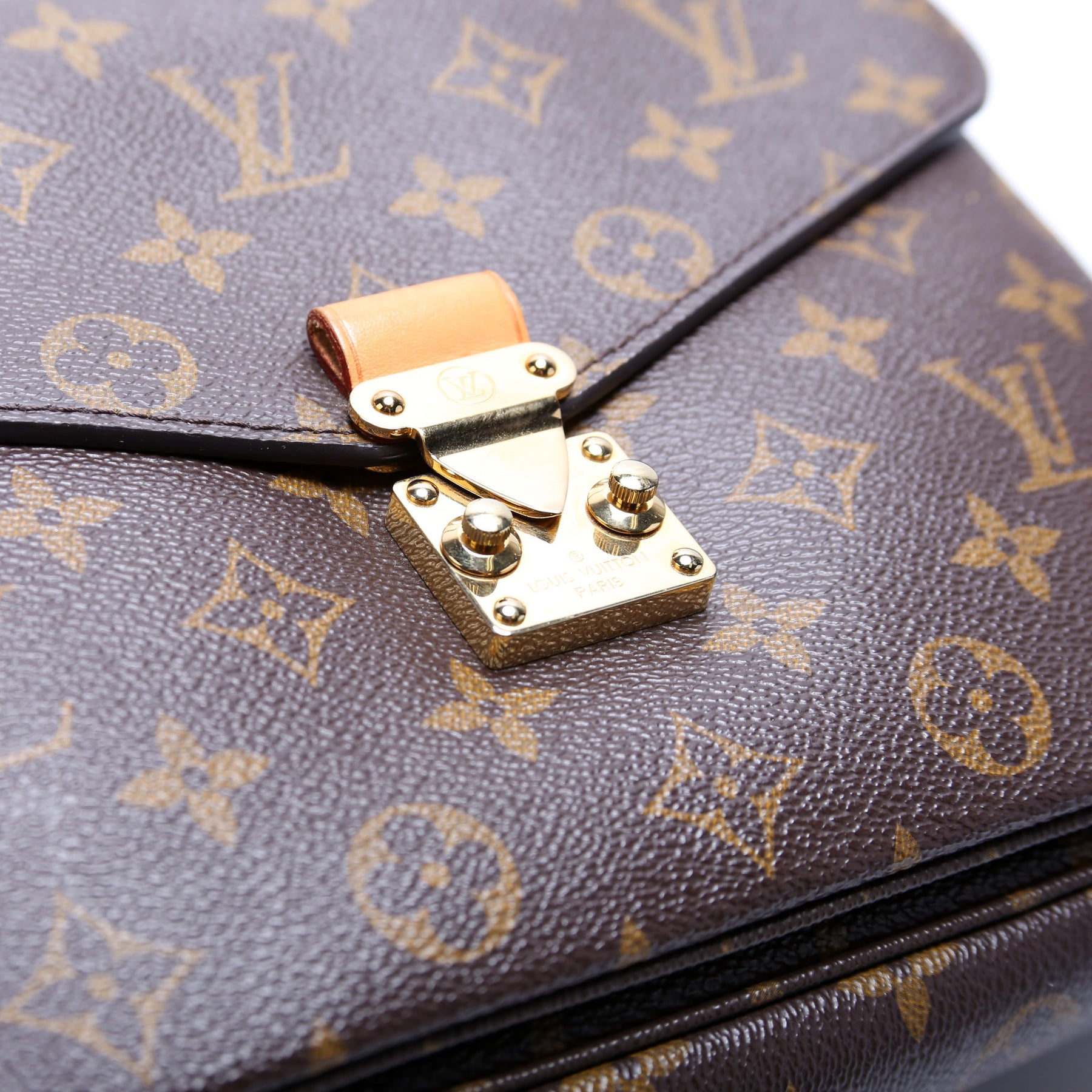 This pre-owned Louis Vuitton Pochette Metis is guaranteed 100% authentic. The exterior is in the classic Louis Vuitton Monogram coated canvas.