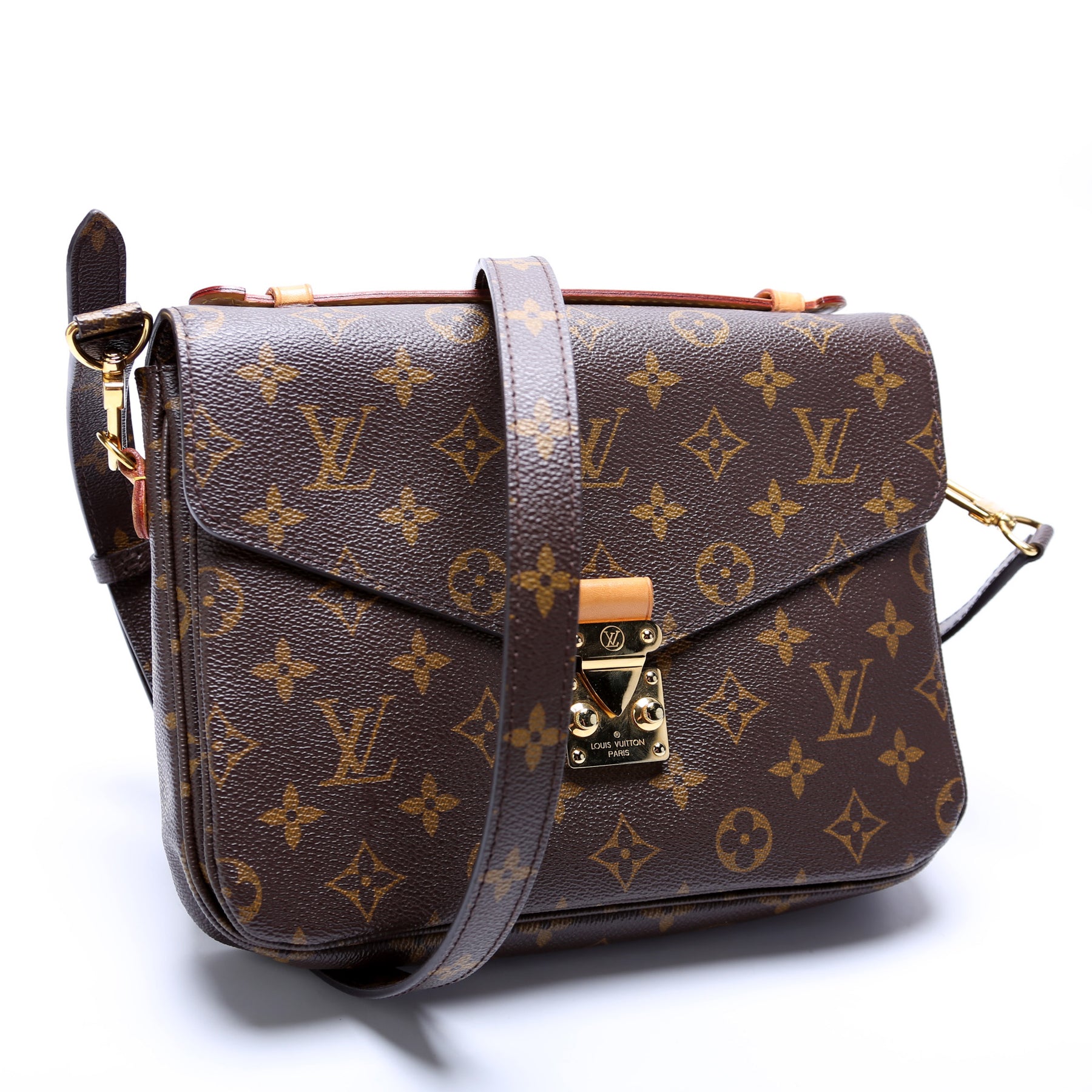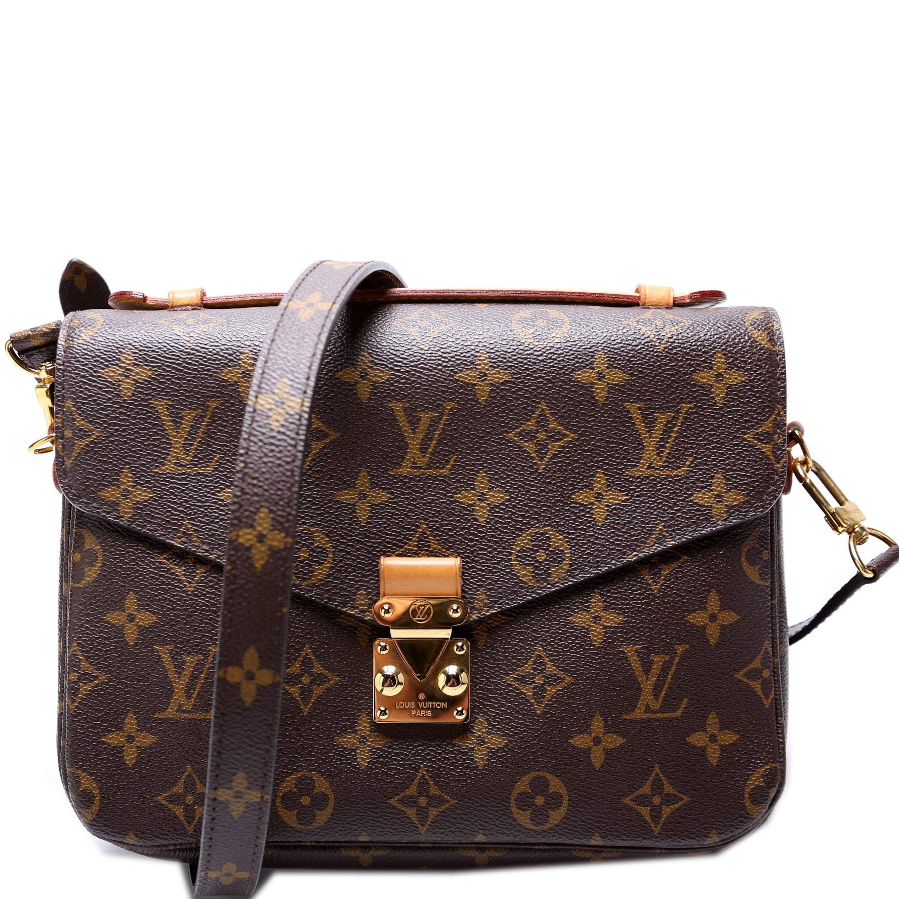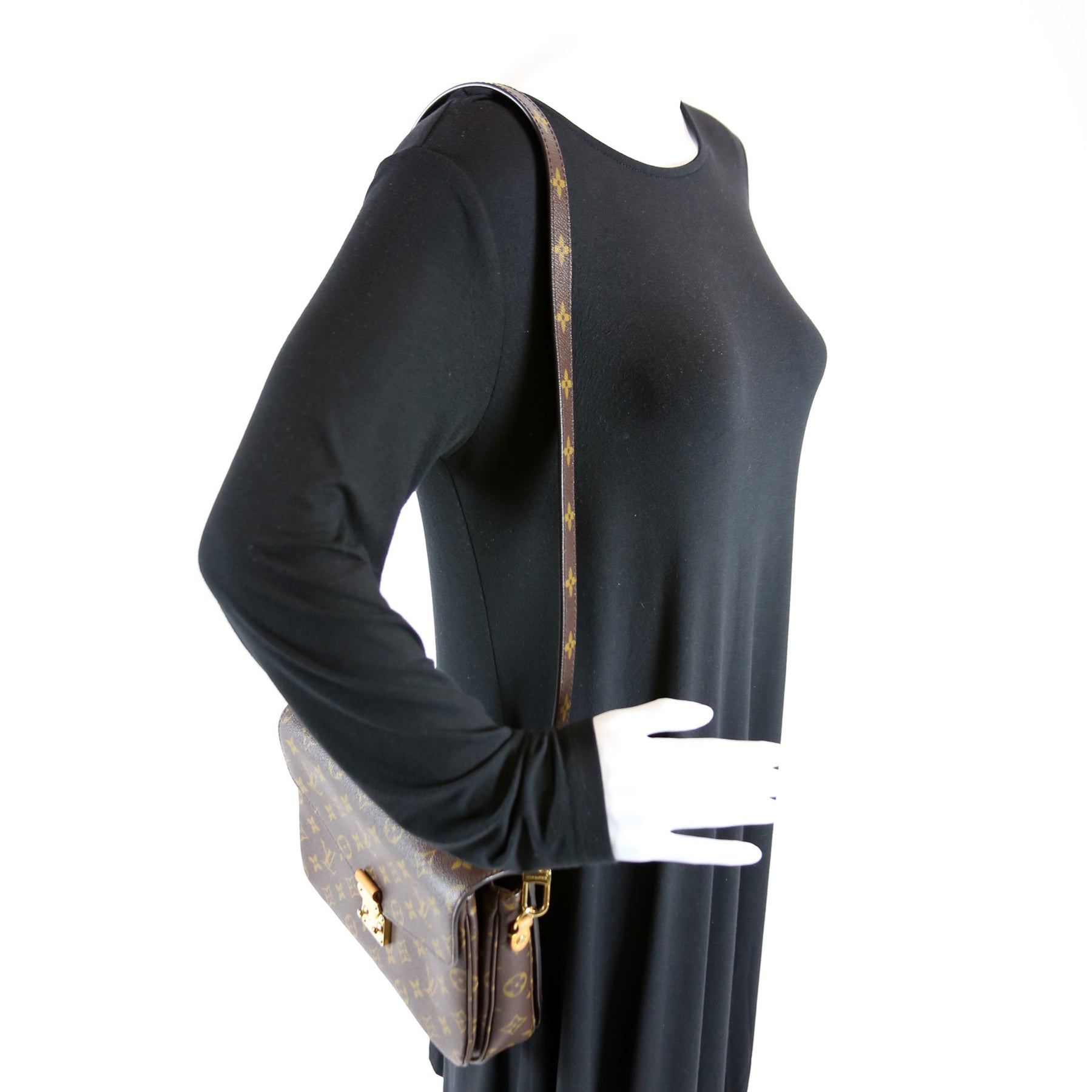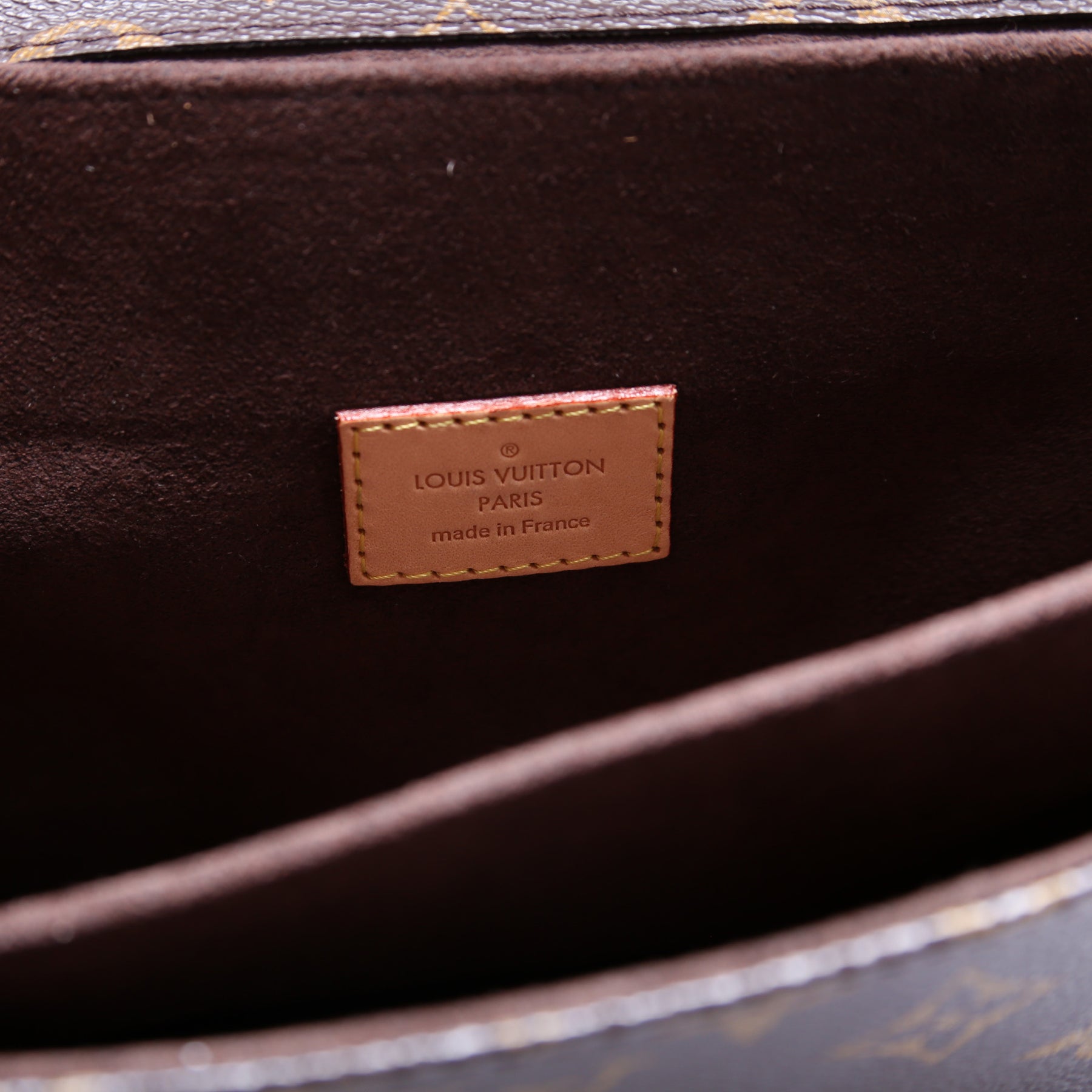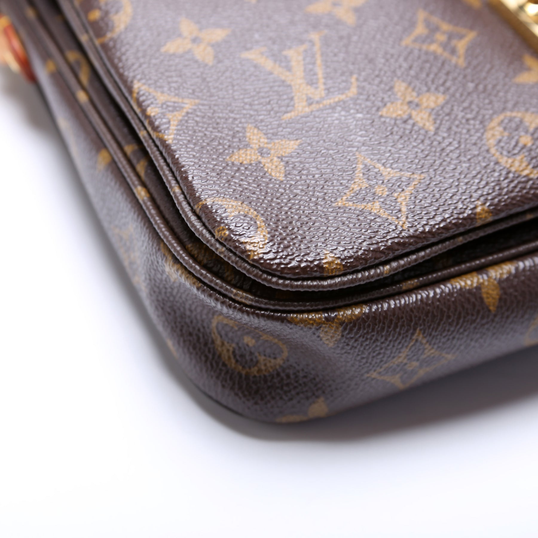 This pre-owned Louis Vuitton Pochette Metis is guaranteed 100% authentic. The exterior is in the classic Louis Vuitton Monogram coated canvas.