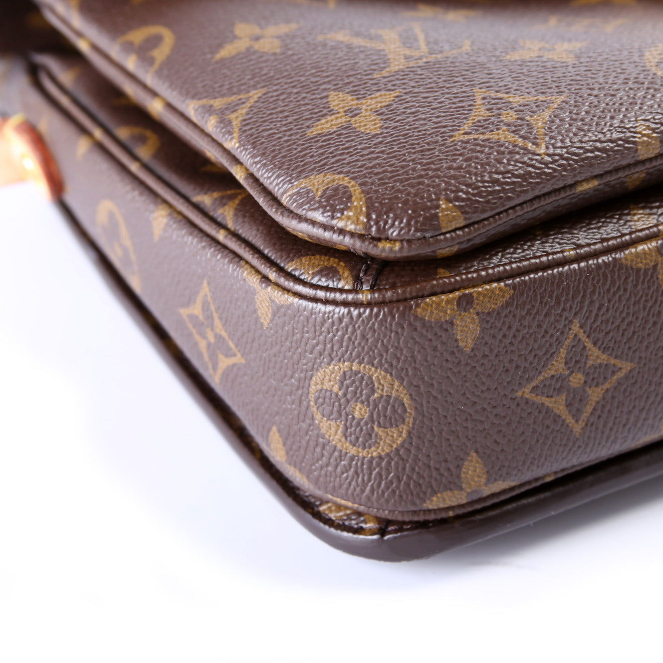 This pre-owned Louis Vuitton Pochette Metis is guaranteed 100% authentic. The exterior is in the classic Louis Vuitton Monogram coated canvas.