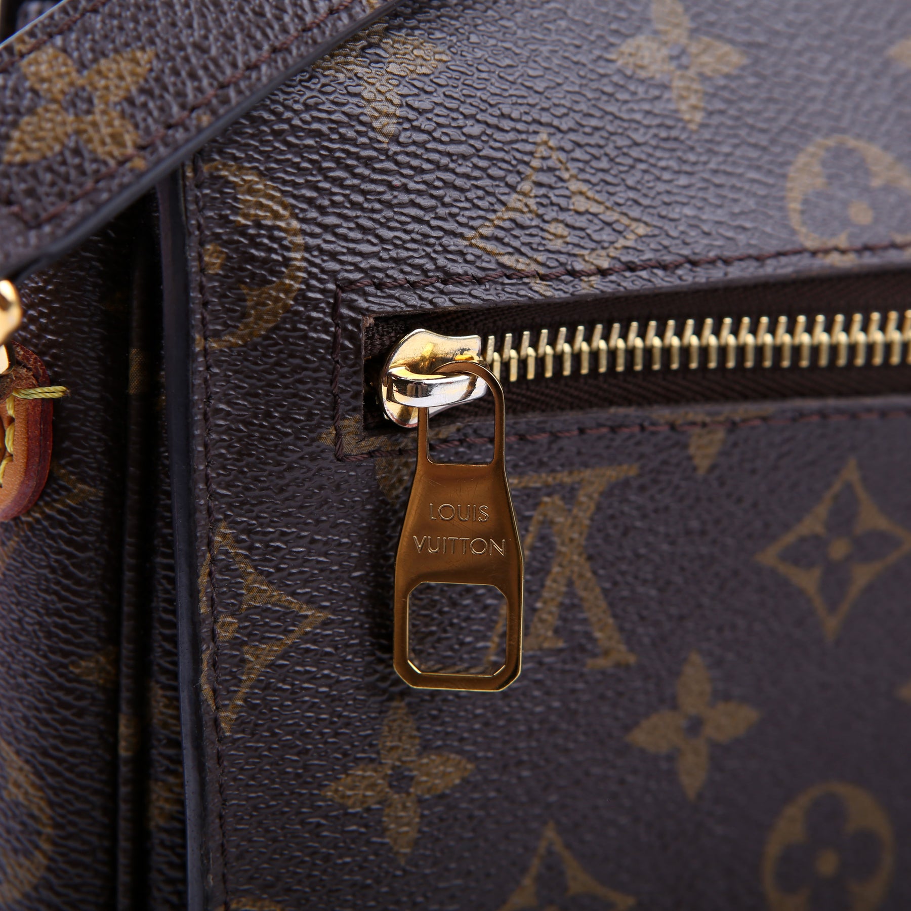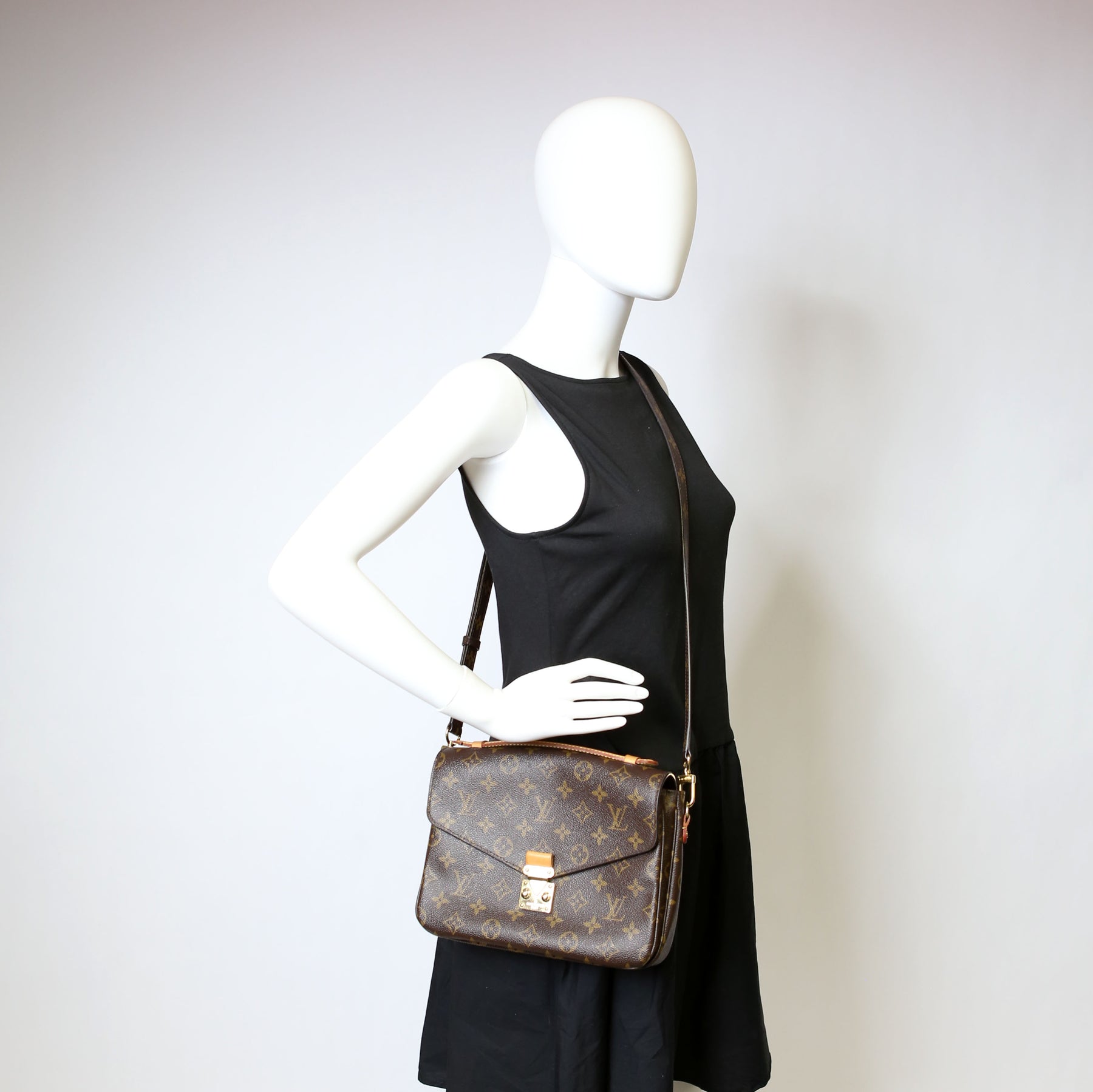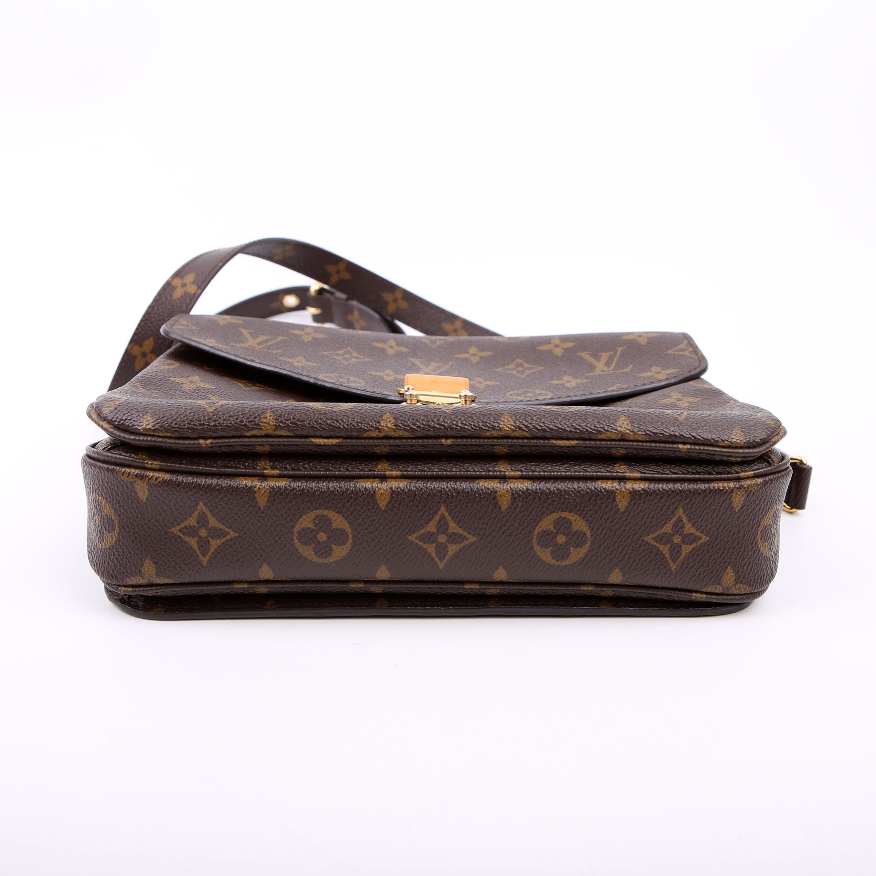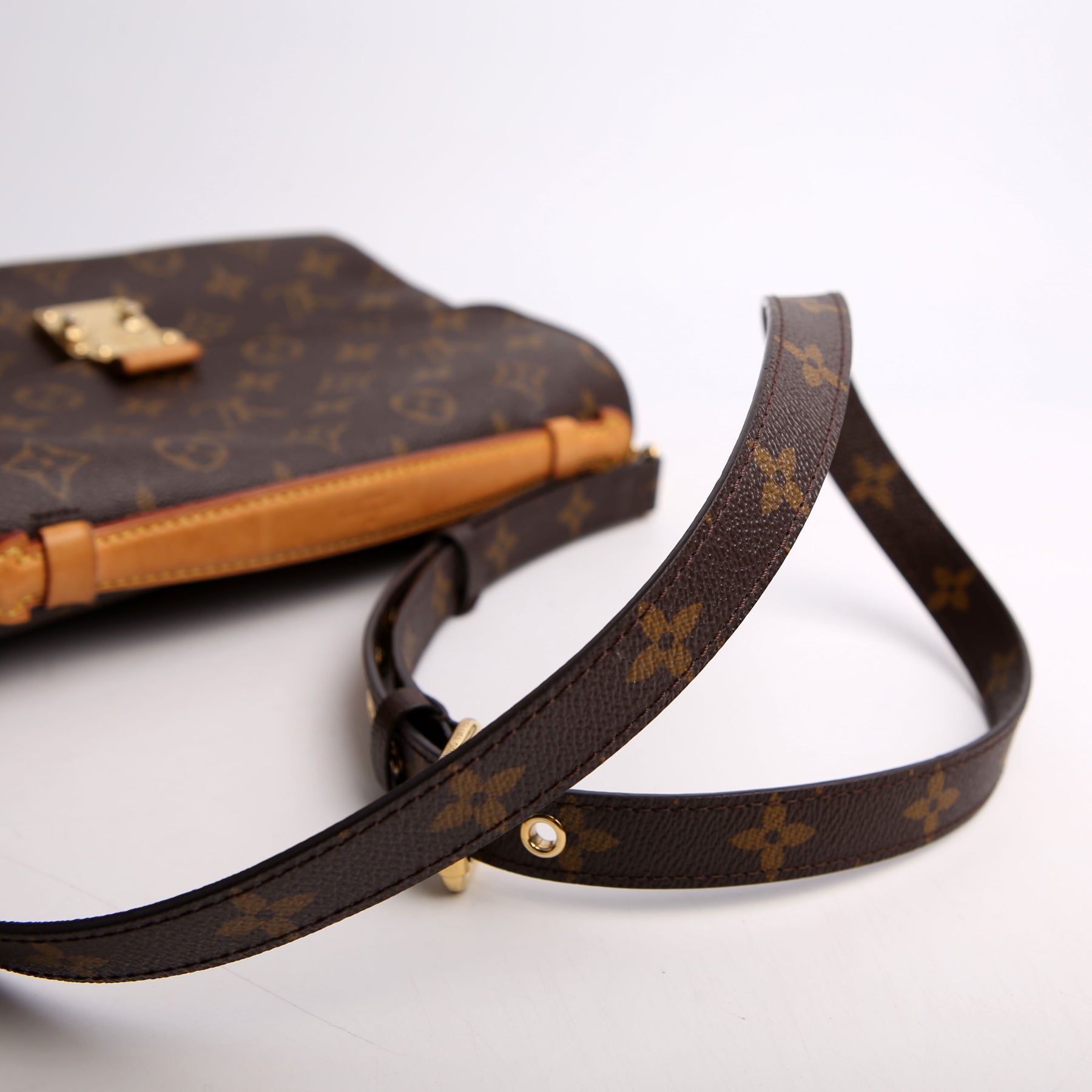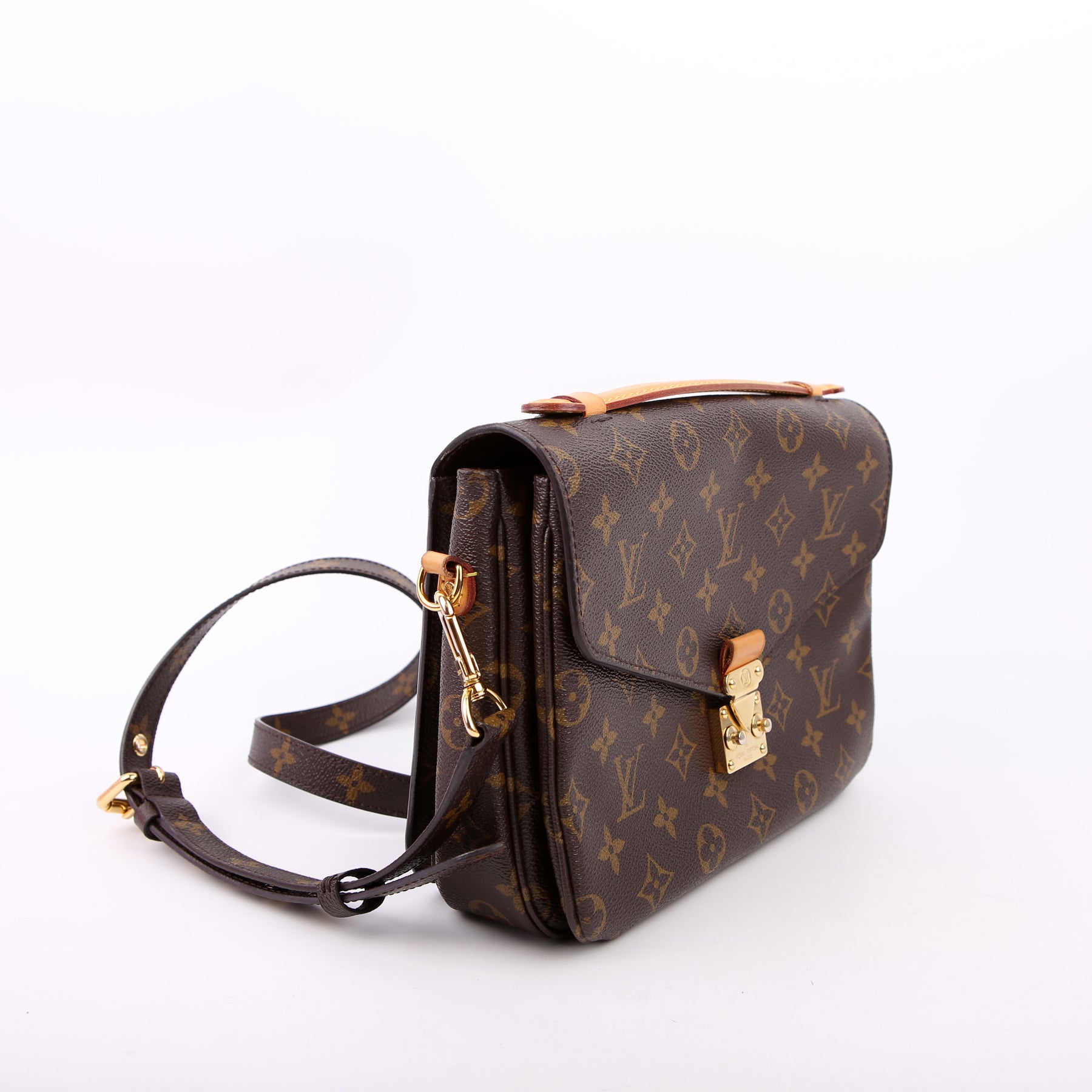 This pre-owned Louis Vuitton Pochette Metis is guaranteed 100% authentic. The exterior is in the classic Louis Vuitton Monogram coated canvas.