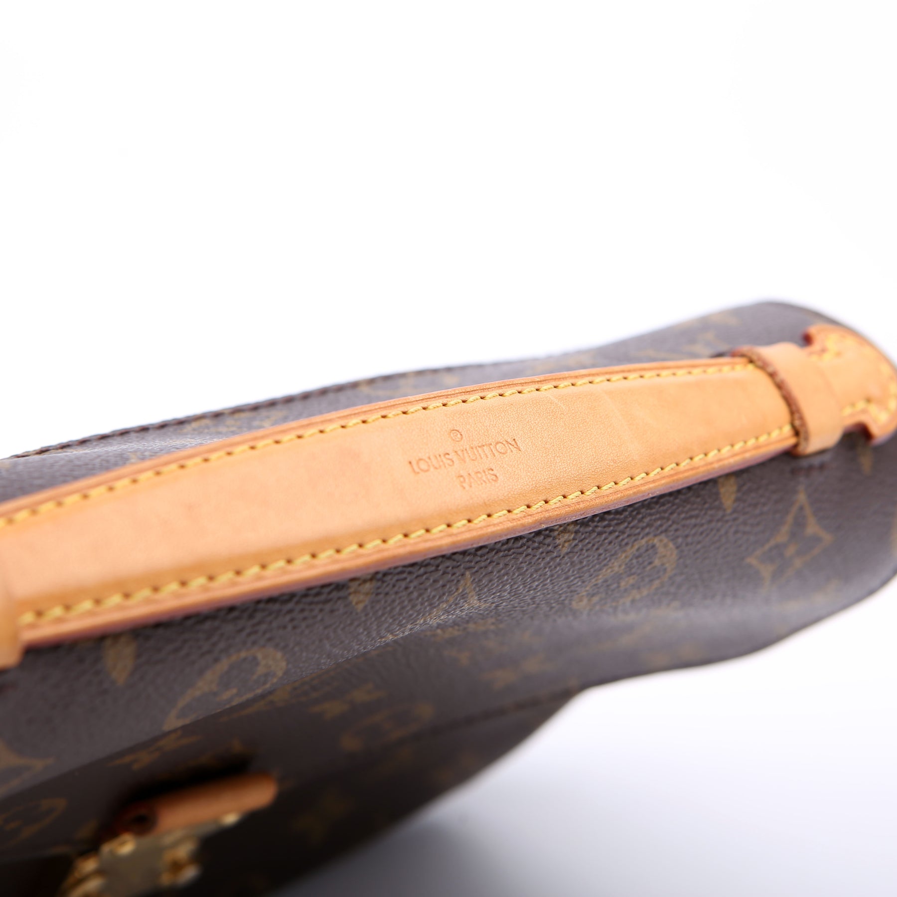 Handle: The leather handle shows minor wear and discoloration.