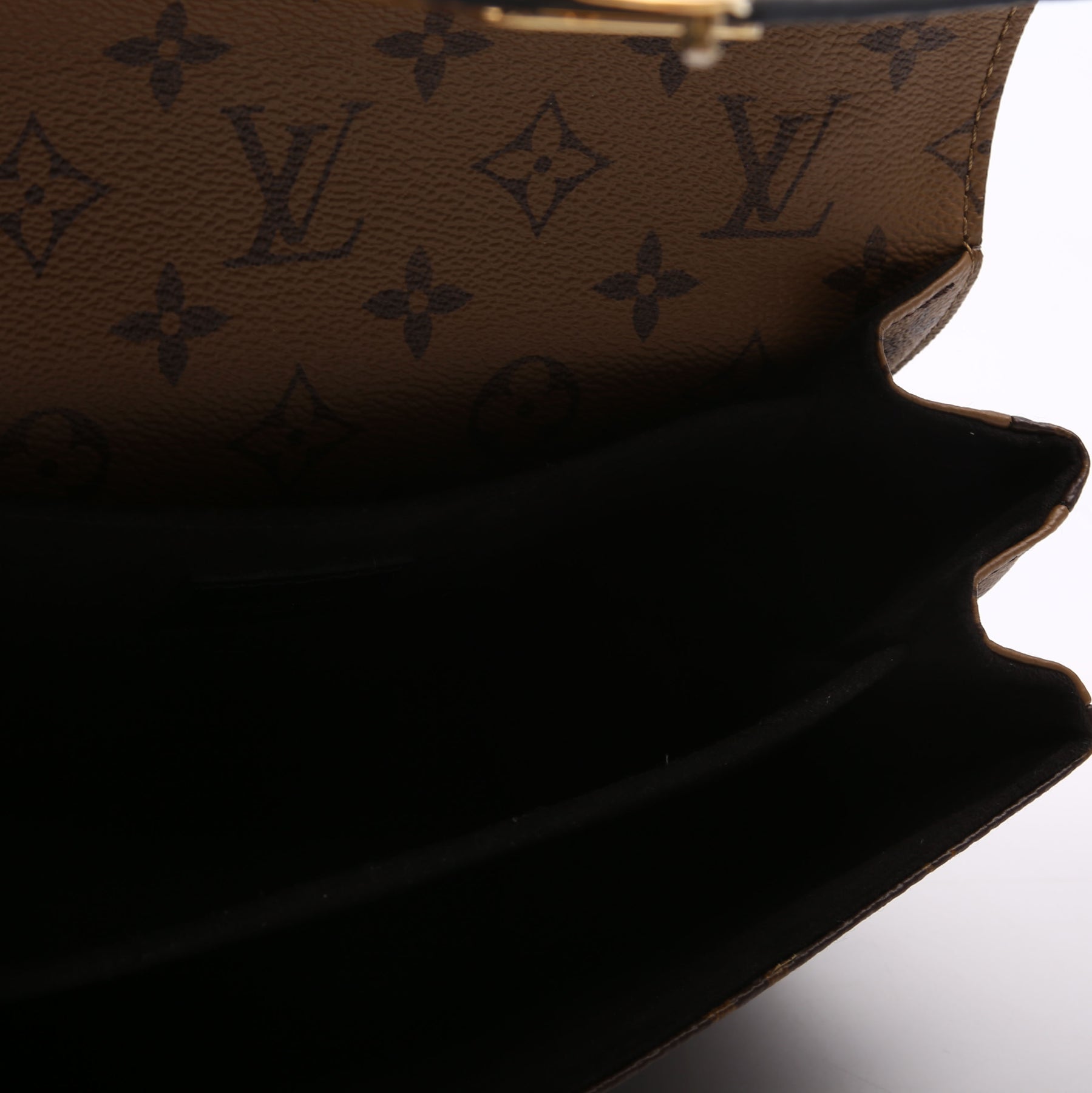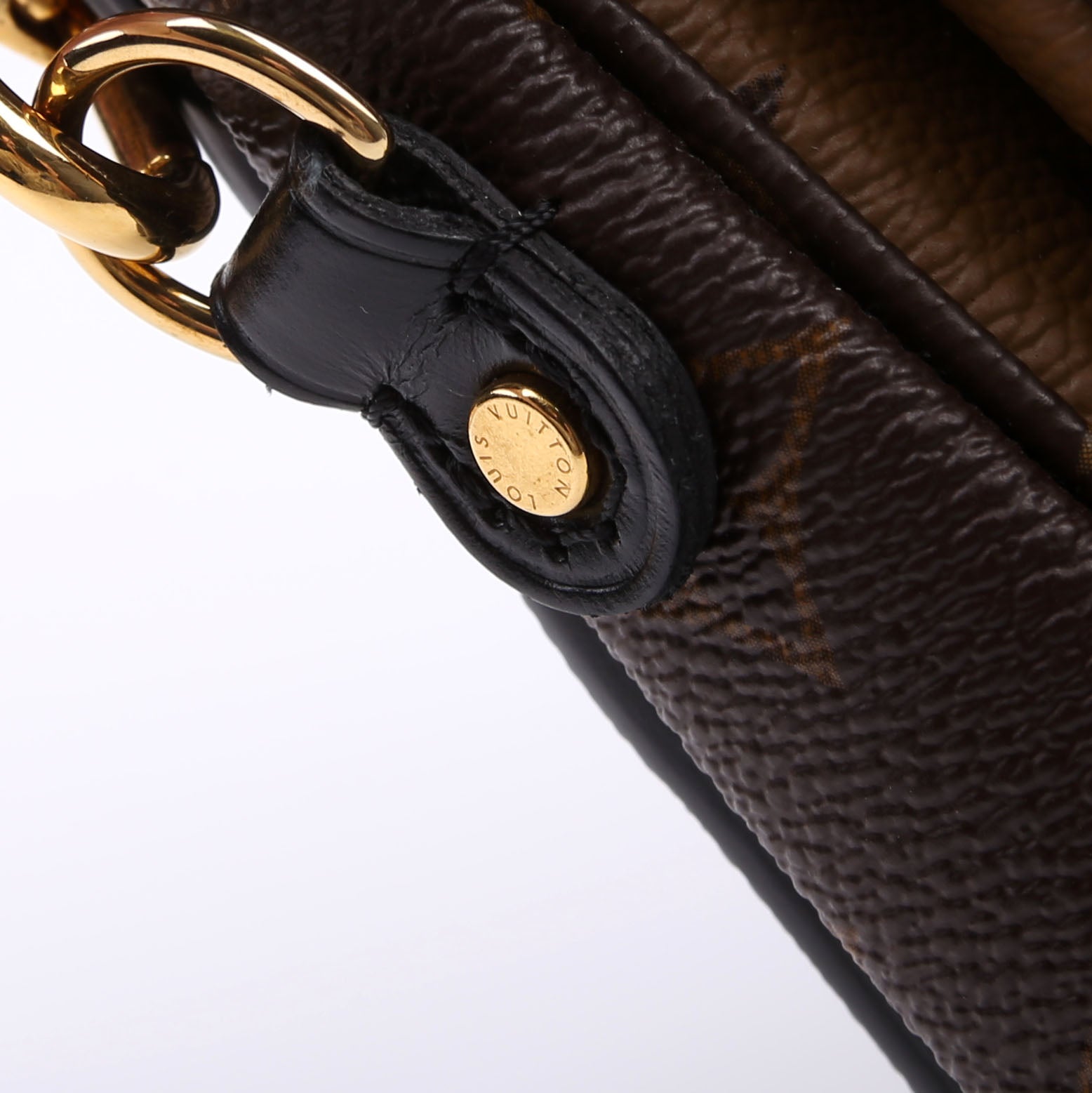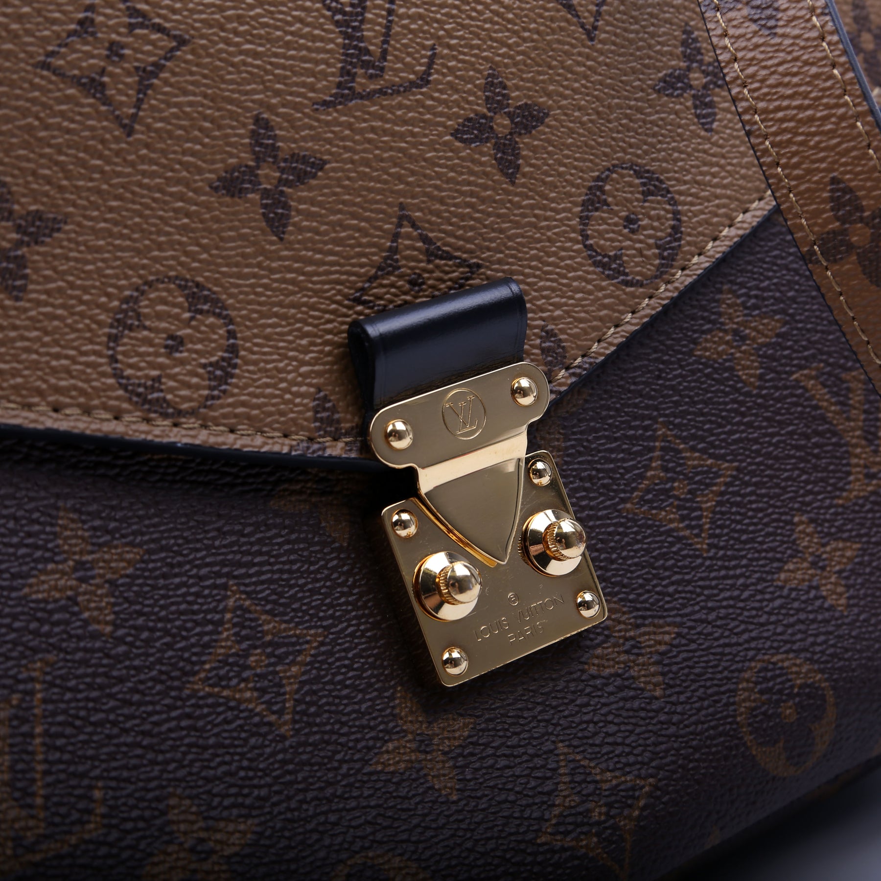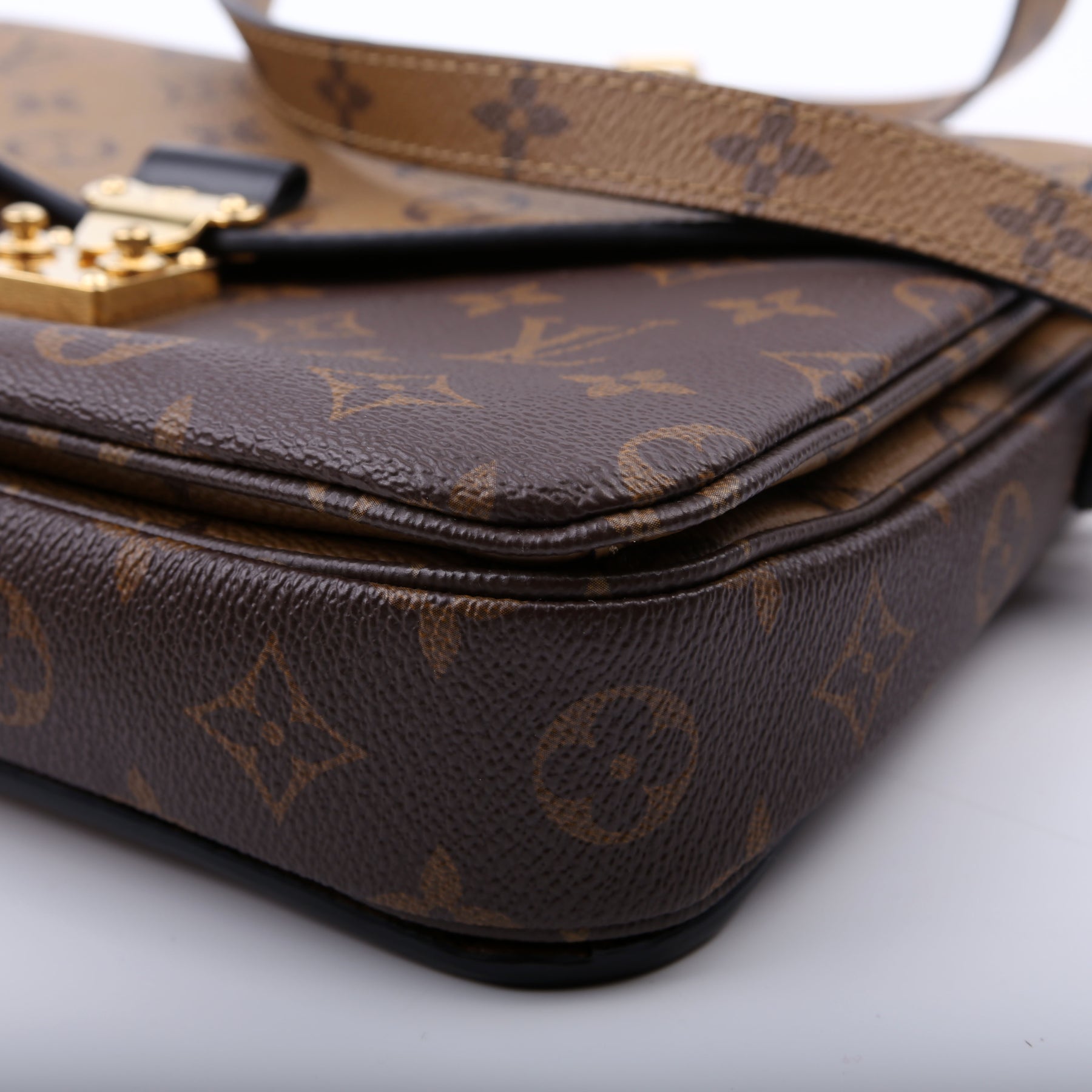 This pre-owned Louis Vuitton Pochette Metis is guaranteed 100% authentic. The exterior is in the classic Louis Vuitton Reverse Monogram coated canvas.