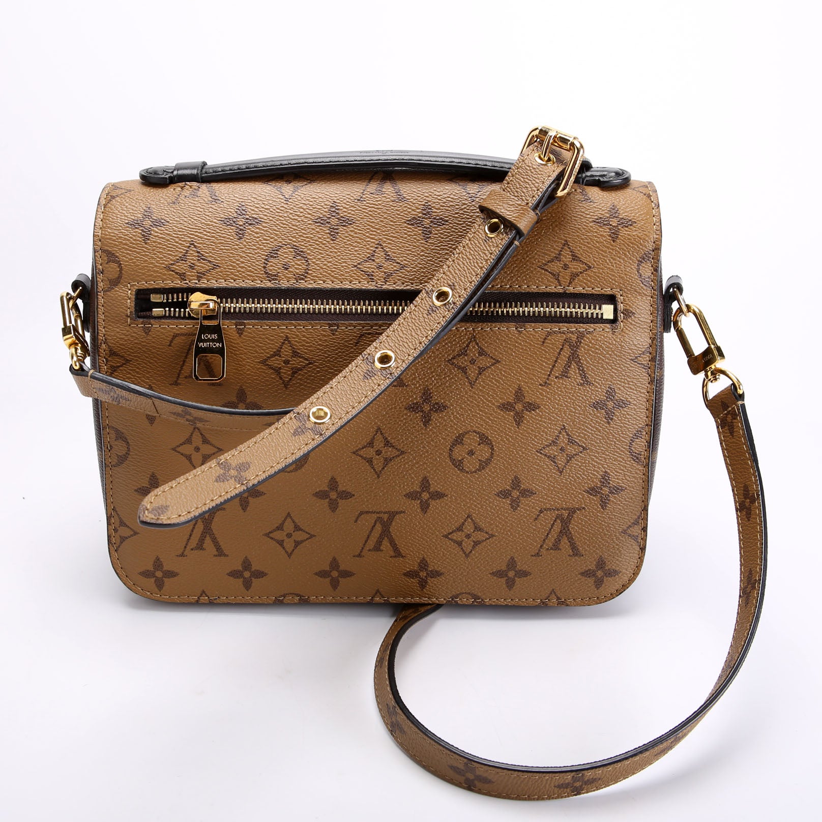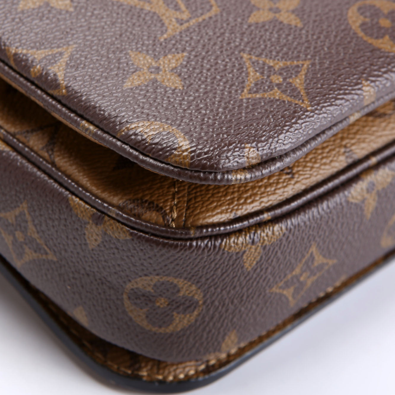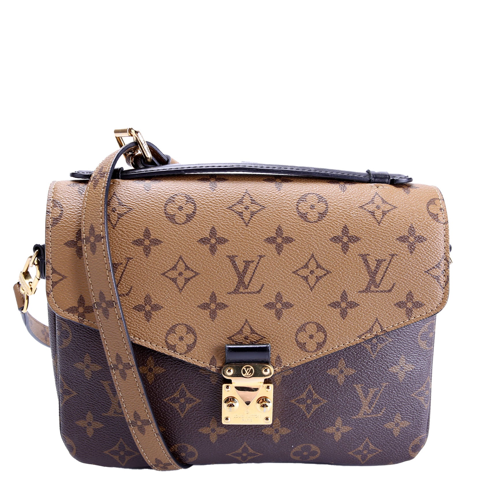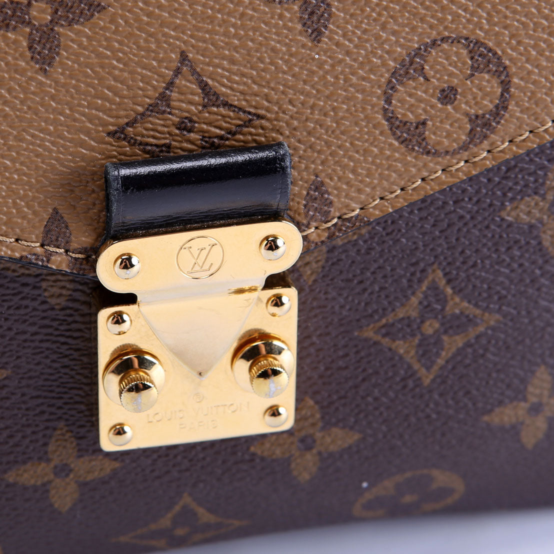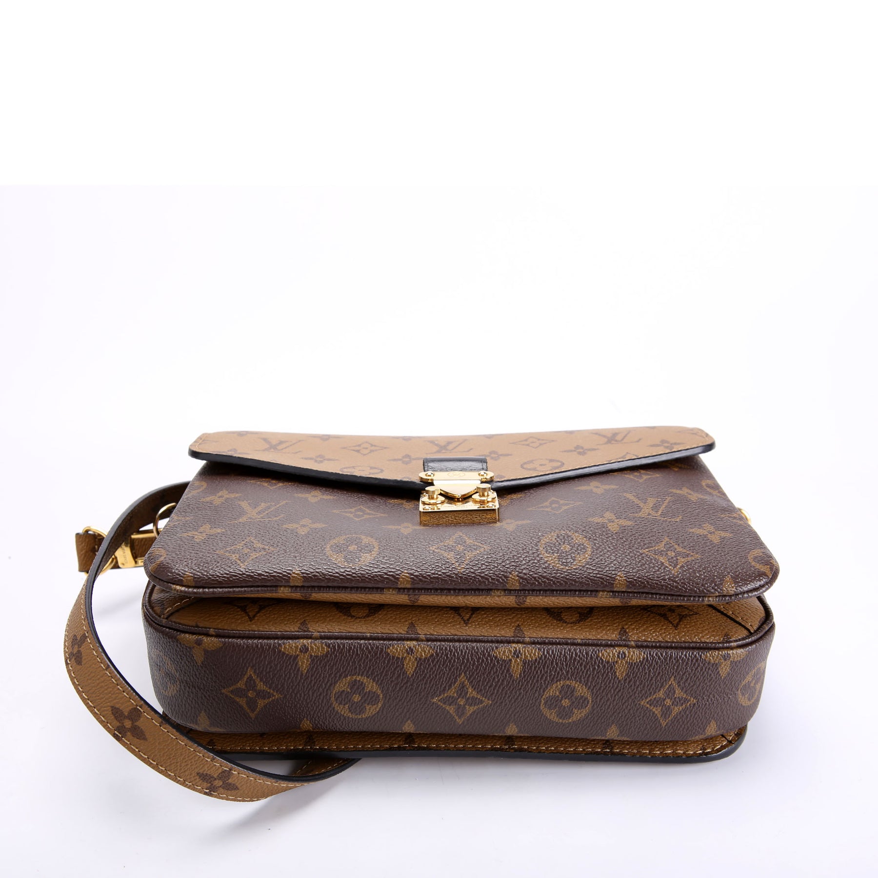 This pre-owned Louis Vuitton Pochette Metis is guaranteed 100% authentic. The exterior is in the classic Louis Vuitton Reversed Monogram coated canvas.