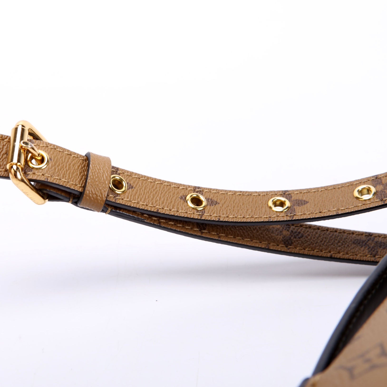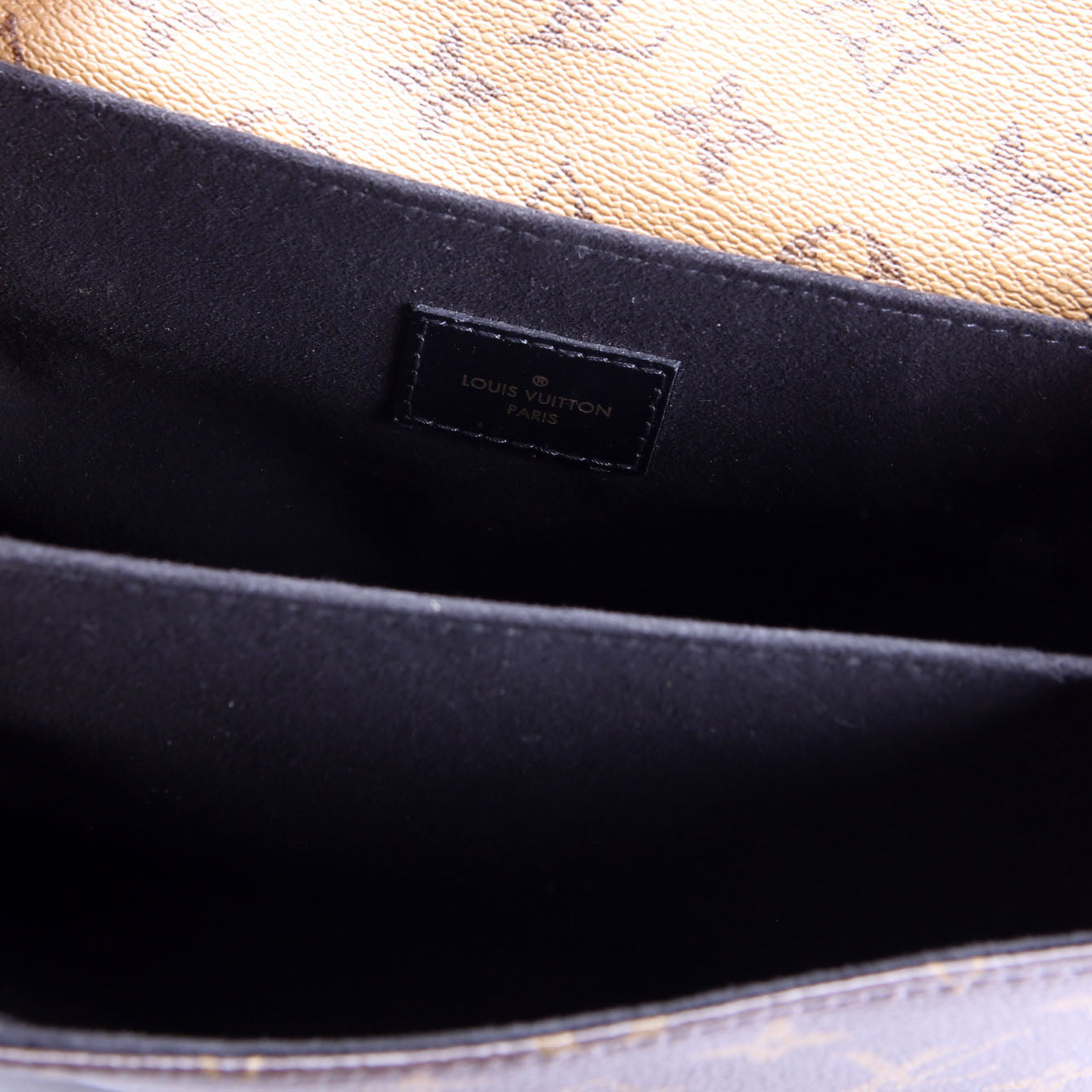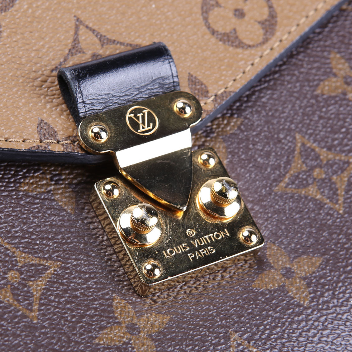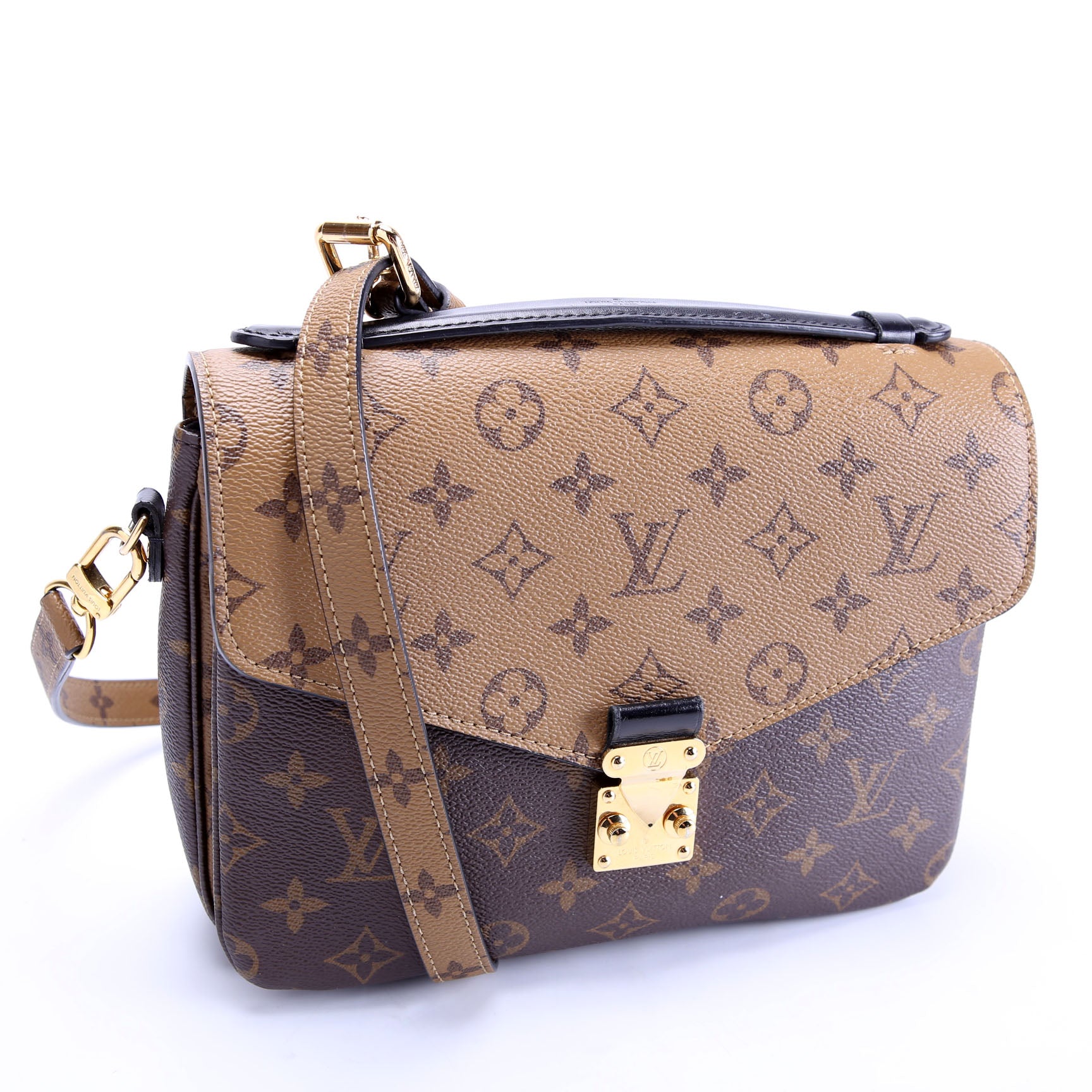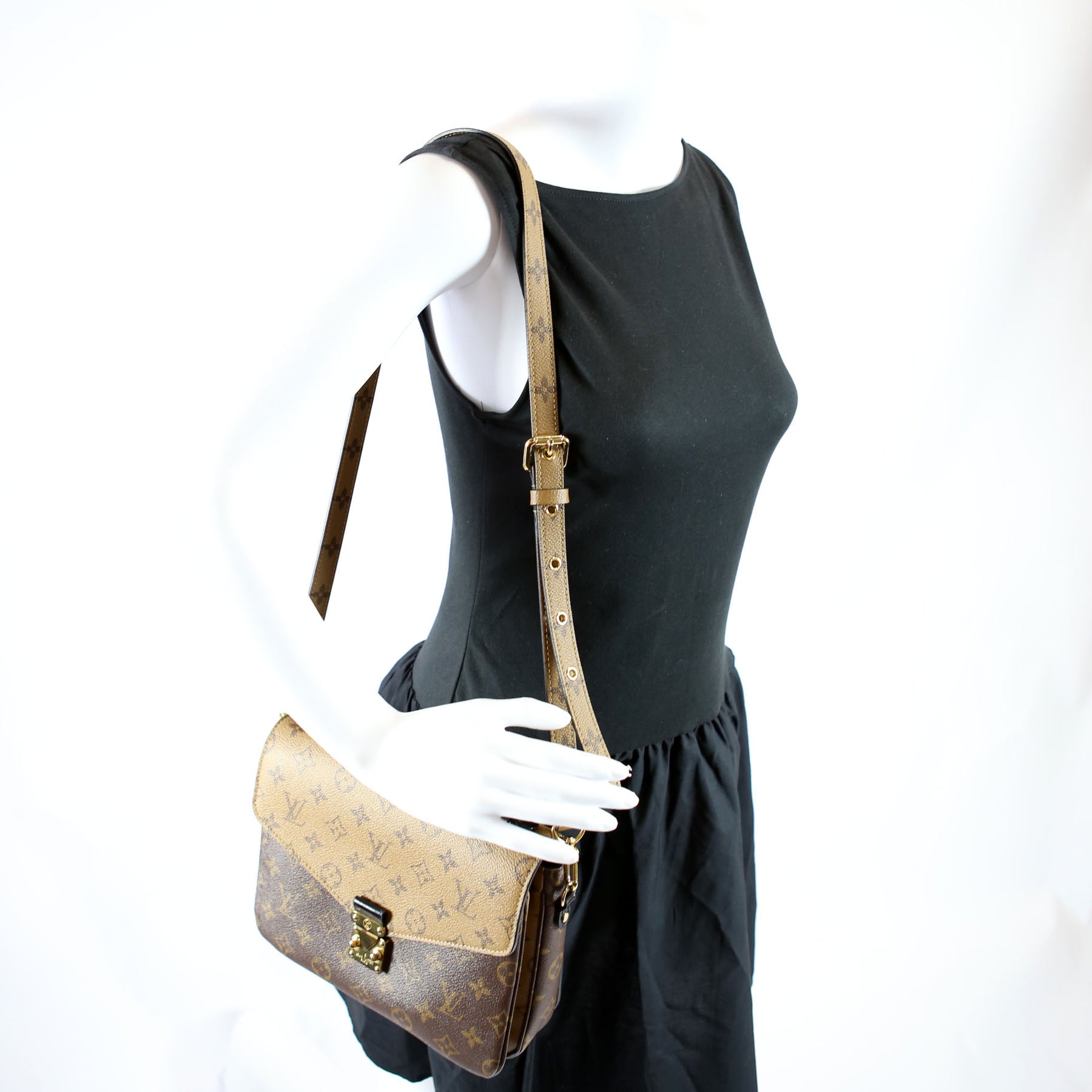 This pre-owned Louis Vuitton Pochette Metis is guaranteed 100% authentic. The exterior is in the classic Louis Vuitton Reversed Monogram coated canvas.