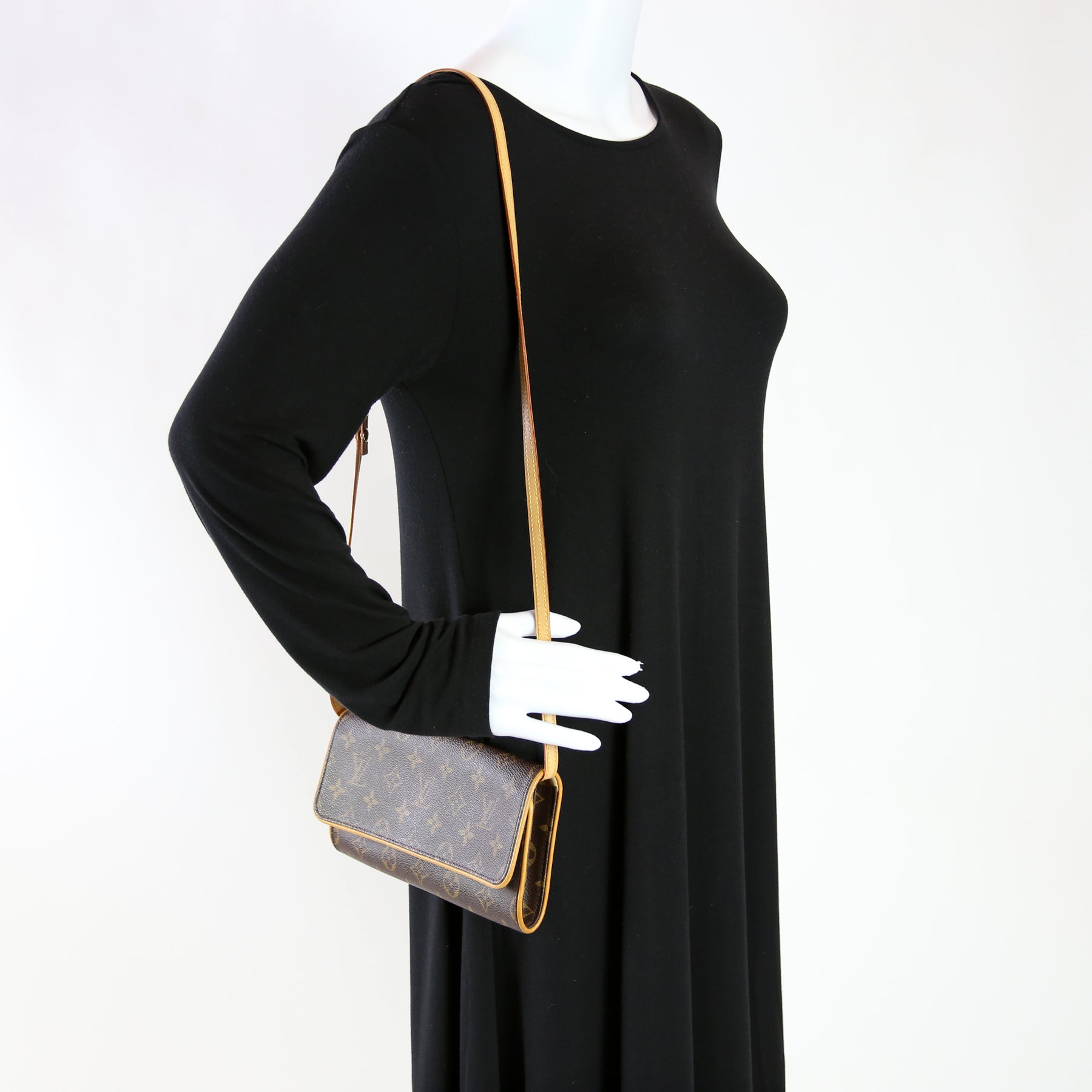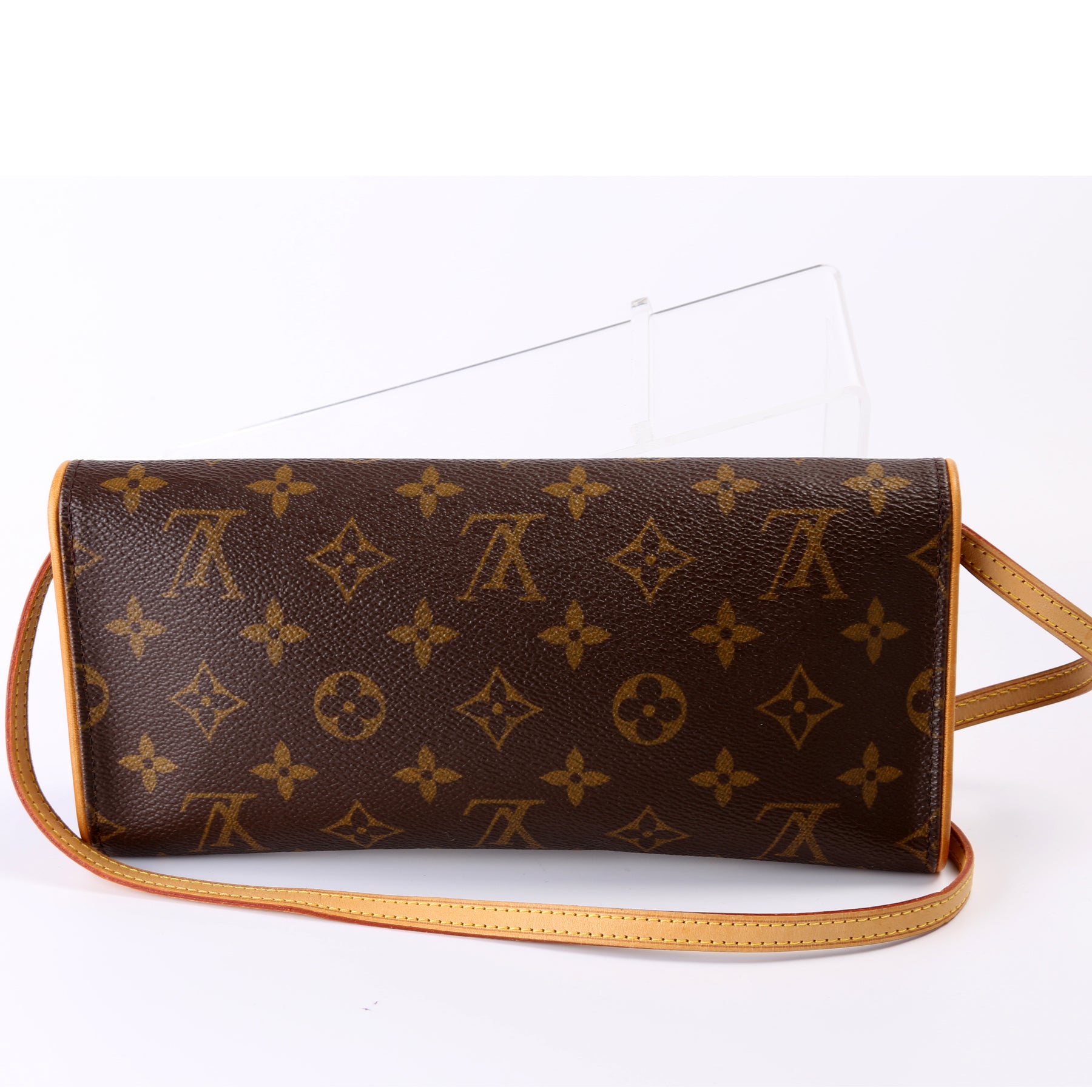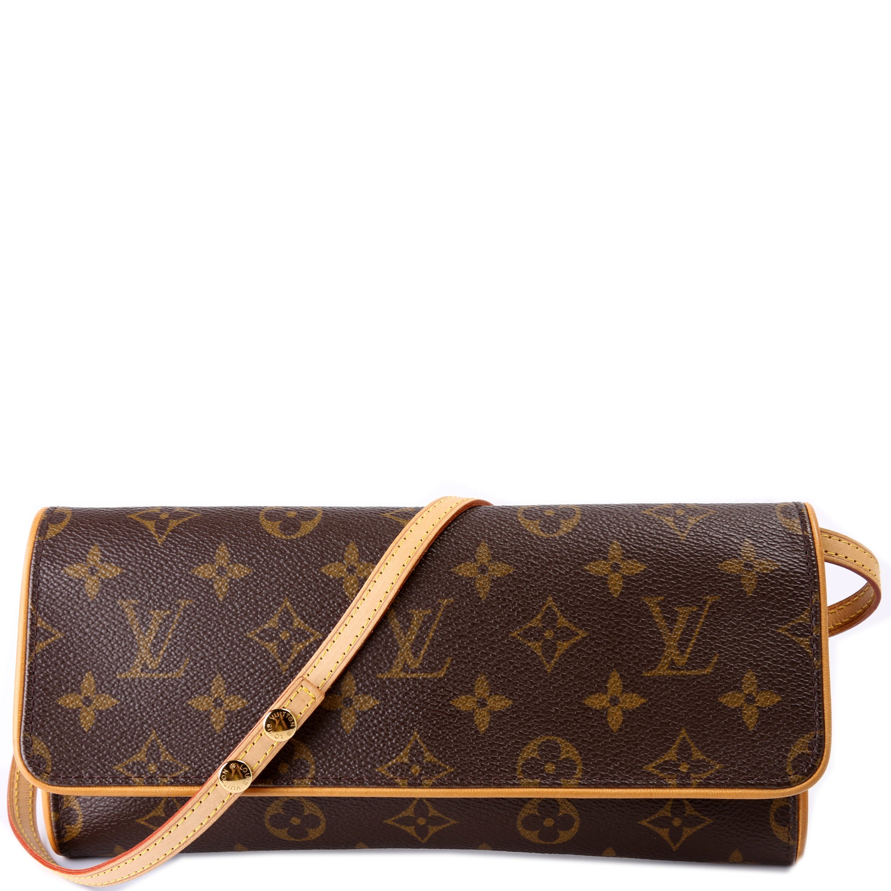 This pre-owned Louis Vuitton Pochette Twin GM is guaranteed 100% authentic. The exterior is in the classic Louis Vuitton Monogram coated canvas.