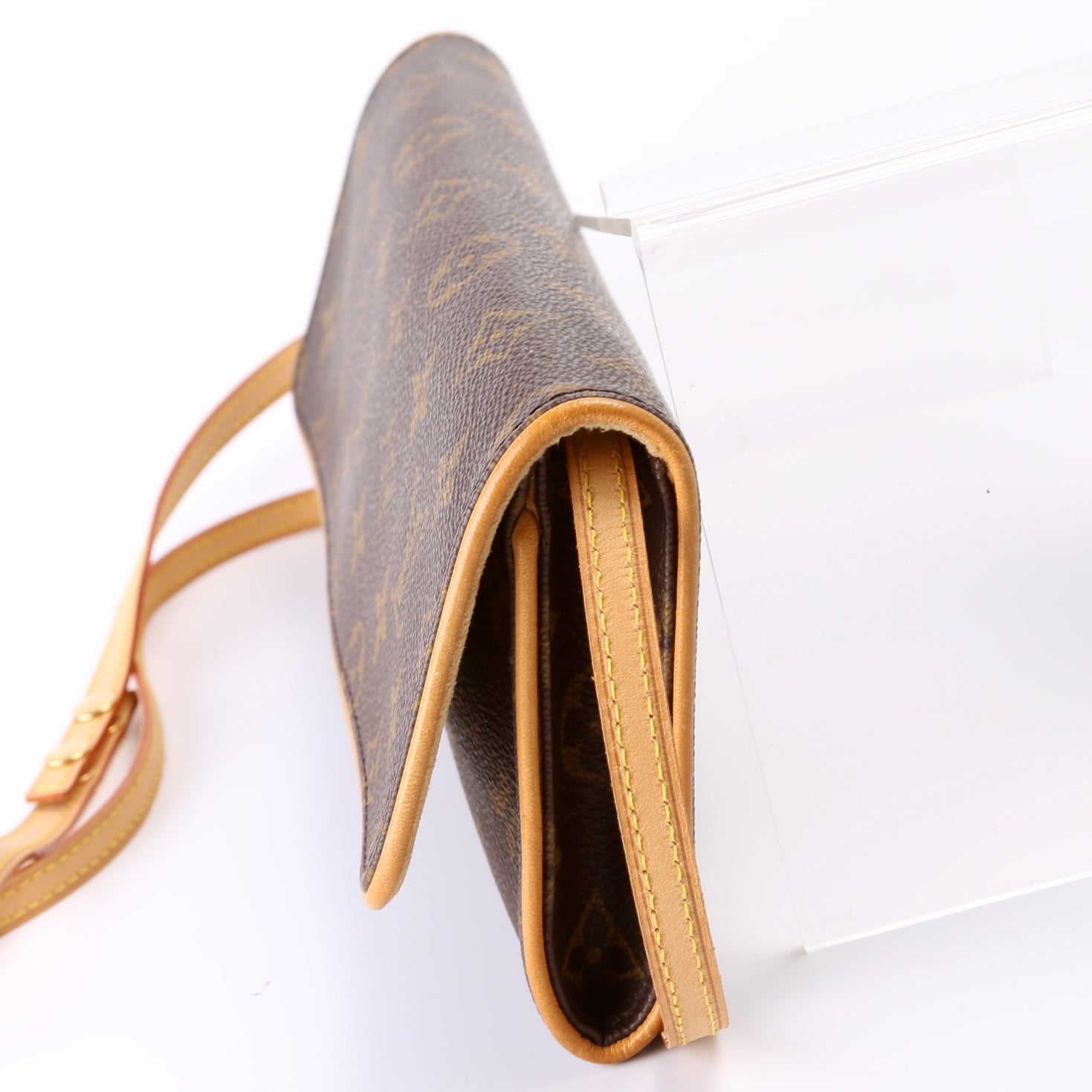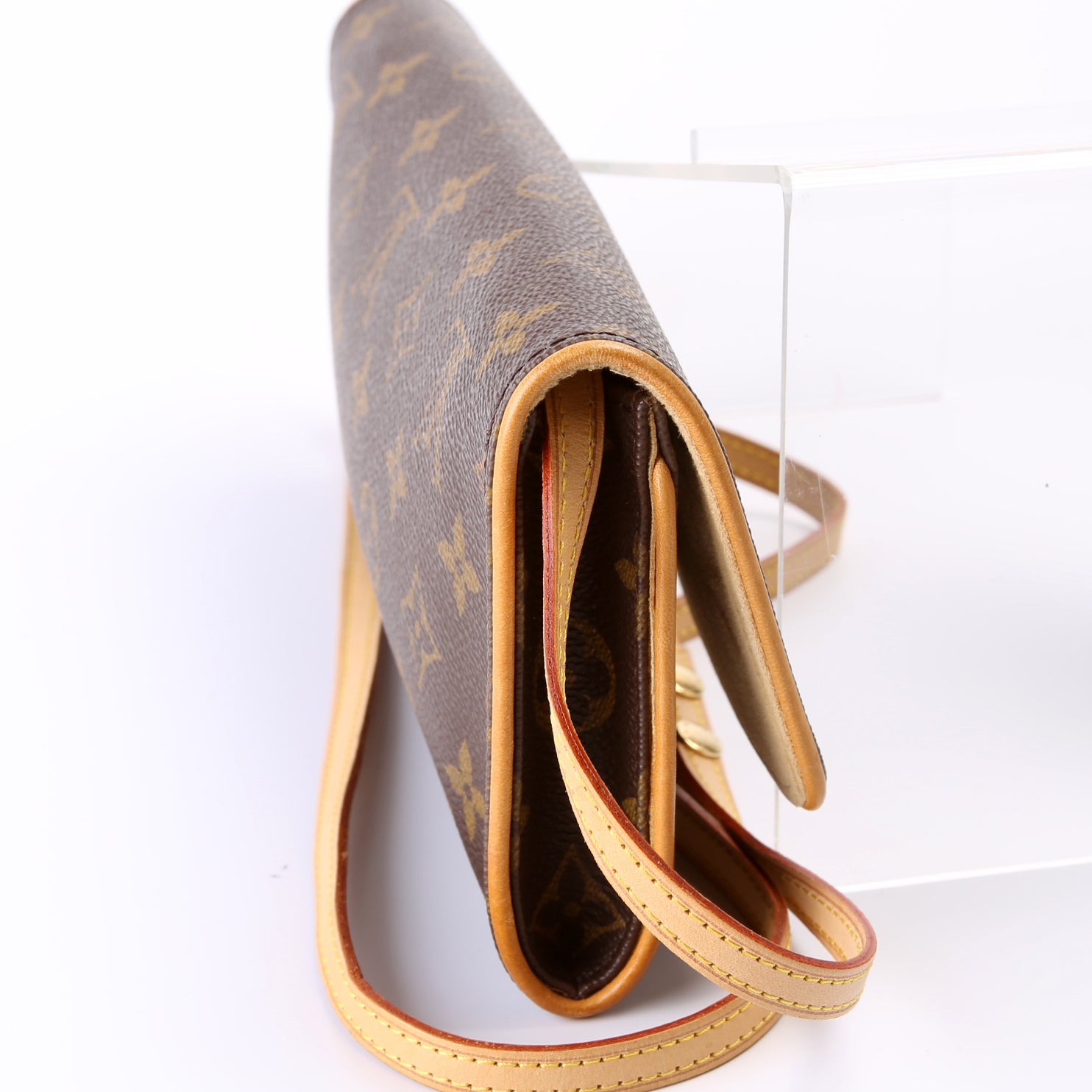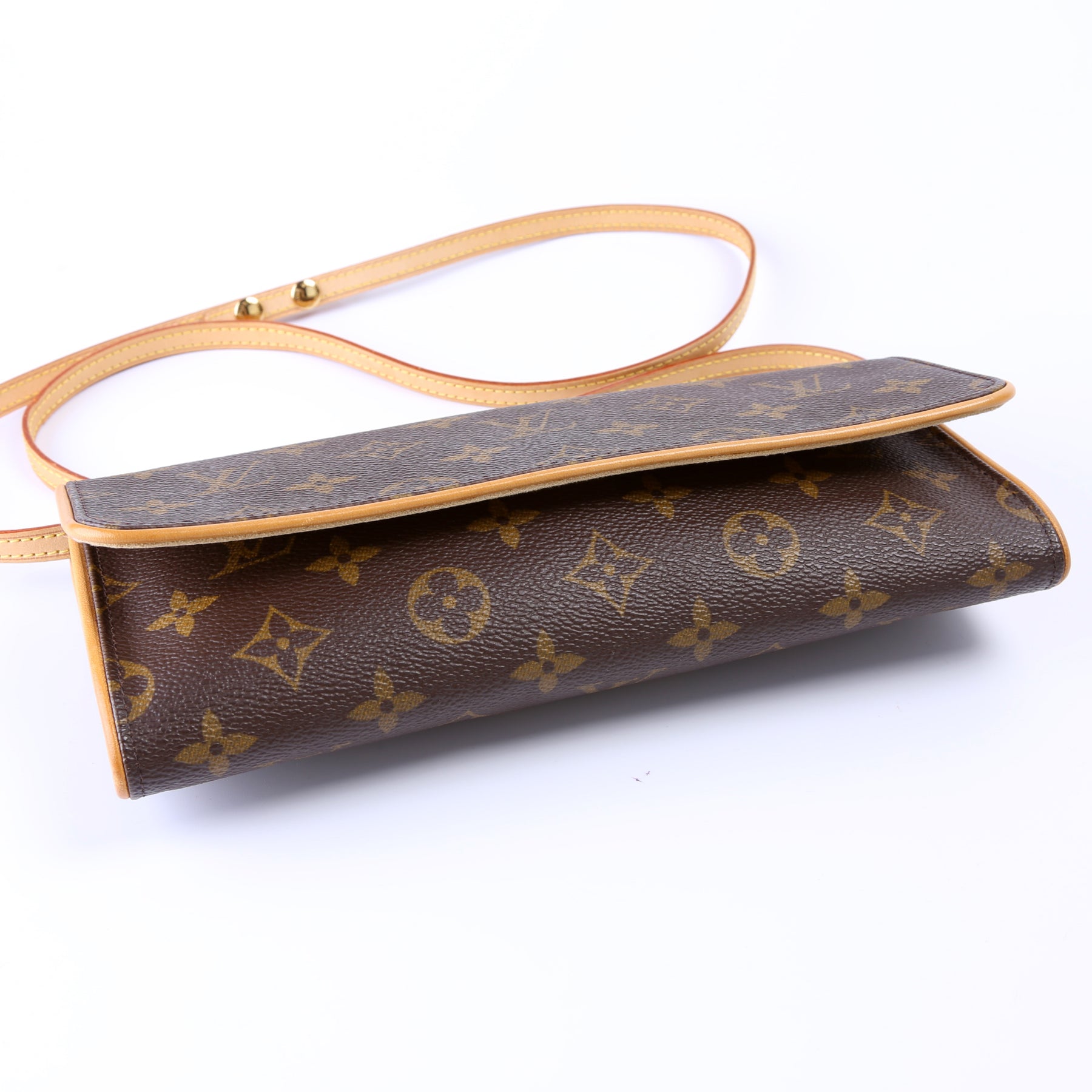 This pre-owned Louis Vuitton Pochette Twin GM is guaranteed 100% authentic. The exterior is in the classic Louis Vuitton Monogram coated canvas.