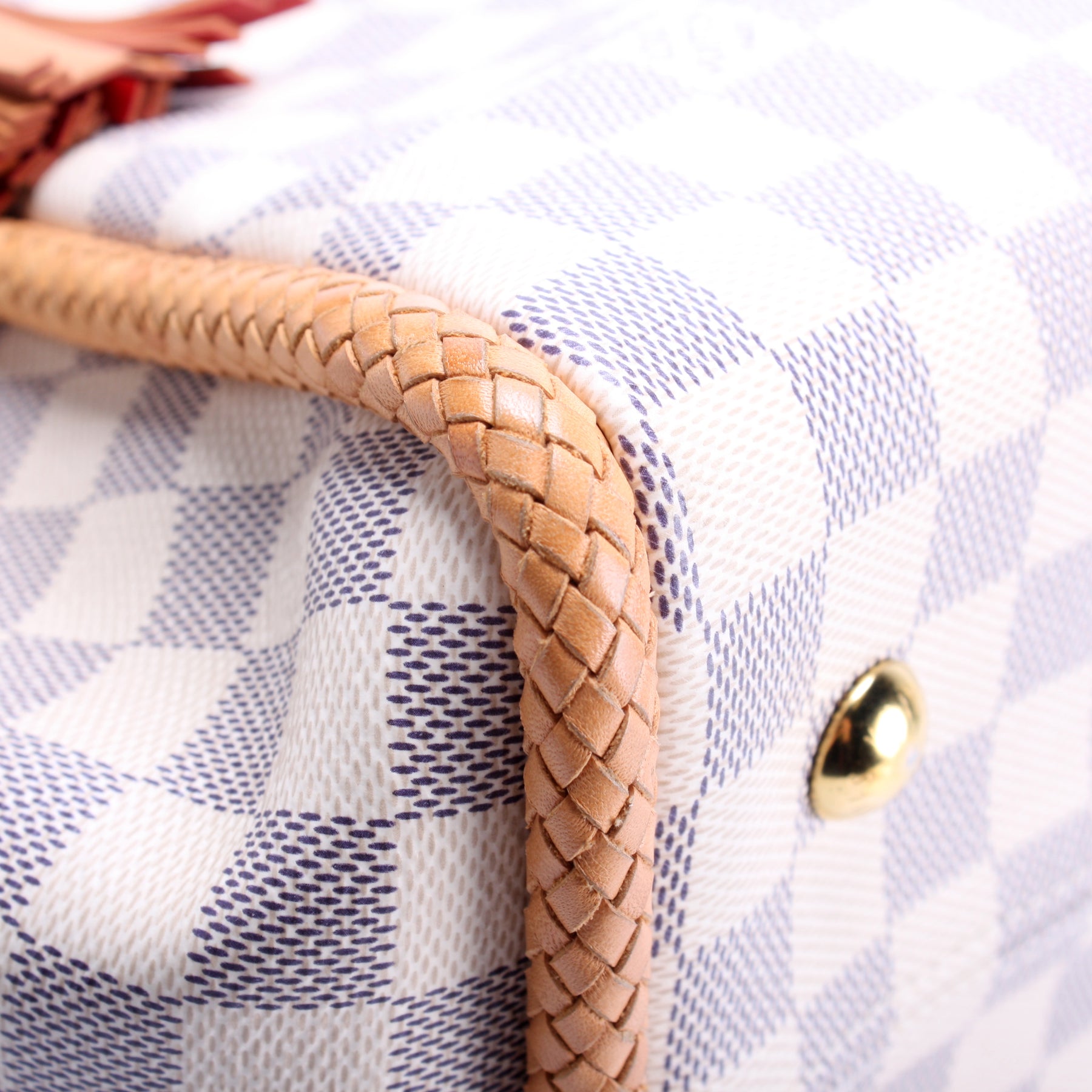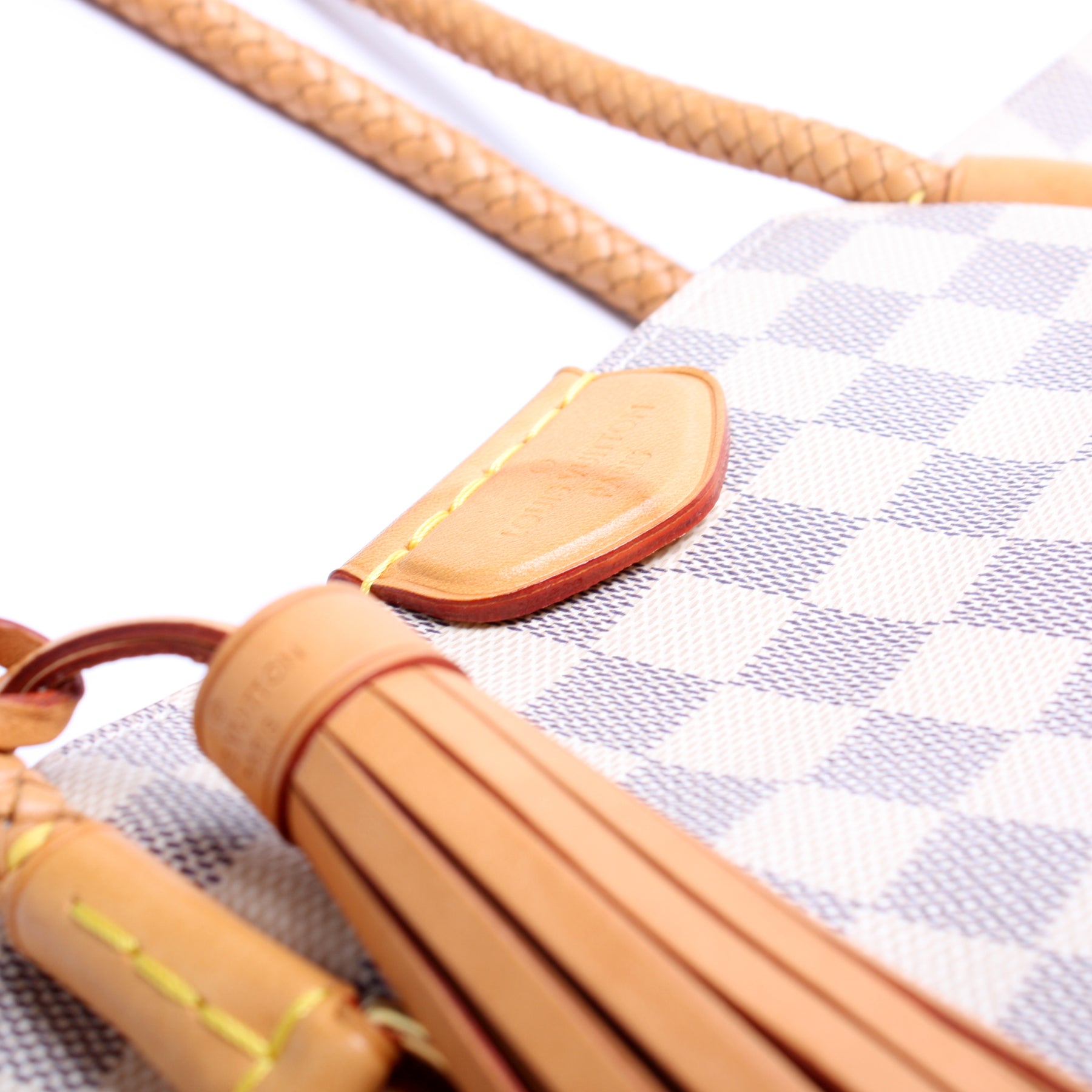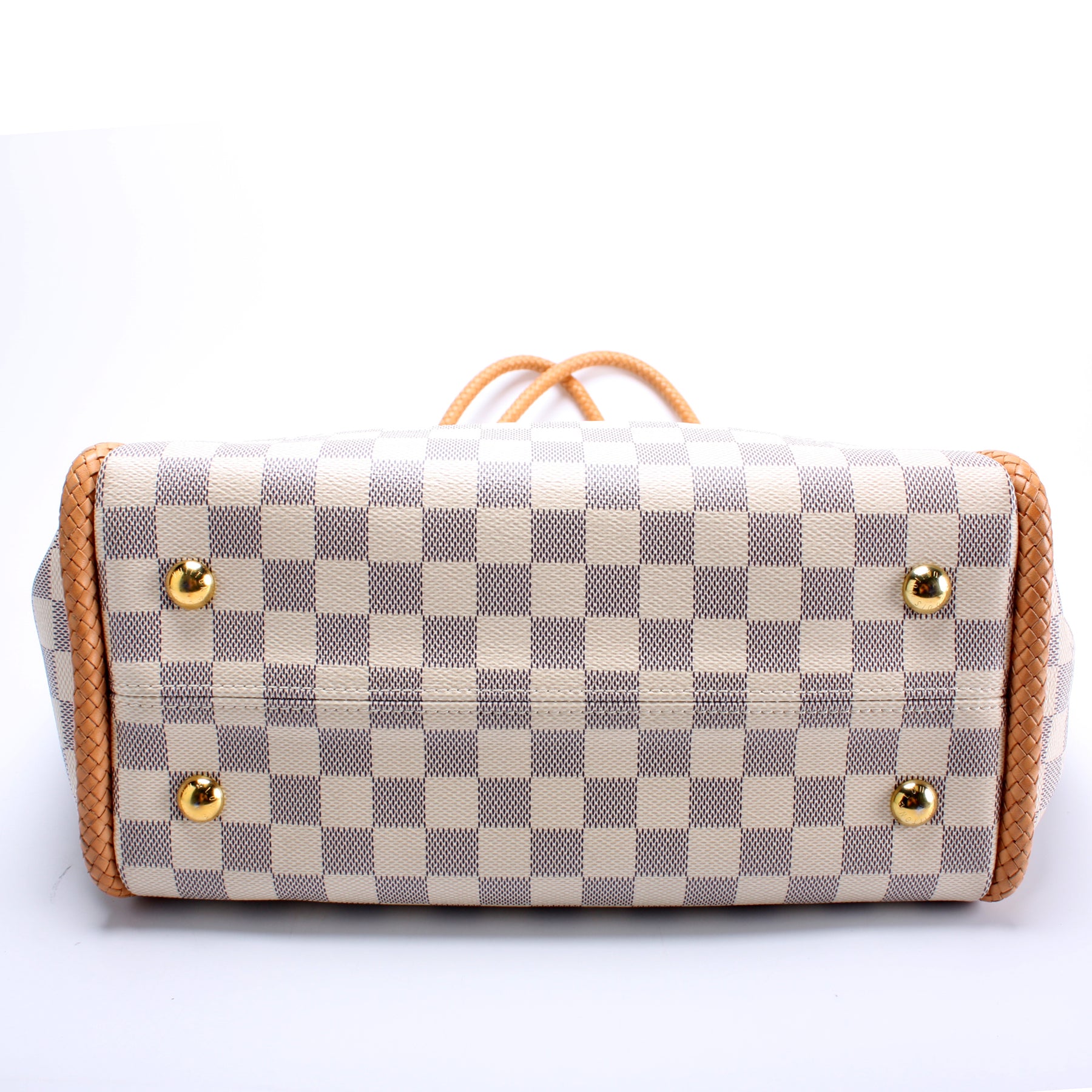 Handle: The leather handles show minor wear and discoloration.