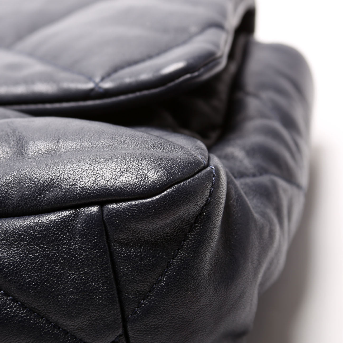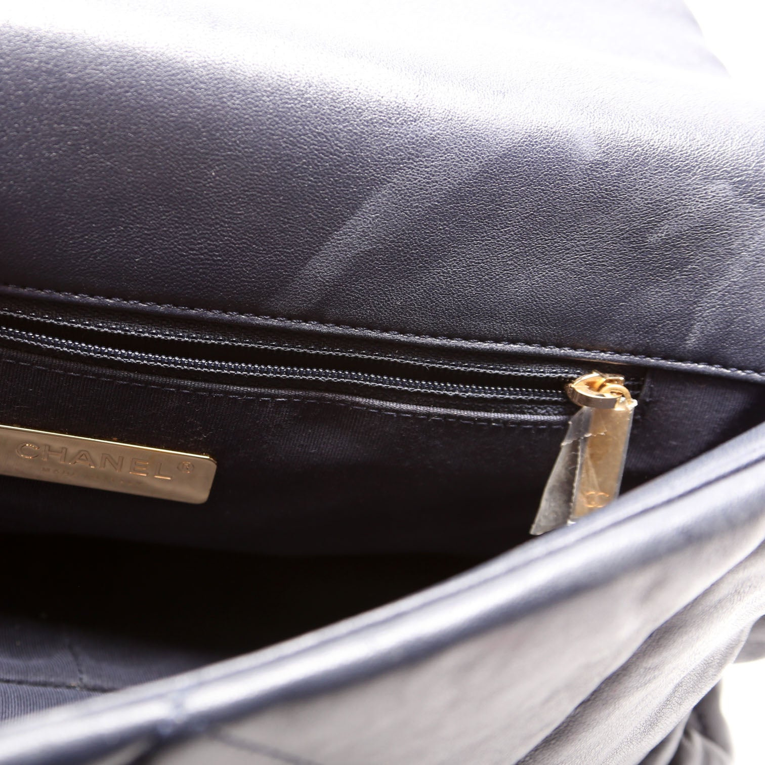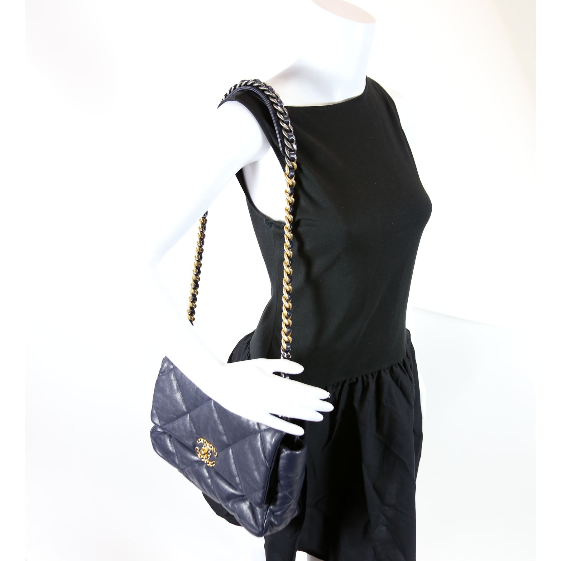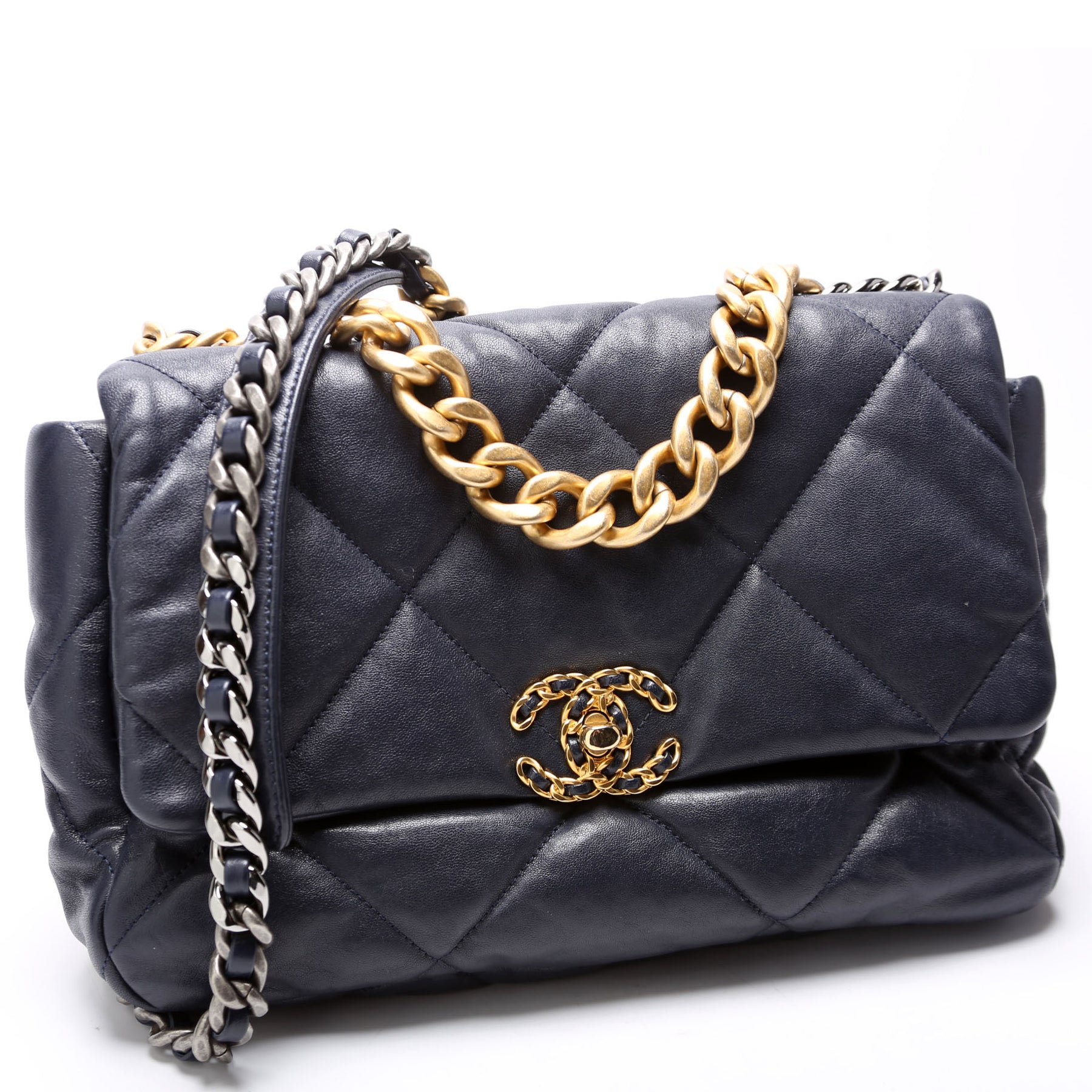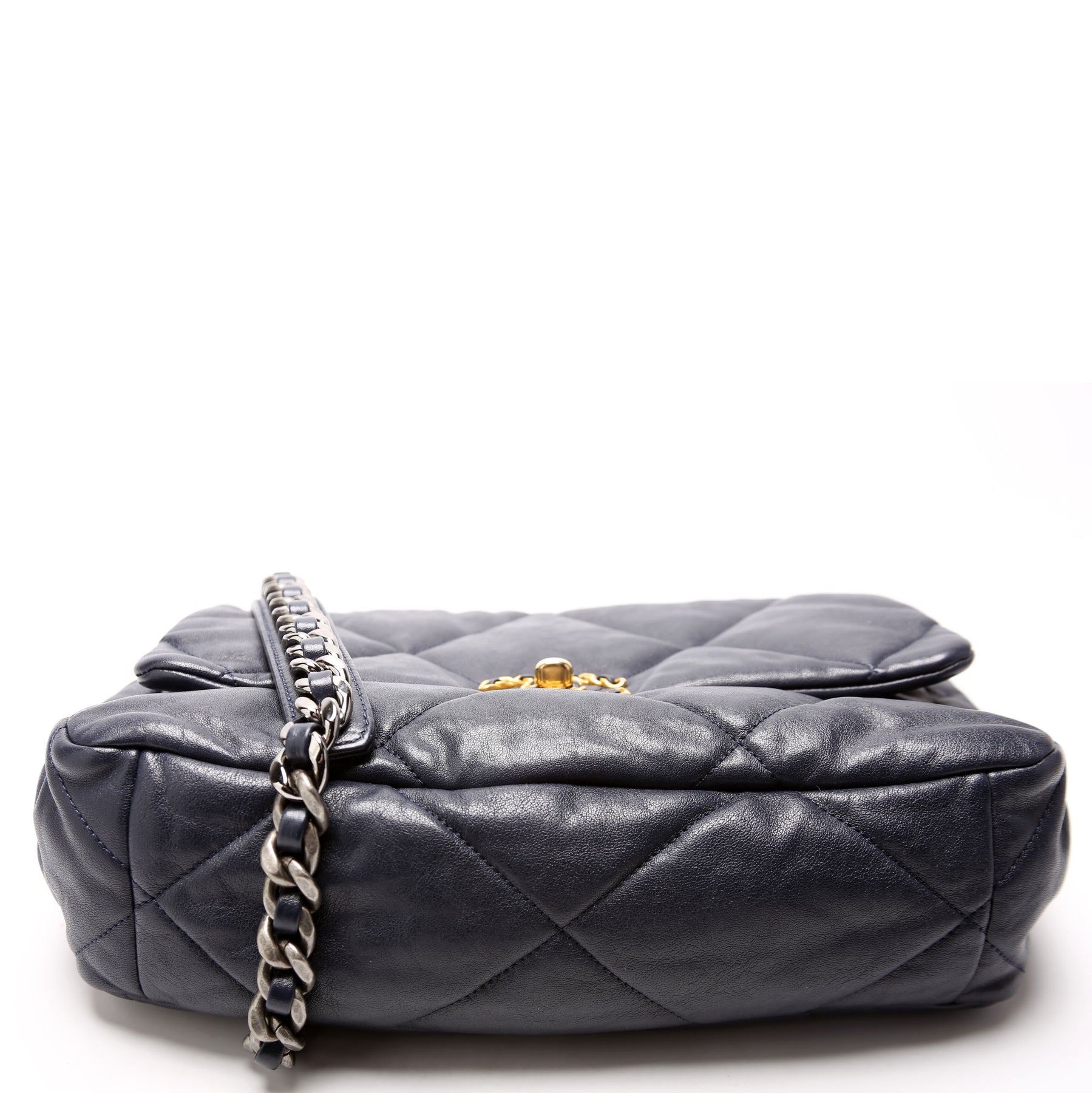 This pre-owned Chanel 19 Large Flap is guaranteed 100% authentic. The exterior is in the classic Chanel Quilted Goatskin leather.