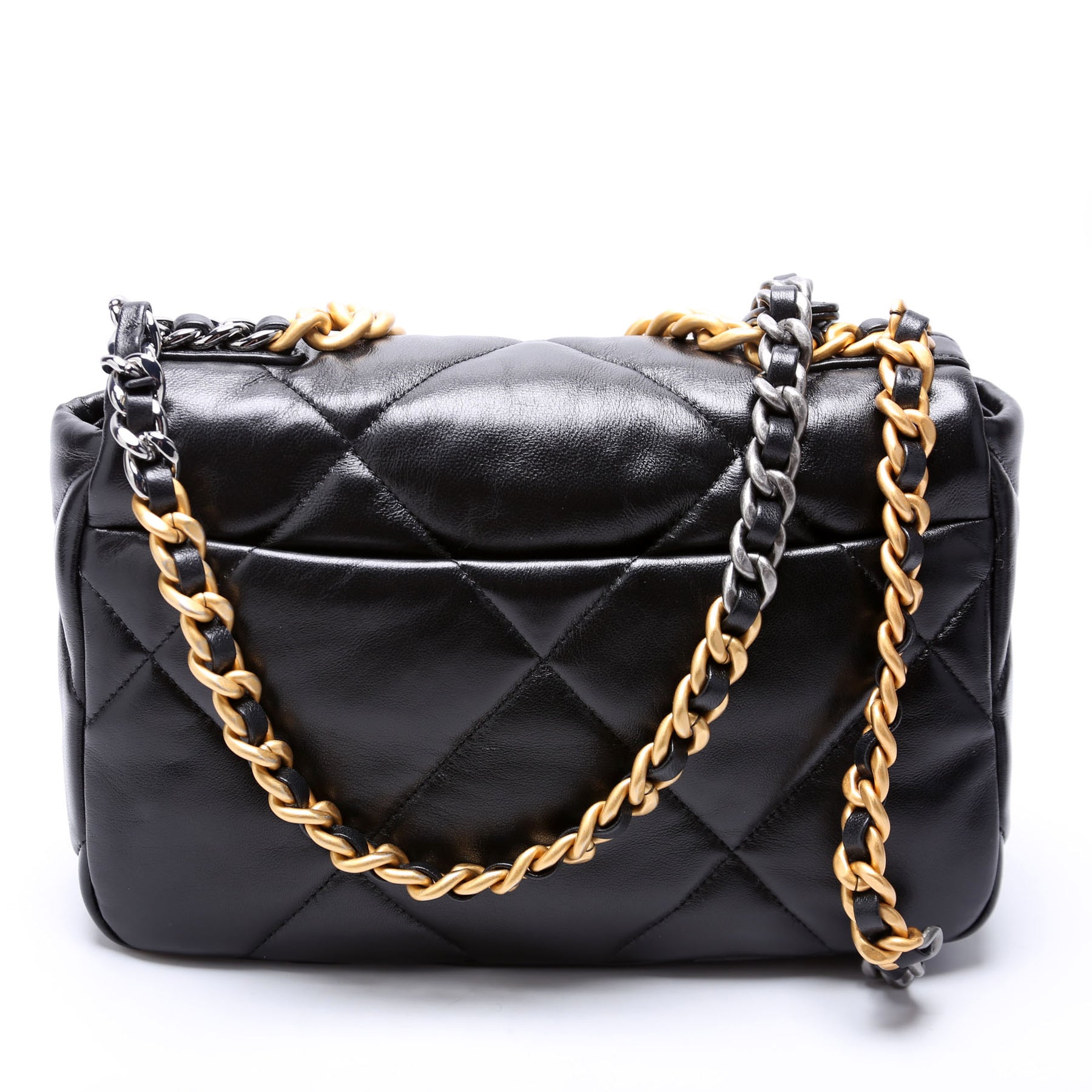 This pre-owned Chanel Chanel 19 Small Flap is guaranteed 100% authentic. The exterior is in the classic Chanel Quilted Lambskin leather.