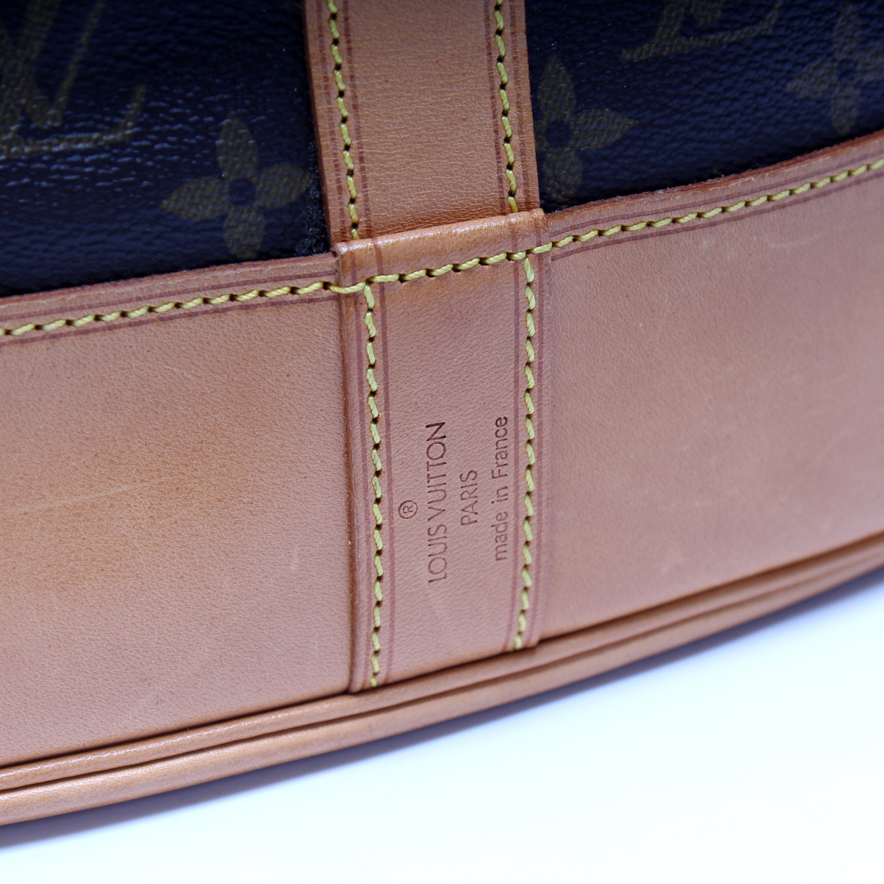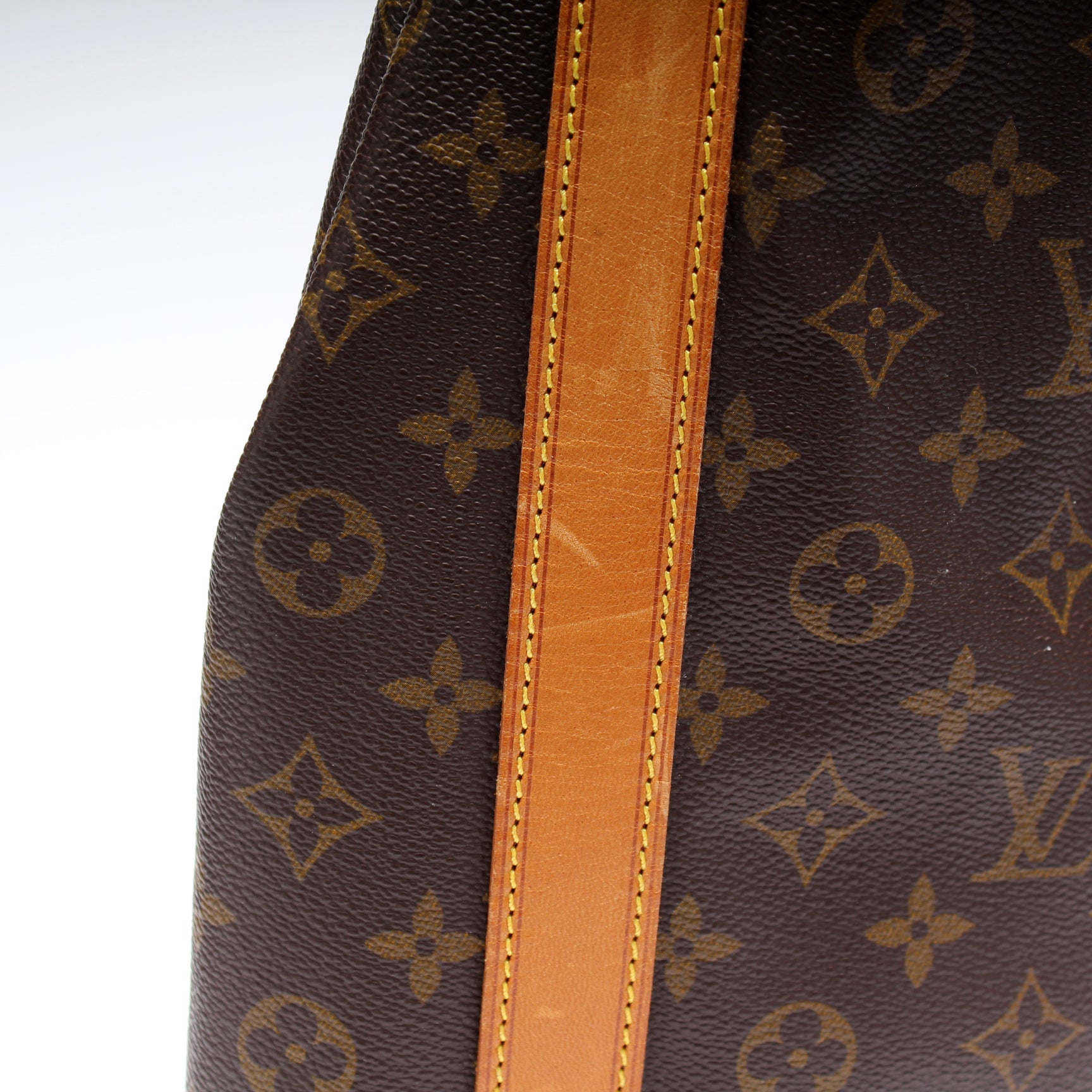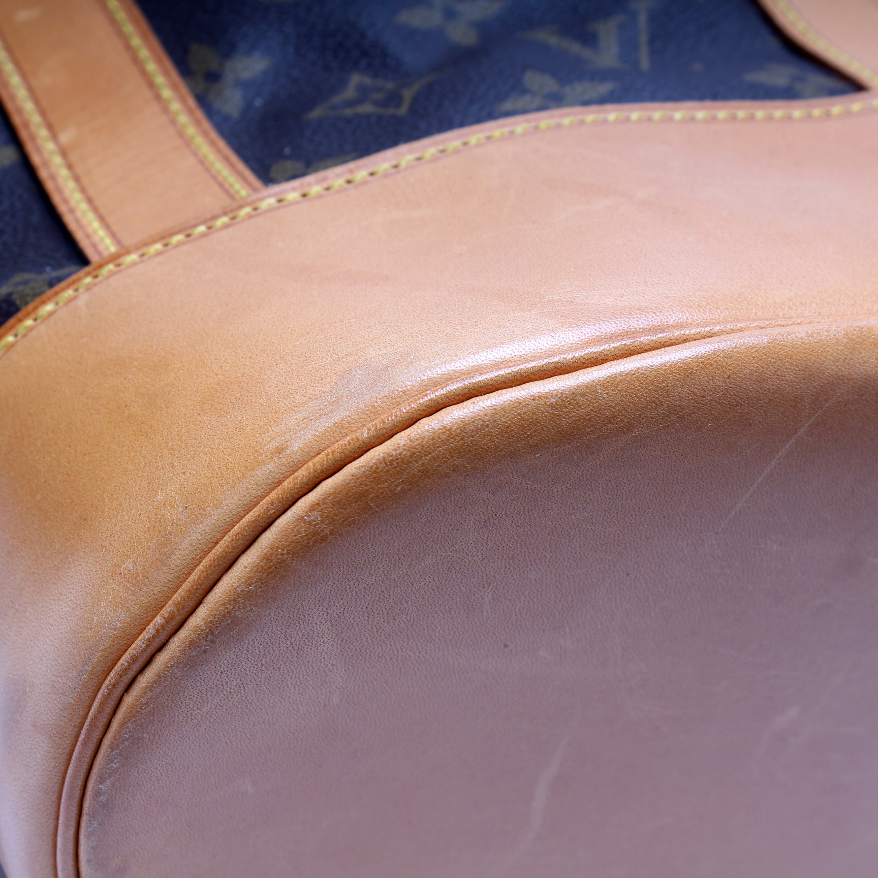Exterior: The exterior coated canvas is free of any rips or cracks. The leather details and base show minor scuffs and discoloration.
